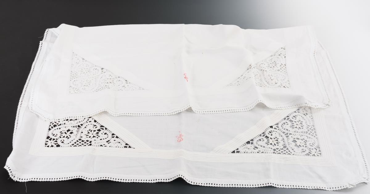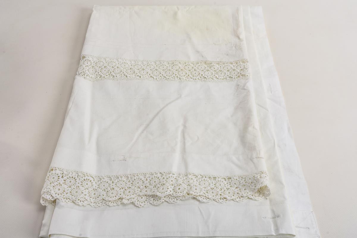 Anknüpfbarer Tagesdeckenbezug mit Häkelborten: 239 x 142 cm. / Baumwolltischdecke mit breiten Häkeleinsätzen und -umrandung: 178 x 153 cm. / Tischdecke aus 2 Teilen genäht, mit geklöppelten Einsätzen und Weißstickereiumrandung, rot/weiß gesticktes Monogramm: 131 x 100 cm. / Leinentischläufer mit aufgenähter Klöppelspitze: 160 x 40 cm. 1x leicht fleckig, Häkeleinsätze mit einigen Defekten.
