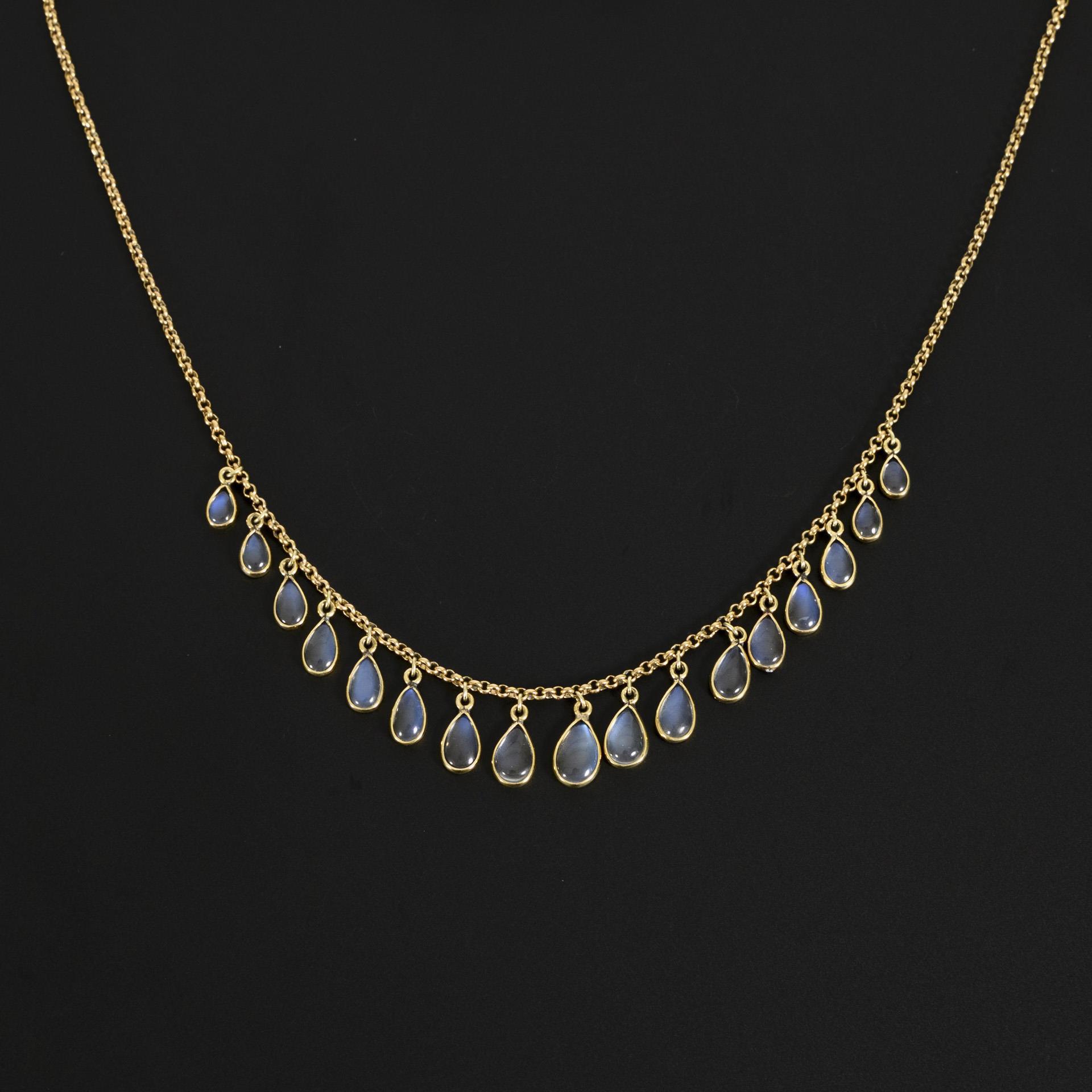 Collier mit Abhängungen aus tropfenförmigen Mondstein-Cabochons im Verlauf. Karabinerverschluss.