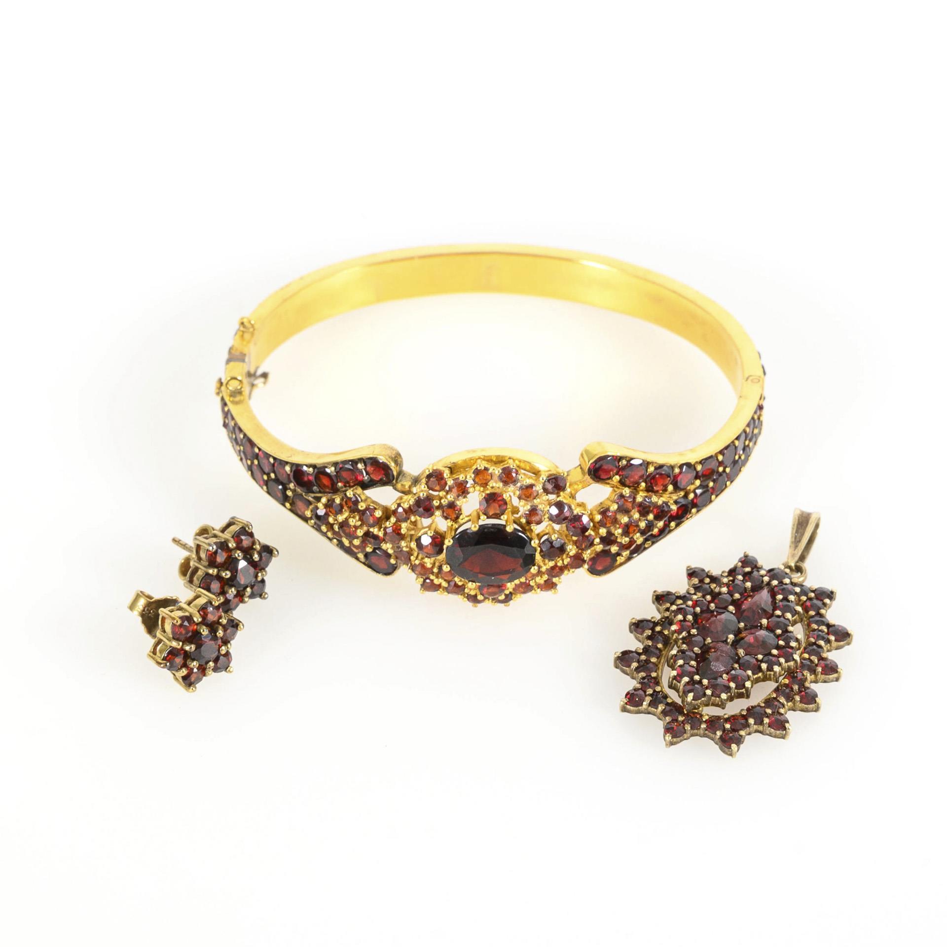 Ensemble aus 3 Teilen modernerem Granatschmuck: ein Armreif, ein ovaler Sternenanhänger, ein paar Ohrringe in Blütenform. Verschluss des Armreifs erneuert, ohne Sicherheitskettchen. Wohl ein Stein wiedereingesetzt.