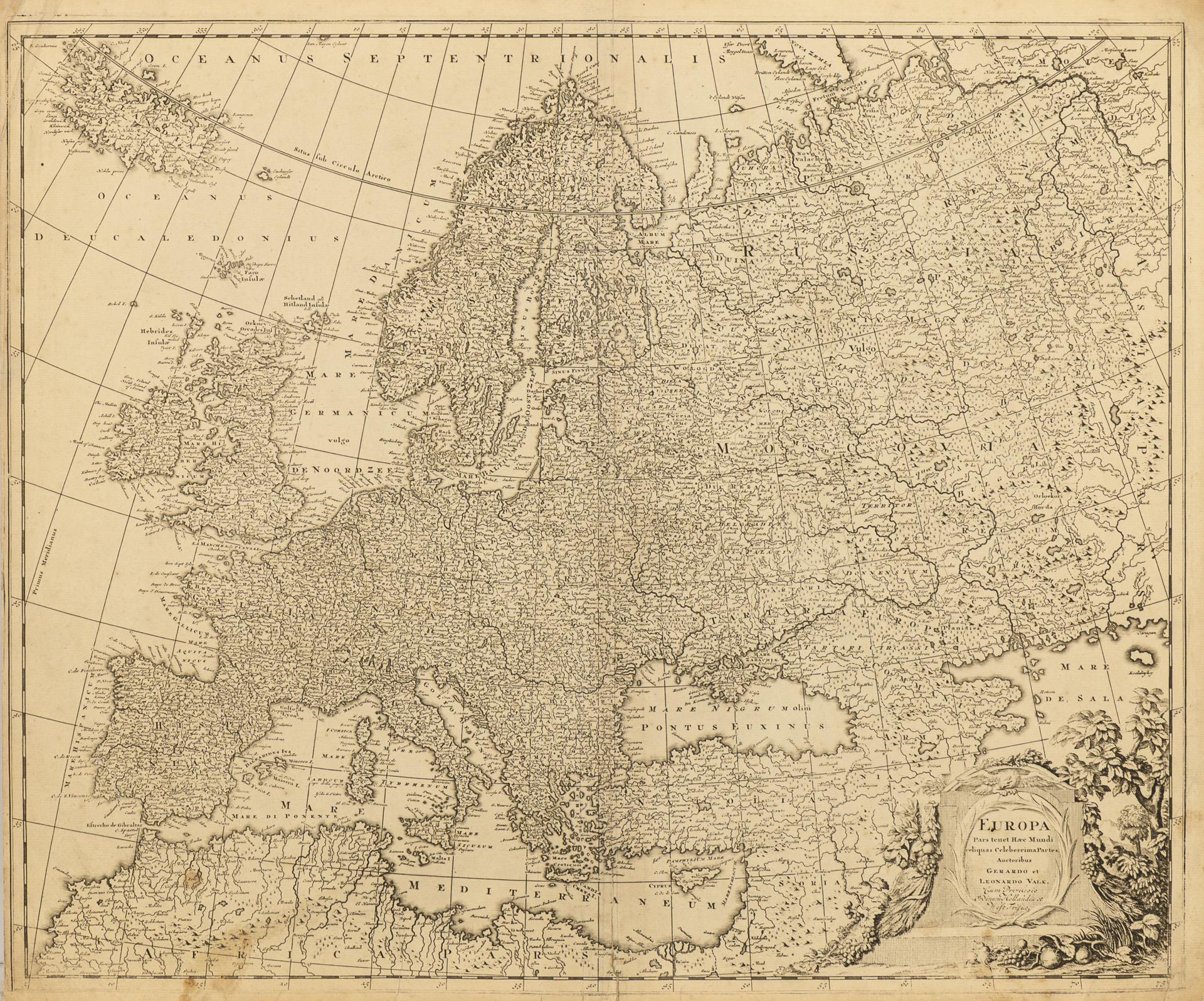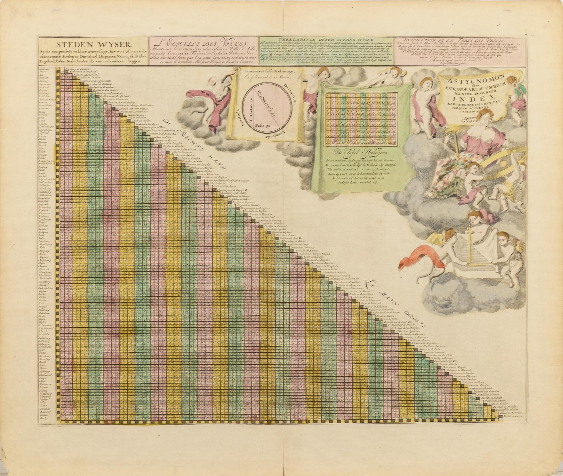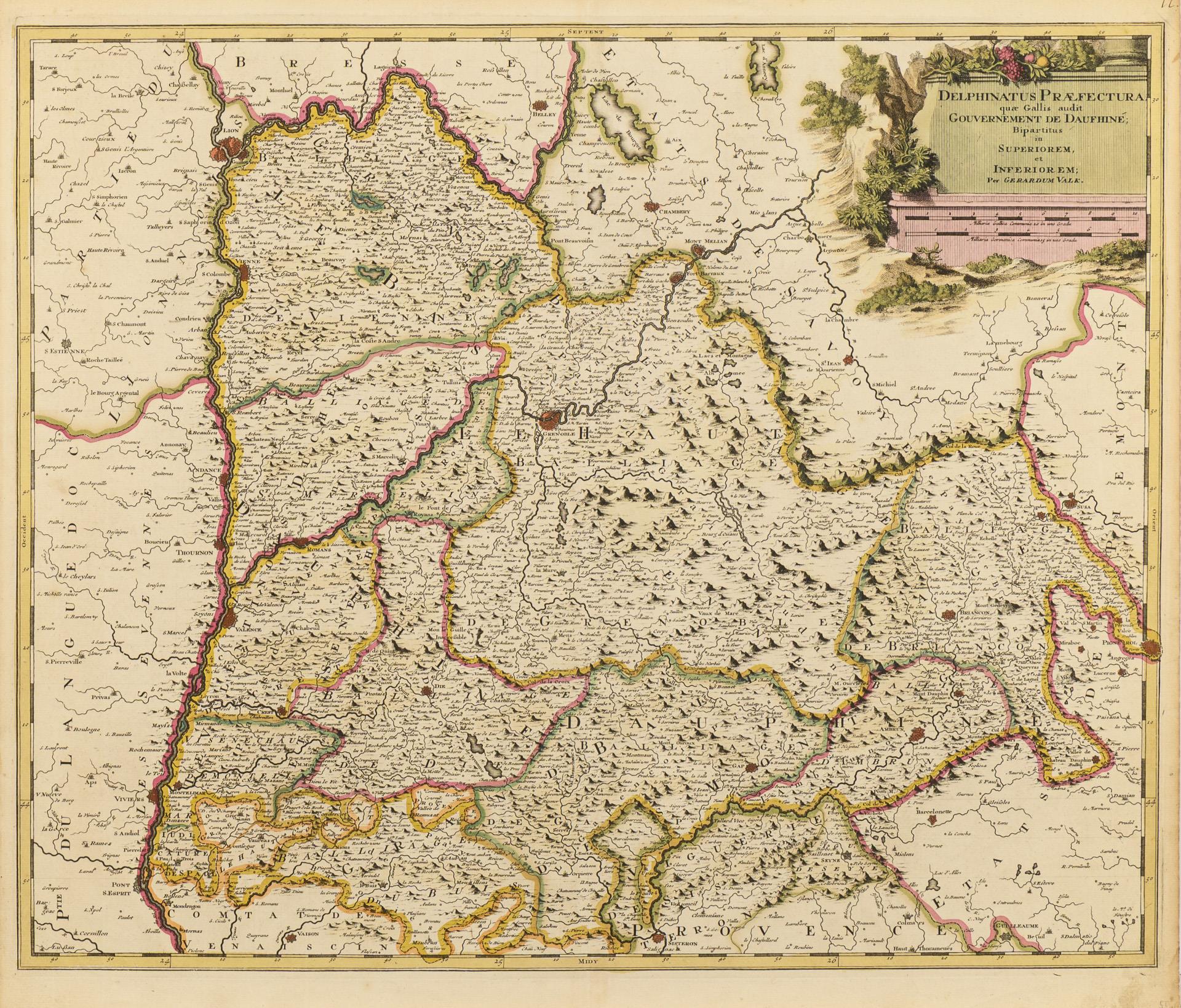 9 Landkarten des Barock, teils mit rückseitigen Nummerierungen, sowie eine Tafel mit pythagoräischer Rechenhilfe zur Ermittlung der Reisedauer zwischen verschiedenen Städten Europas. Alle laut Bezeichnung vom Amsterdamer Graveur und Drucker Gerard Valck stammend. In einer schweren, modernen Mappe mit Leinwanddruck einer Weltkarte Valcks sowie einem Verweis auf das Verlagshaus Falk in Hamburg. Karten mit Mittelfalz, teilweise mit kleinen Einrissen entlang des Falzes, 2 mit Resten von Klebereperaturen.