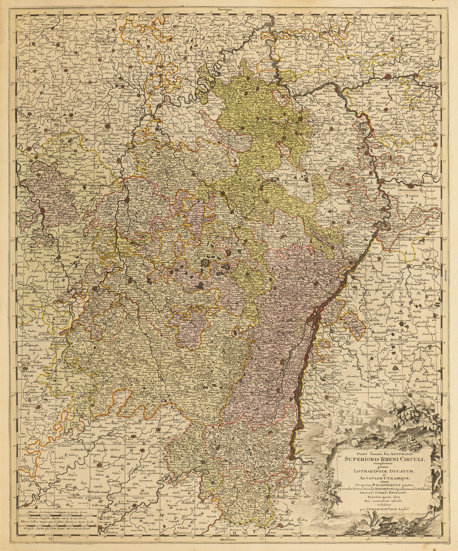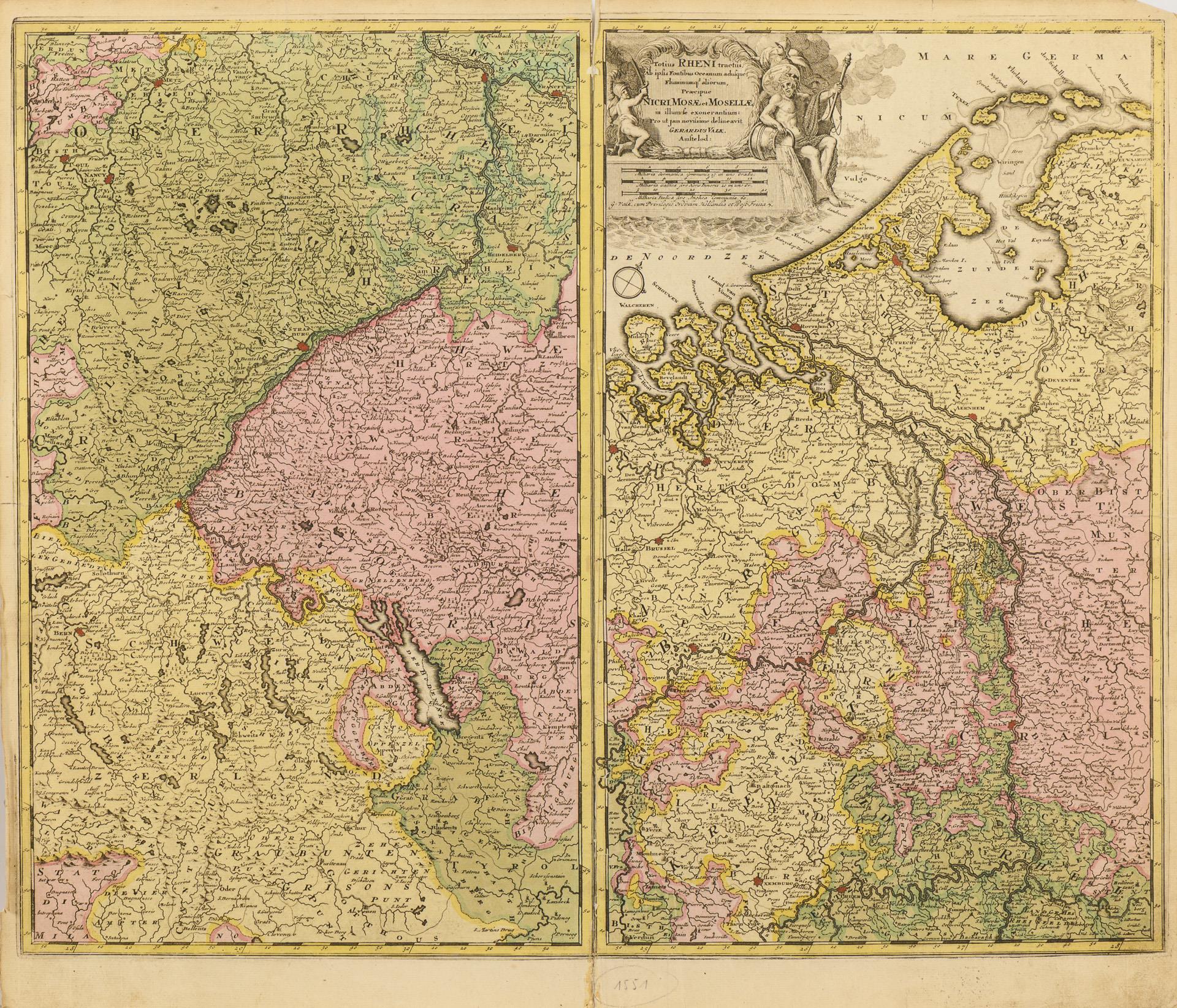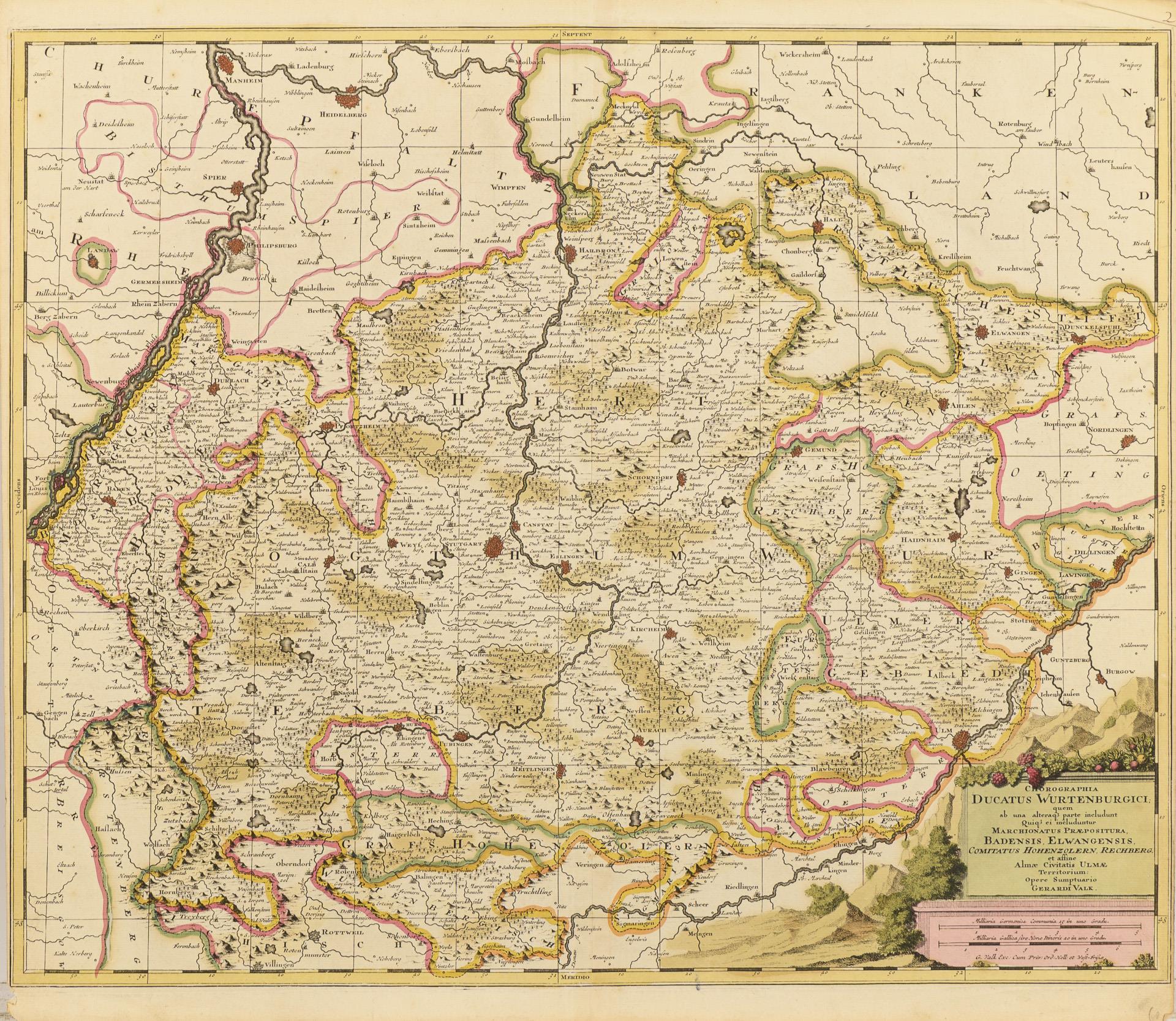 9 Landkarten des Barock, teils mit rückseitigen Nummerierungen, sowie eine Tafel mit pythagoräischer Rechenhilfe zur Ermittlung der Reisedauer zwischen verschiedenen Städten Europas. Alle laut Bezeichnung vom Amsterdamer Graveur und Drucker Gerard Valck stammend. In einer schweren, modernen Mappe mit Leinwanddruck einer Weltkarte Valcks sowie einem Verweis auf das Verlagshaus Falk in Hamburg. Karten mit Mittelfalz, teilweise mit kleinen Einrissen entlang des Falzes, 2 mit Resten von Klebereperaturen.