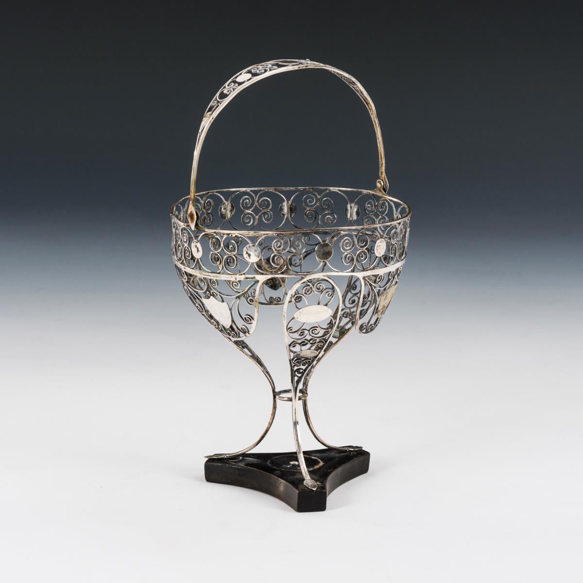 Rundes Henkelkörbchen auf 3 Füßen und 3-passiger Plinthe. Glaseinsatz fehlt. Altersspuren.