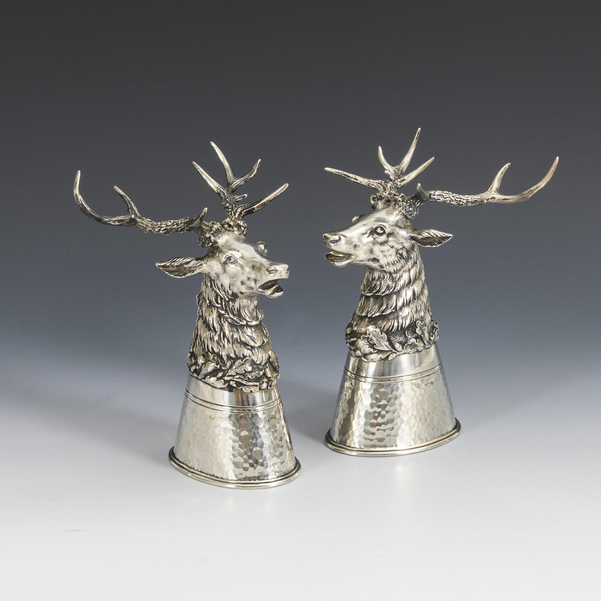 Schwere, qualitätvoll gearbeitete Becher mit Hirschkopf und Geweih. 1 Becher mit kleinen Dellen an der Wandung.