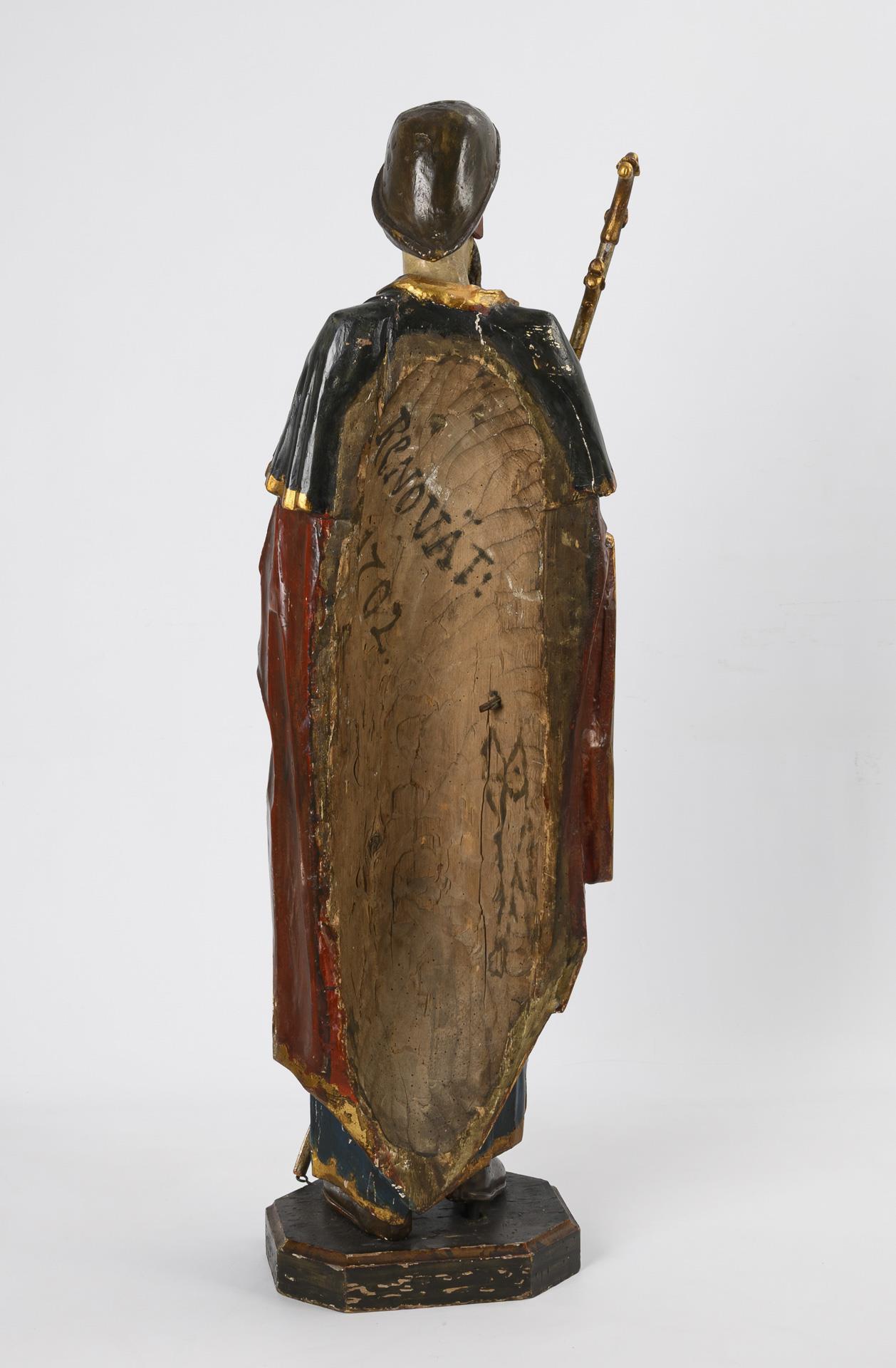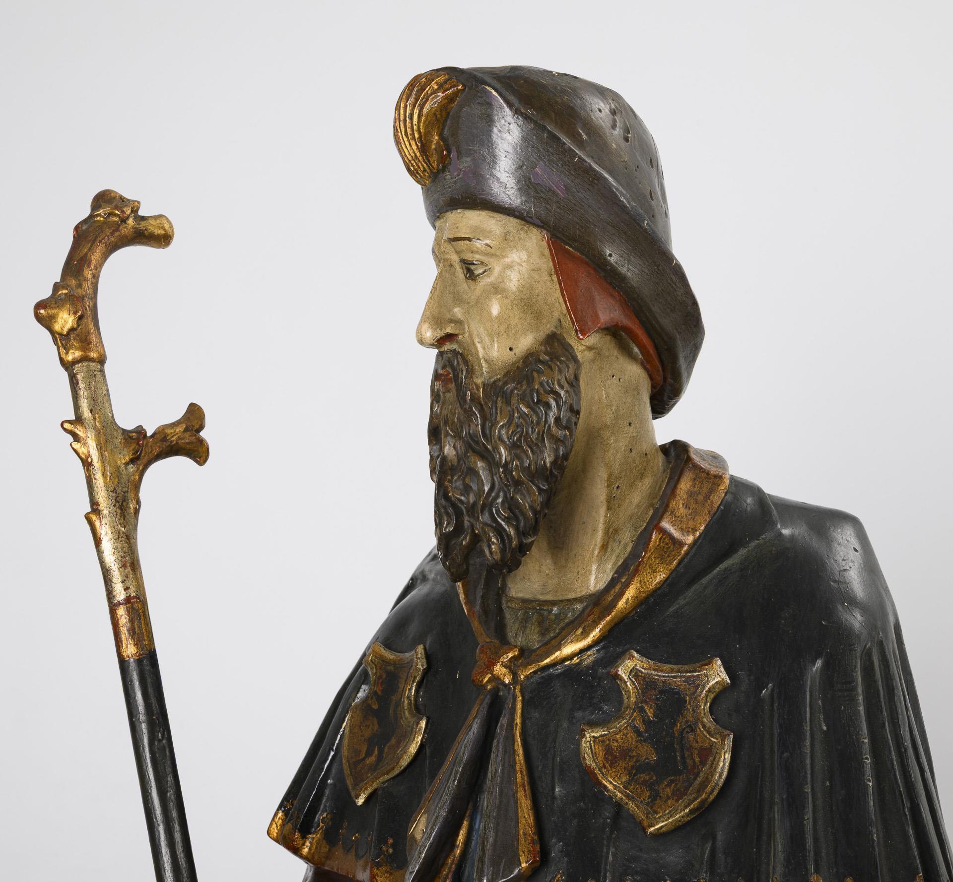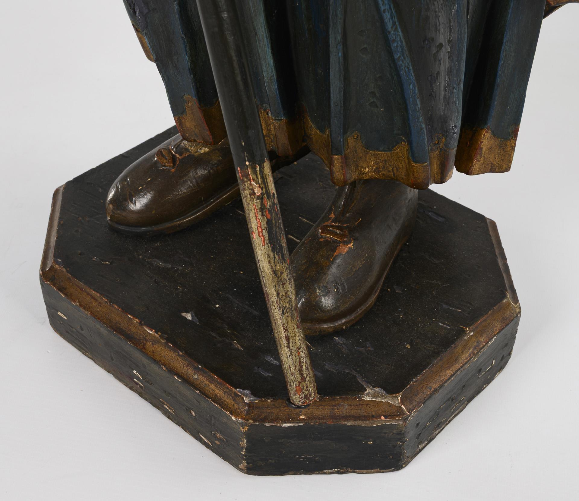 Der stehende Heilige im faltenreichen Gewand mit Wappenschildern auf der Brust und Jacobsmuschel am Pilgerhut sowie mit Stab in der Hand. Jünger gefasst, leichte Fasungsschäden, einige Anobienspuren.