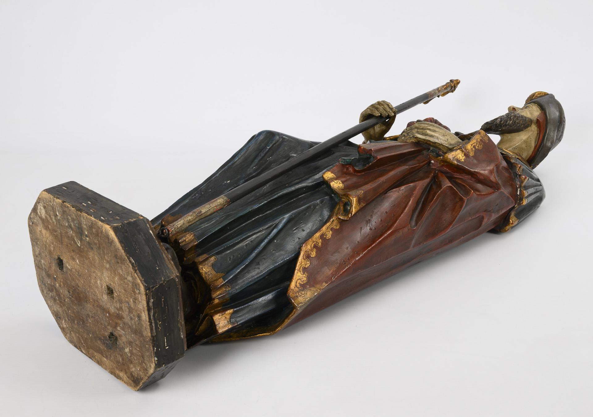 Lindenholz rückseitig gehöhlt, jünger polychrom gefasst. 17. oder 19. Jh. In der Höhlung Schriftzug "RENOVÄT: 1702" sowie gemalte Fische. H 98 cm. 11,3 kg.