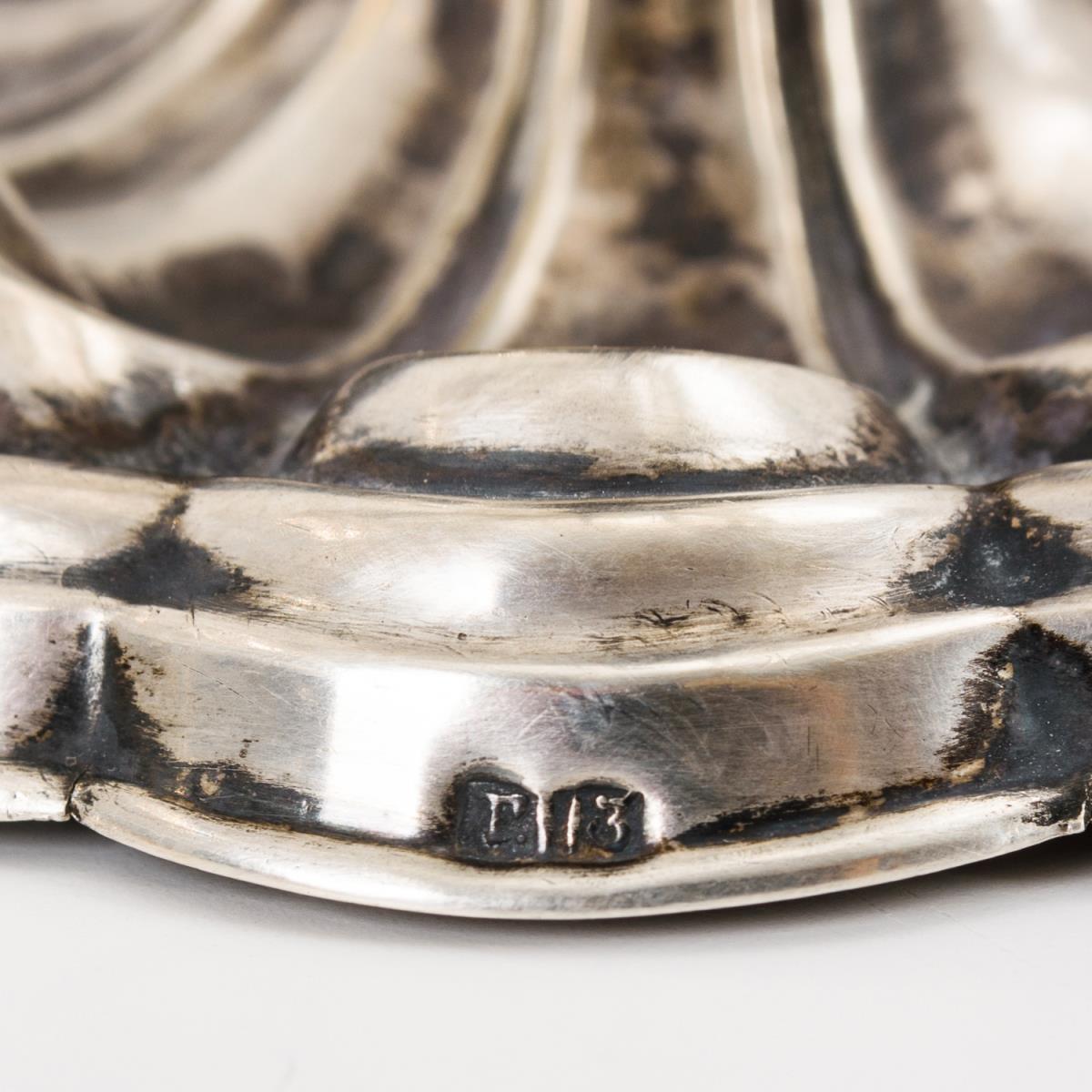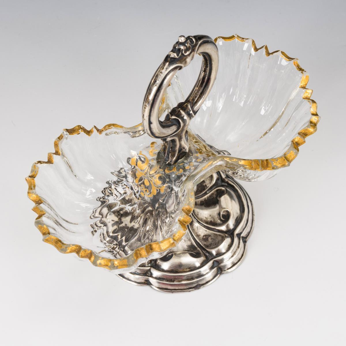 Muschelförmige Doppelschale mit Goldrand und Silbermontierung. Gold minimal berieben, winzige Bestoßungen am Glasrand, Silberfuß mit kleinem Riss und Lötstellen.