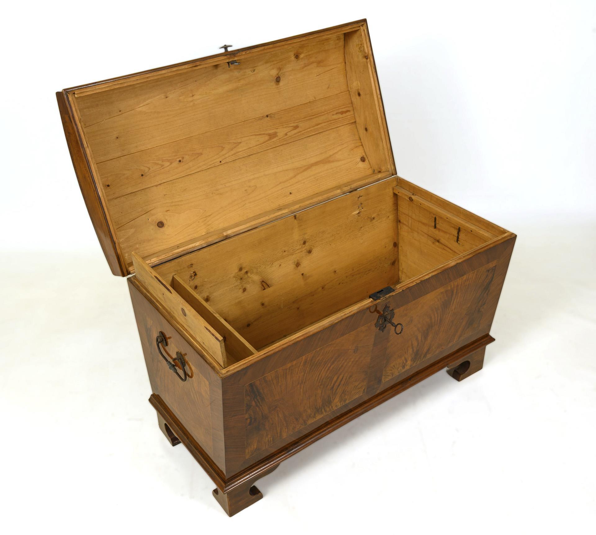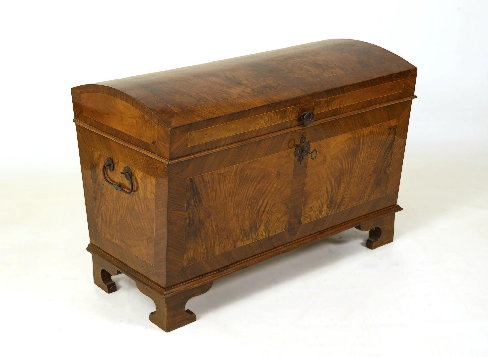 Gewölbter, klappbarer Scharnierdeckel, schauseitig Scheinkassettierungen, rückseitig unfurniert, auf 4 geschweiften Füßen. Knauf, Beschläge, seitliche Bügelgriffe und Schloss aus Eisen. Innen eine Beilade mit Klappdeckel. Restauriert, mit Ergänzungen. Leichte Alters- und Gebrauchsspuren, partiell leichte Furnierdefekte und Risse.