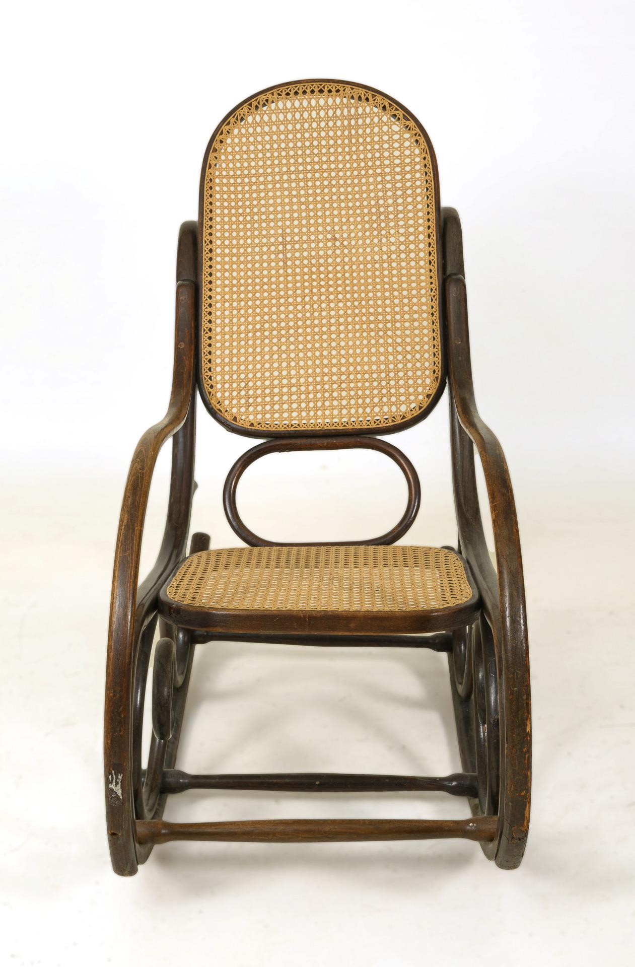 Elegante Form im Zeitgeschmack des Jugendstils, mit Bogensegmenten und gerollten Abschlüssen. Gebogene Kufen mit gerader Querverstrebung. Lehne und Sitz mit Wiener Geflecht. Alters- und Gebrauchsspuren, 1 Bogensegment angebrochen, partiell Risse und Kerbspuren. Restauriert, mit Ergänzungen. 1 Querstrebe ergänzt.