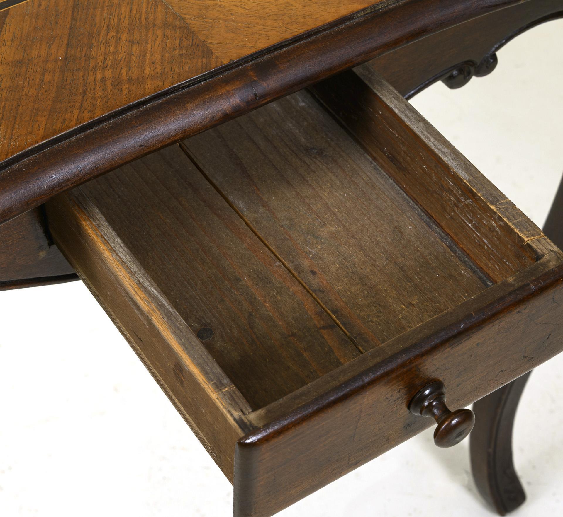 Quadratische Deckplatte mit geschweift geschnittenen Kanten und gerundeten Ecken, auf geschwungener Zarge mit 4 kleinen Schüben und volutenbeschnitzter Profilkante, auf 4 s-förmig gebogten Beinen mit Blumenschnitzereien. Deckplatte verziert mit Würfelmarketerie und Akanthusblattwerk, gerahmt von dunklen Band- und hellen Fadeneinlagen. Restauriert, leichte Gebrauchsspuren, an den Kanten rissig.