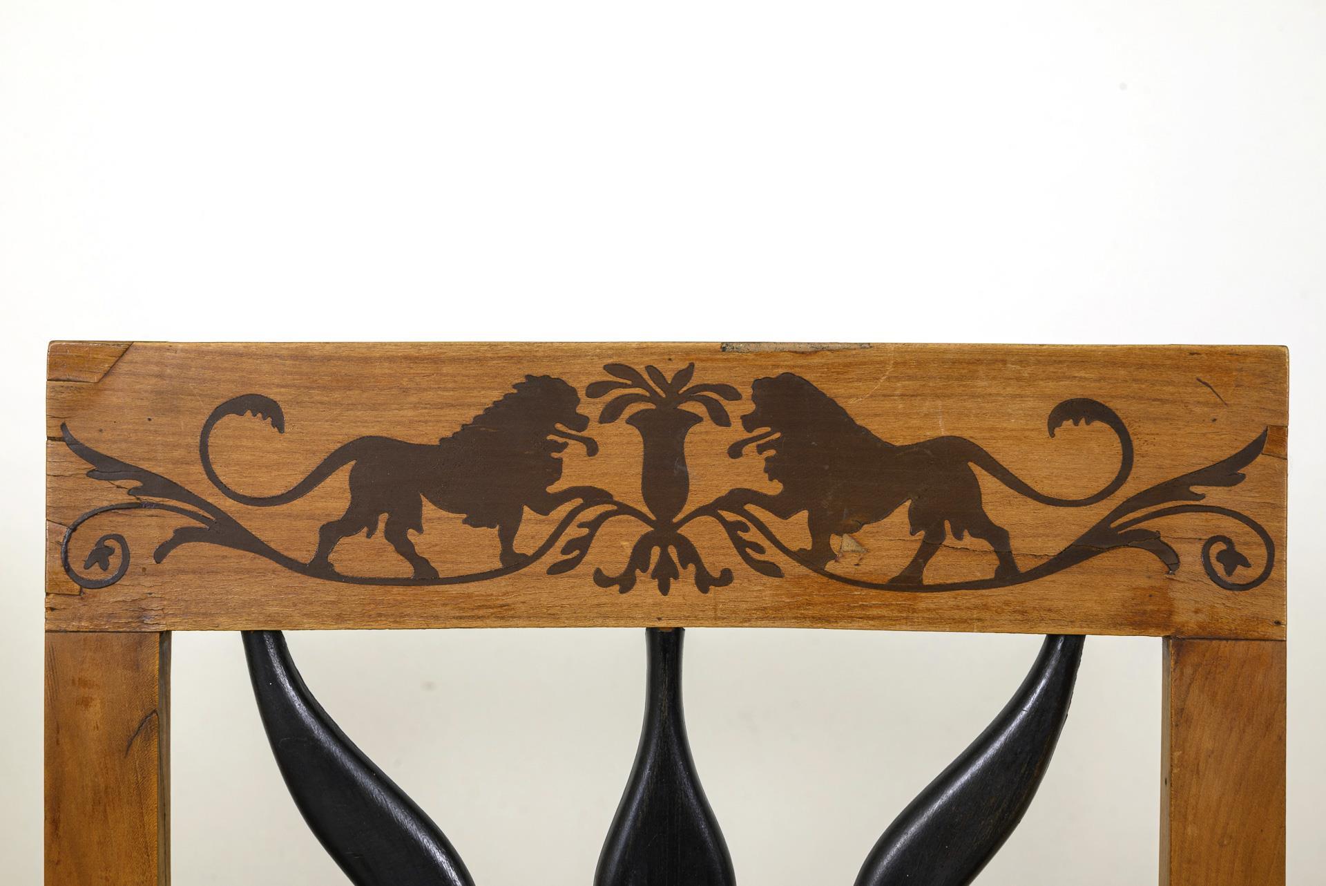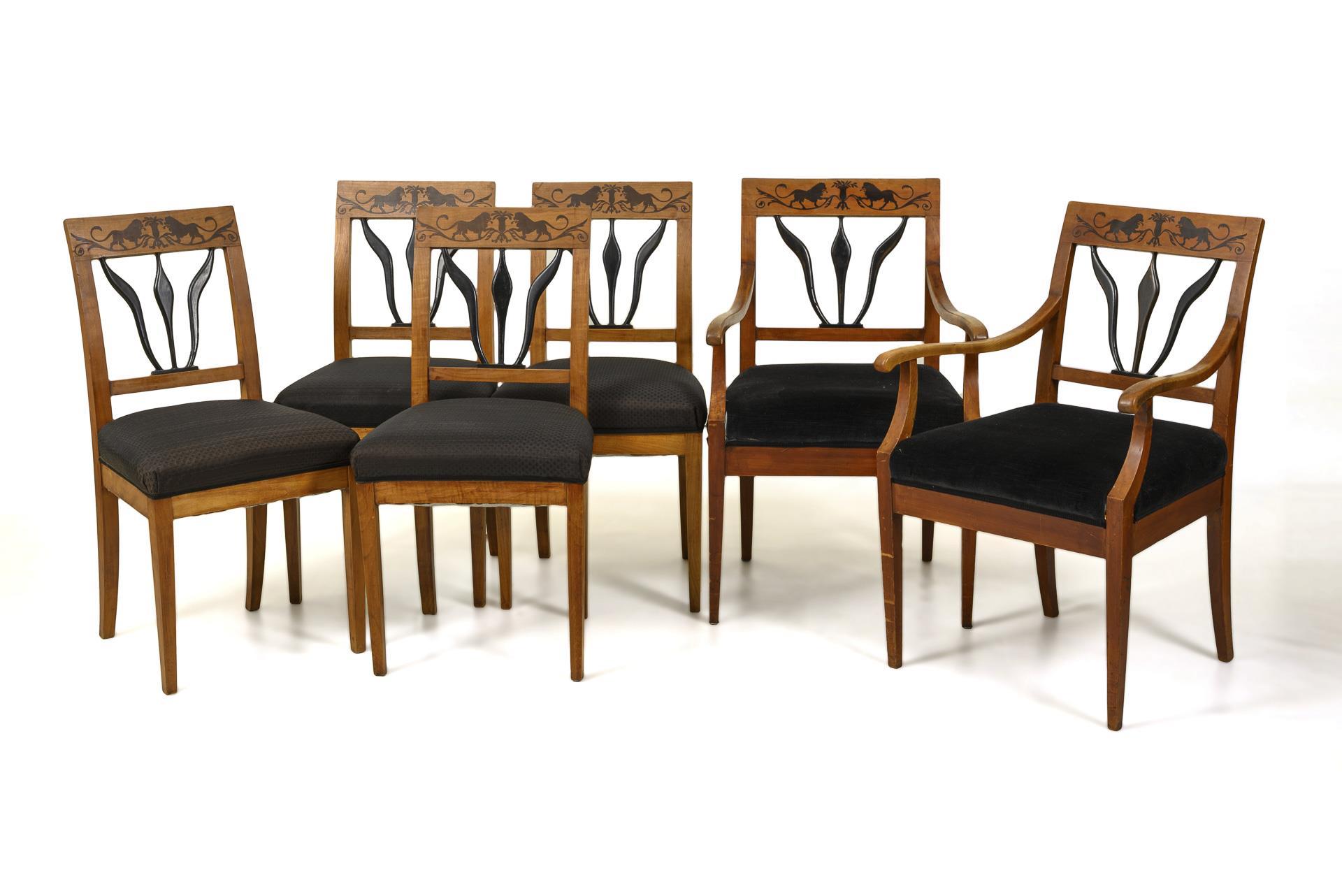 6 Biedermeier-Polsterstühle mit Löwenintarsien.