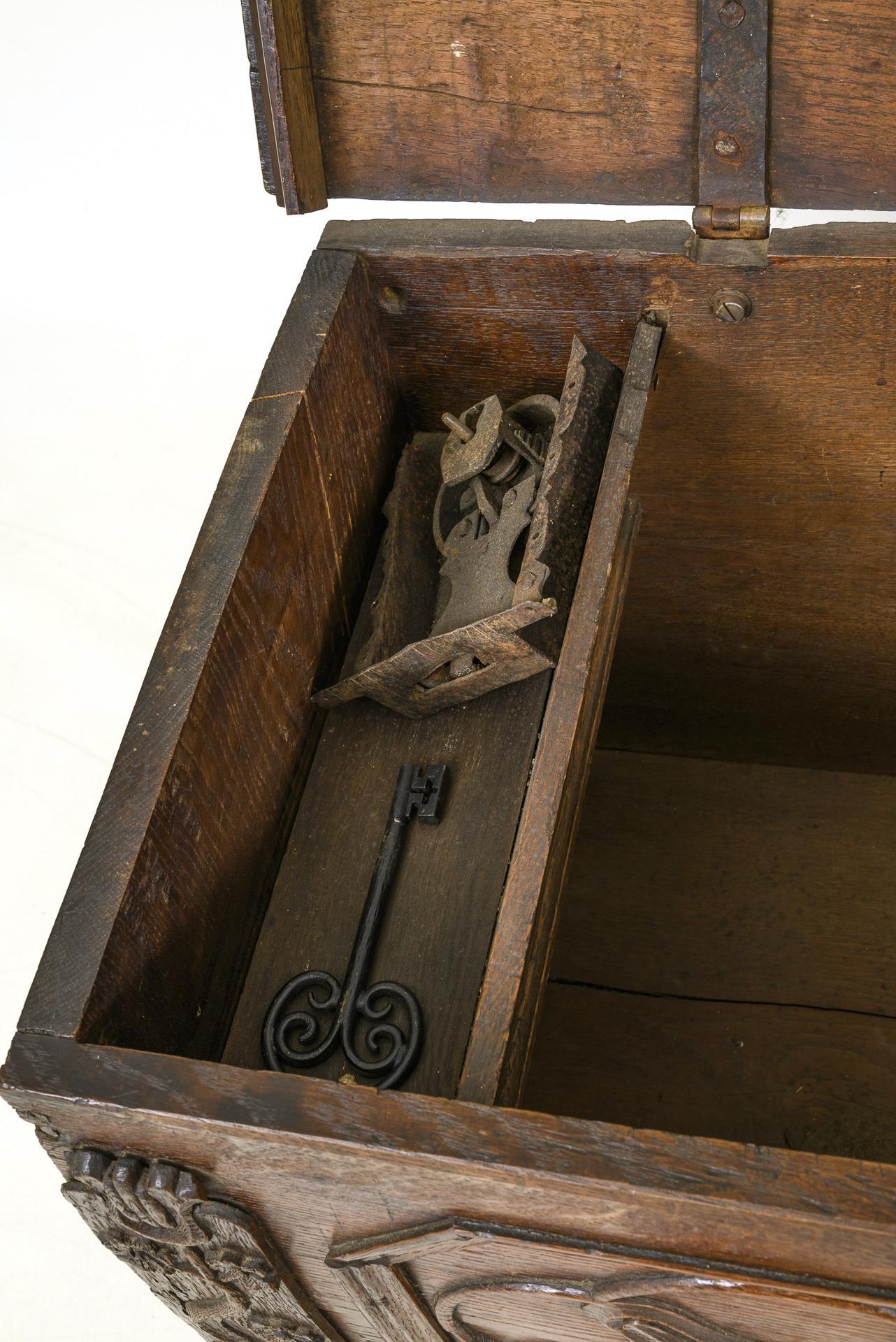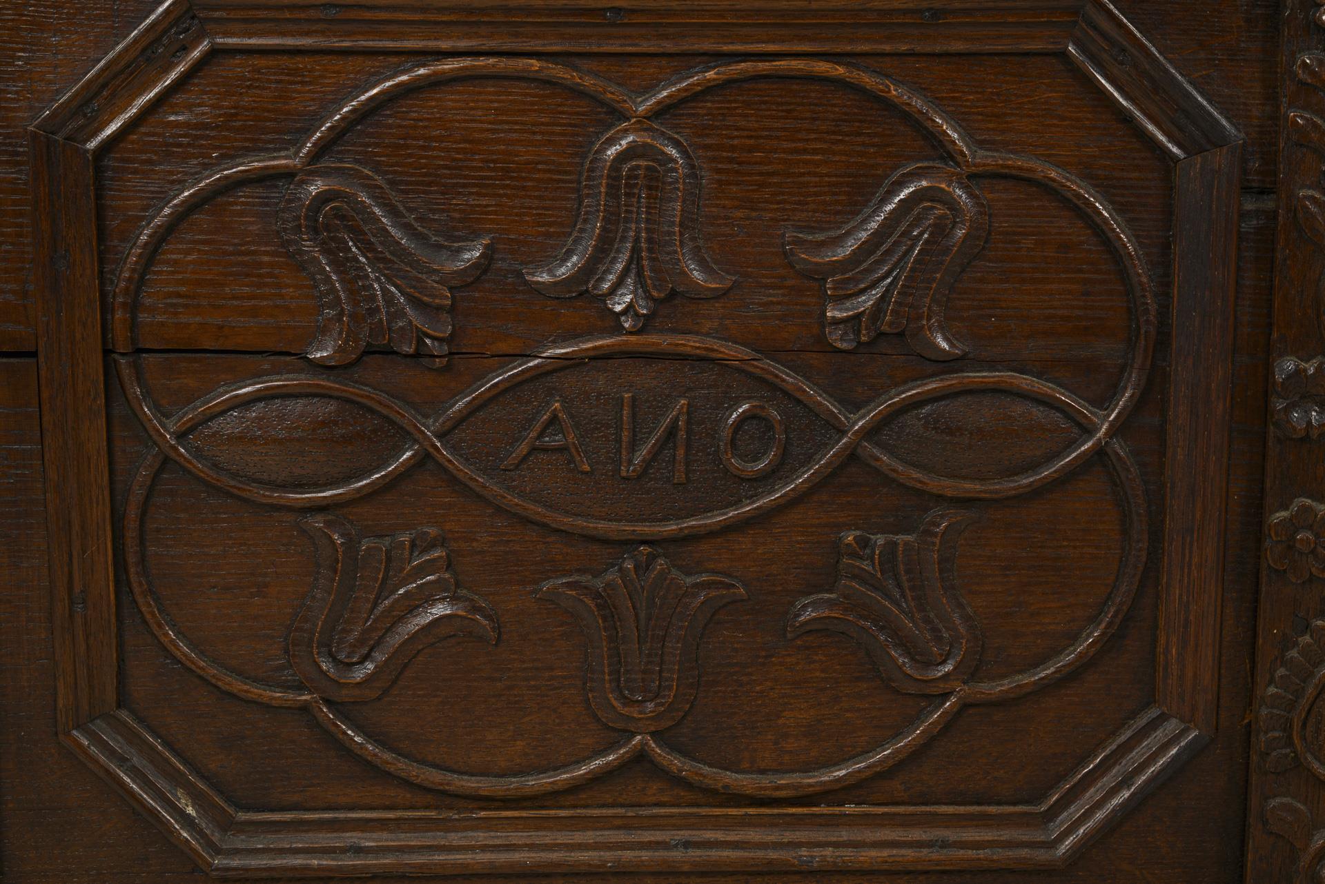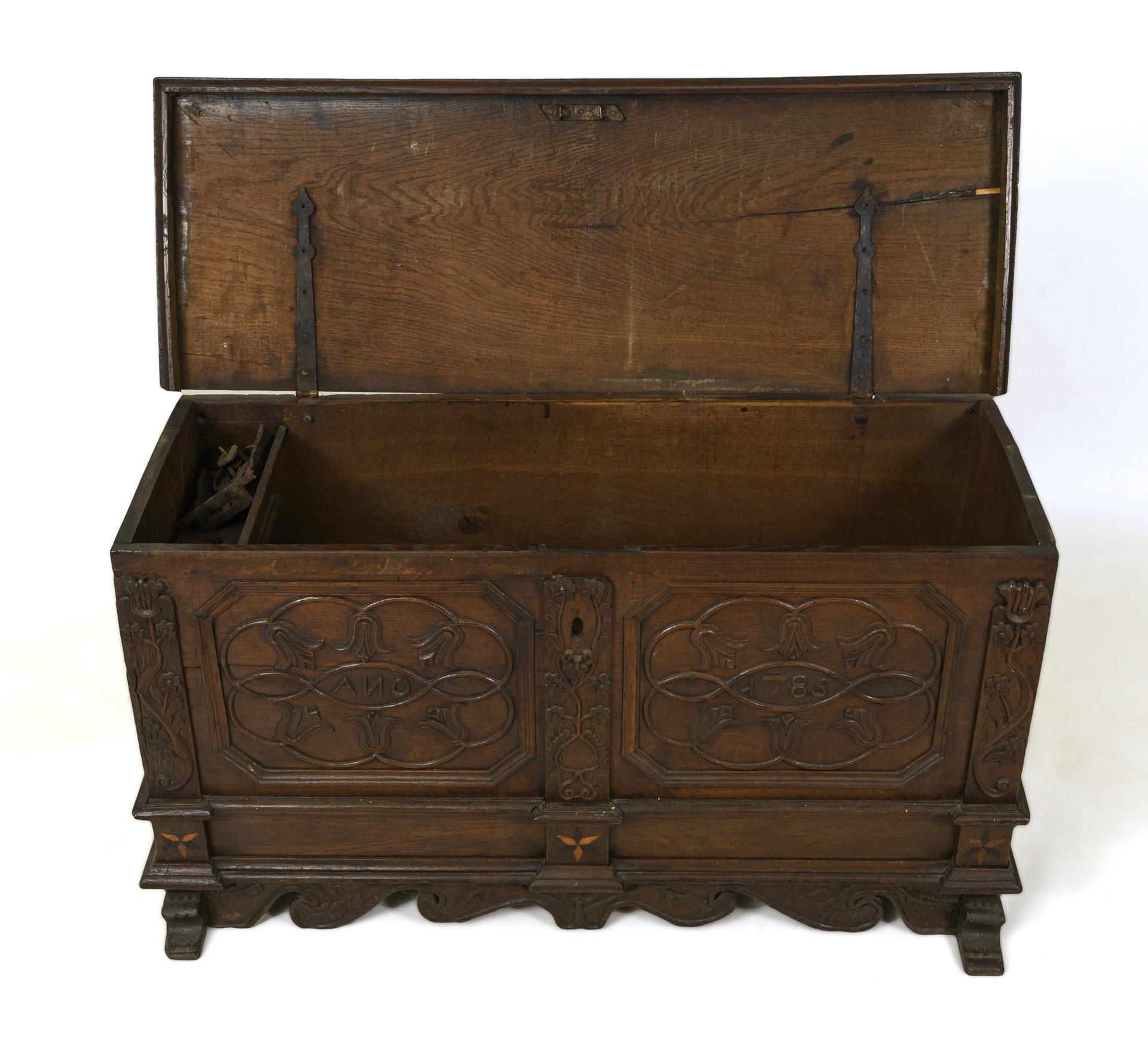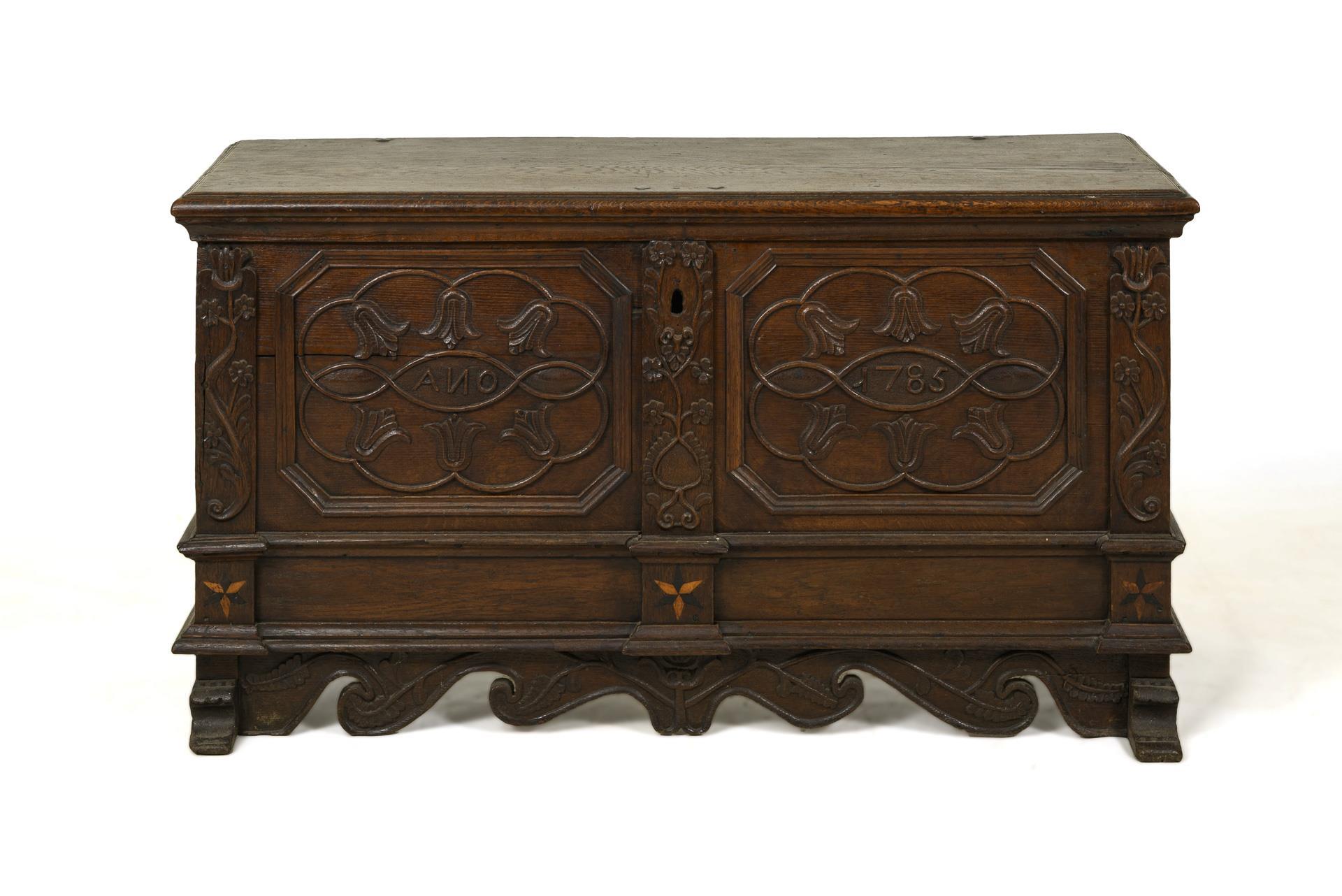 Barocke Kastentruhe mit klappbarer Deckplatte, verziert mit oktogonalen Kassettierungen und floraler Reliefschnitzerei, frontseitig datiert "AN[N]O 1785", im Sockelbereich 3 kleine Sternintarsien, geschweifte Zarge, auf 2 Kufenfüßen. Innen eine offene Beilade. Eisenbeschläge, mit losem Eisenschloss und Eisenschlüssel. Alt restauriert, mit Ergänzungen. Alters- und Gebrauchsspuren, Risse, Wasserflecken.
