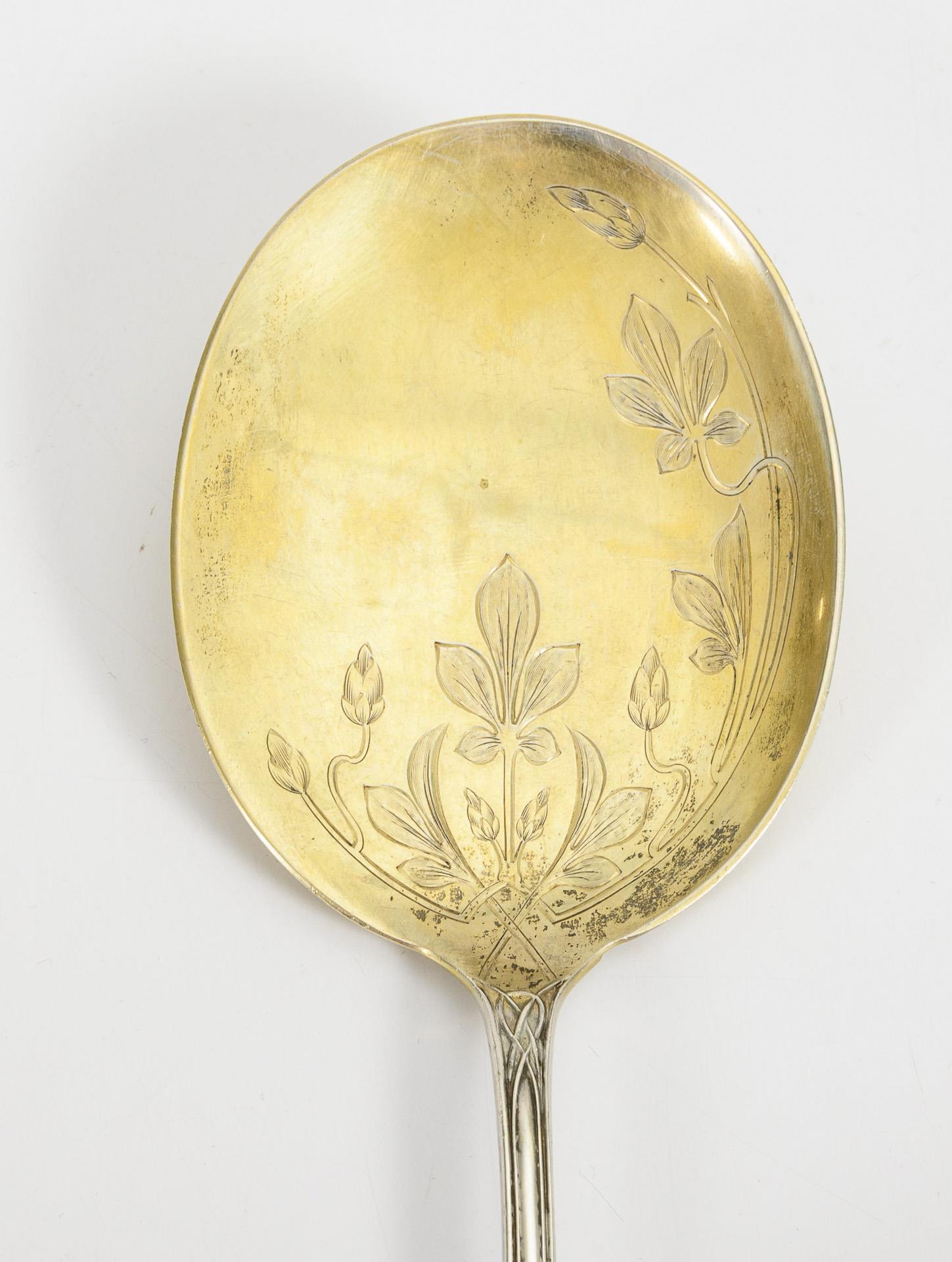 Silberlöffel mit vergoldeten Laffen, floral reliefiertem Griff und Monogrammgravur "HST". Gold minimal gerieben.