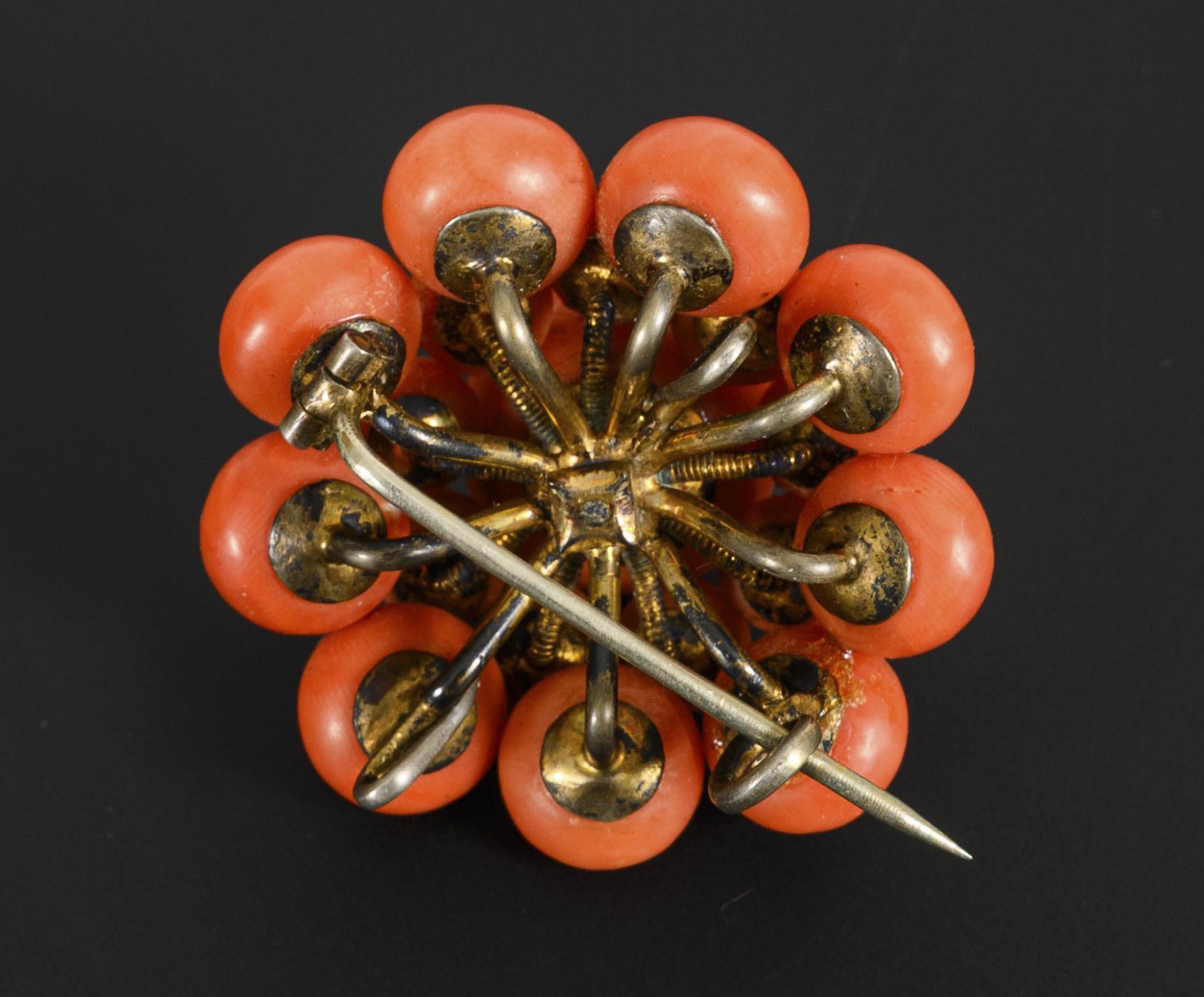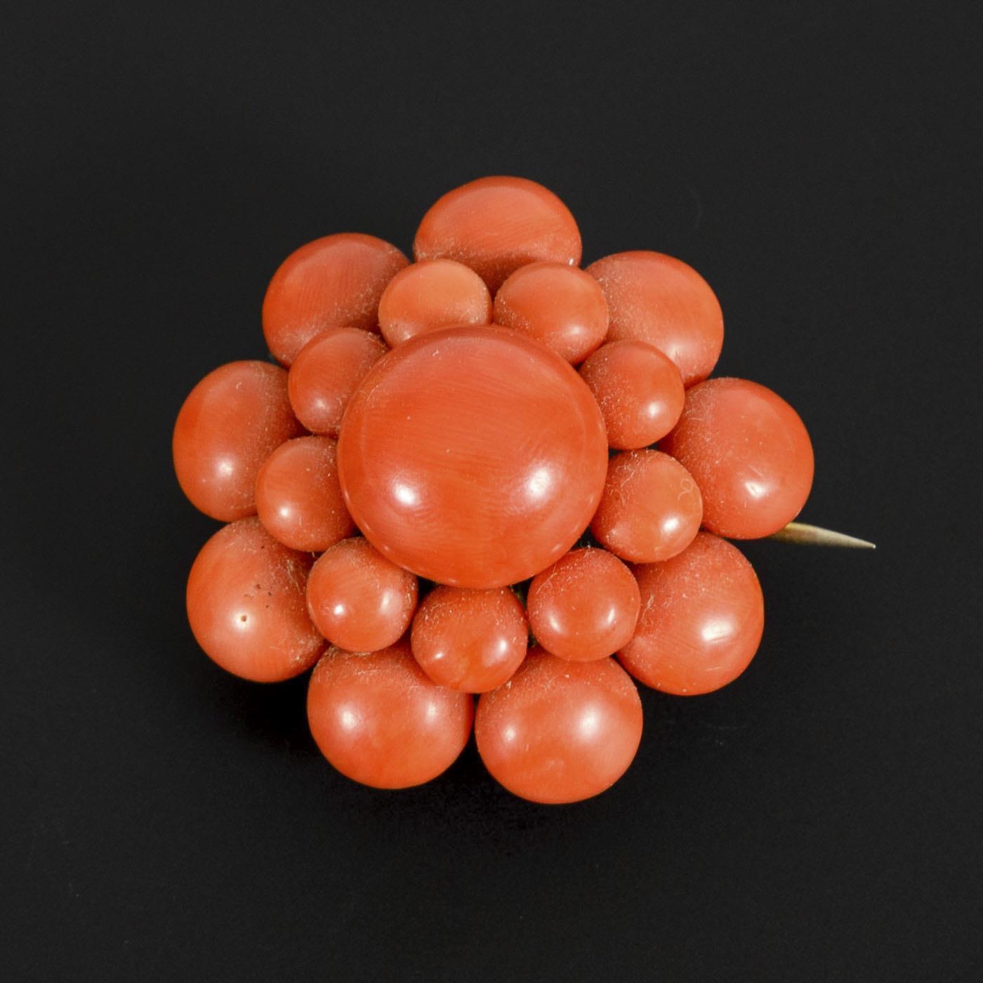 Blütenbrosche mit 3-ebnig montierten Korallenlinsen. Rückseitig mit einfachem Hakenverschluss aus Metall sowie 2 starren Hakenösen.