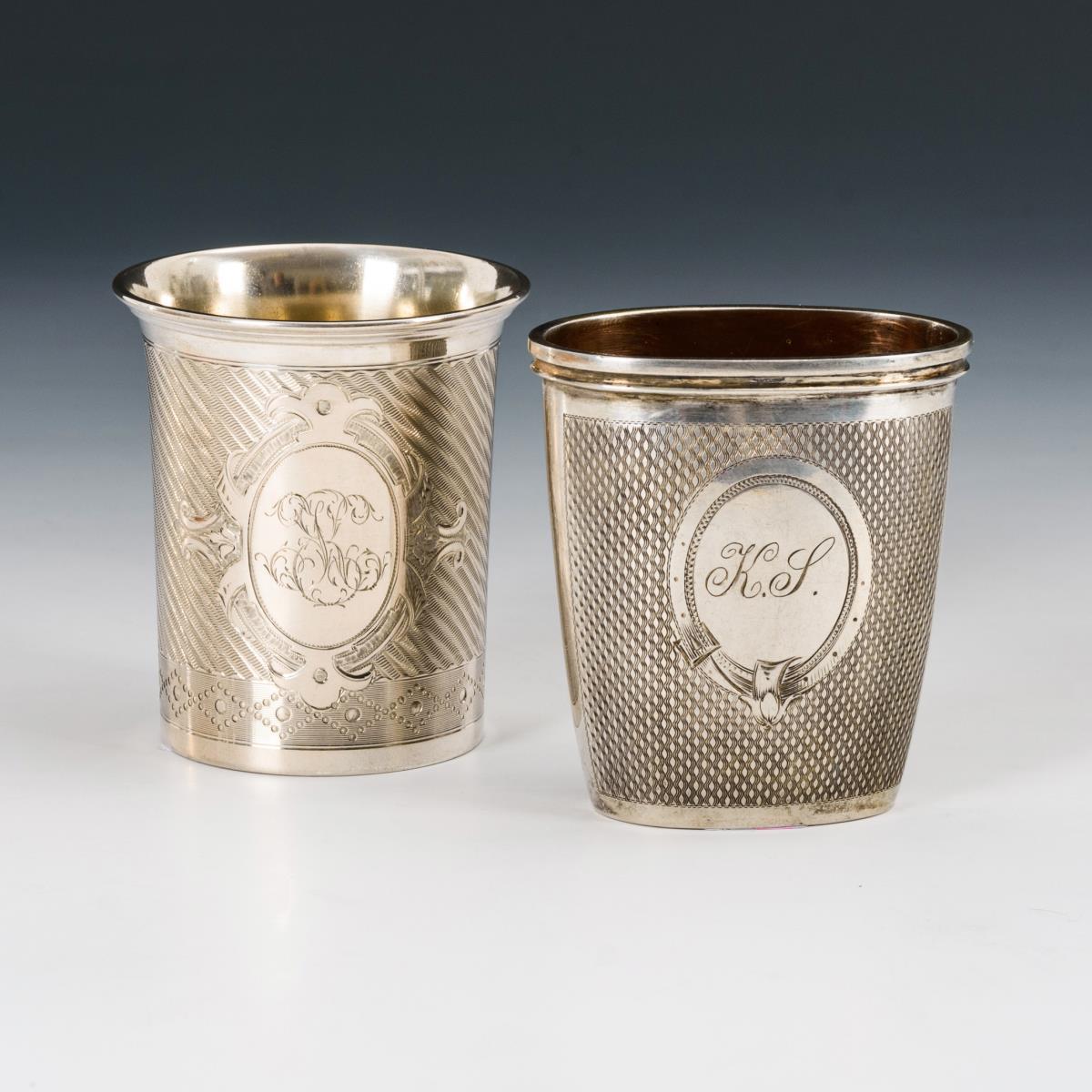 Guillochierte Becher: Zylindrischer Becher mit Monogrammgravur "EK"./ Ovaler Becher mit Monogramm "KS" und Gravur "v. Tante Marlly". 1x etwas gedellt.