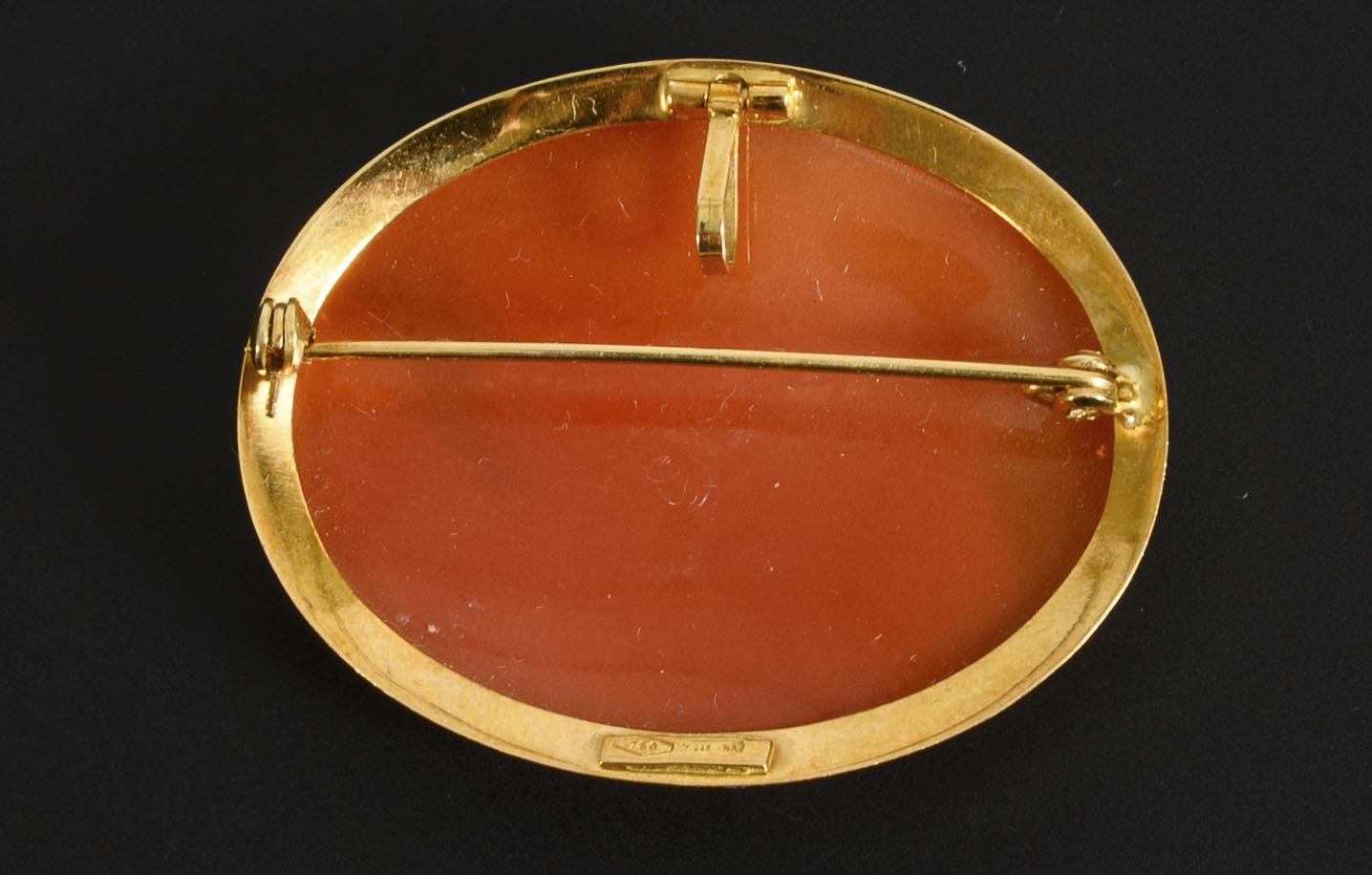 Moderne Kameenbrosche, wohl um 1950. In Gold gefasste, längsovale Muschelkamee, zwei mit Blüten und Perlenketten geschmückte Mädchenprofile zeigend. Kugelhakenverschluss.