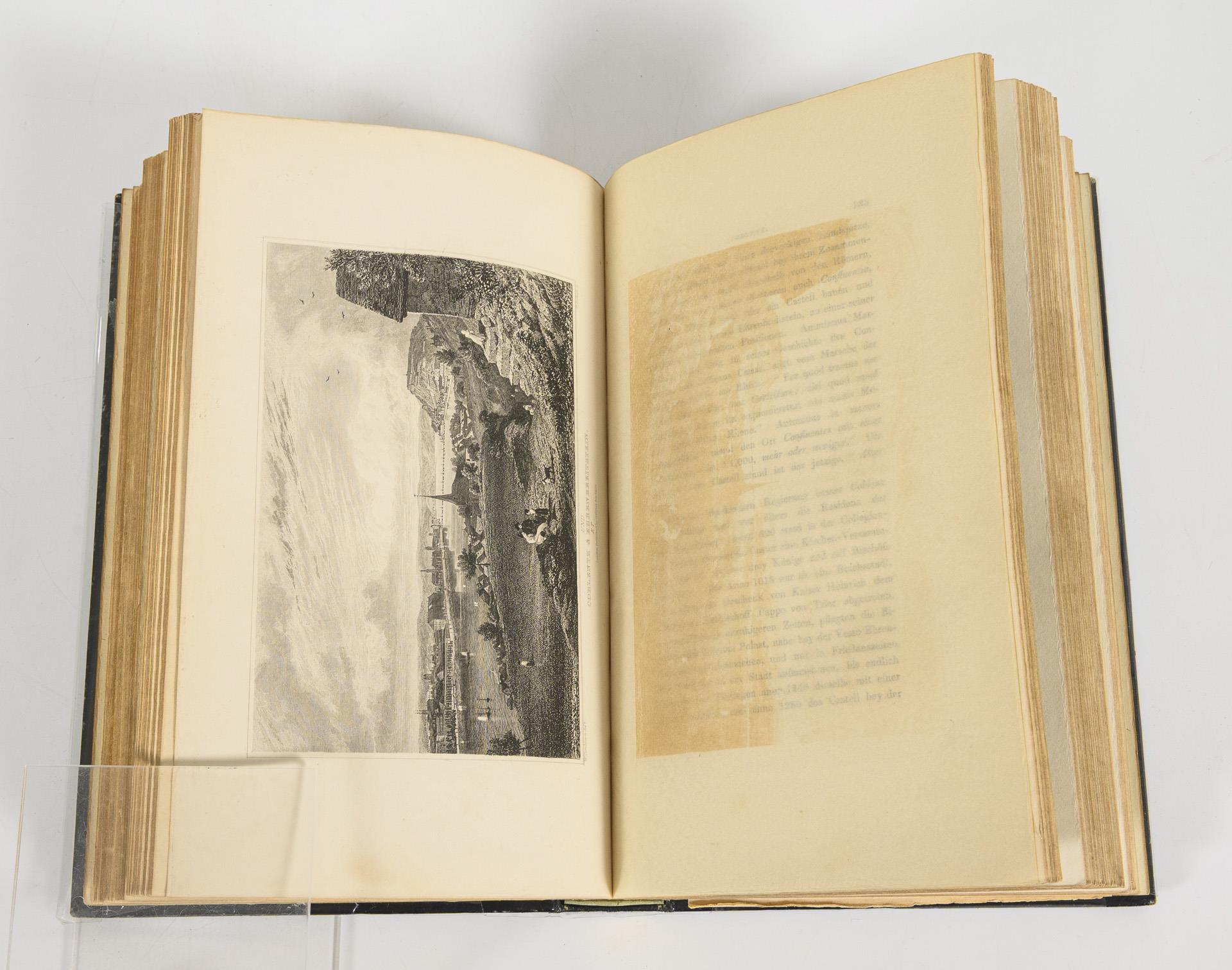 Wohl fehlende Titelseite, 190 Textseiten mit eingemischten Stahlstichen und einem Faltplan. / "Vom Mainz bis zum Ursprung der Quelle": 70 Textseiten, viele Stahlstiche und eine Faltkarte. Im goldgeprägten schwarzen Ledereinband, mit Goldschnitt