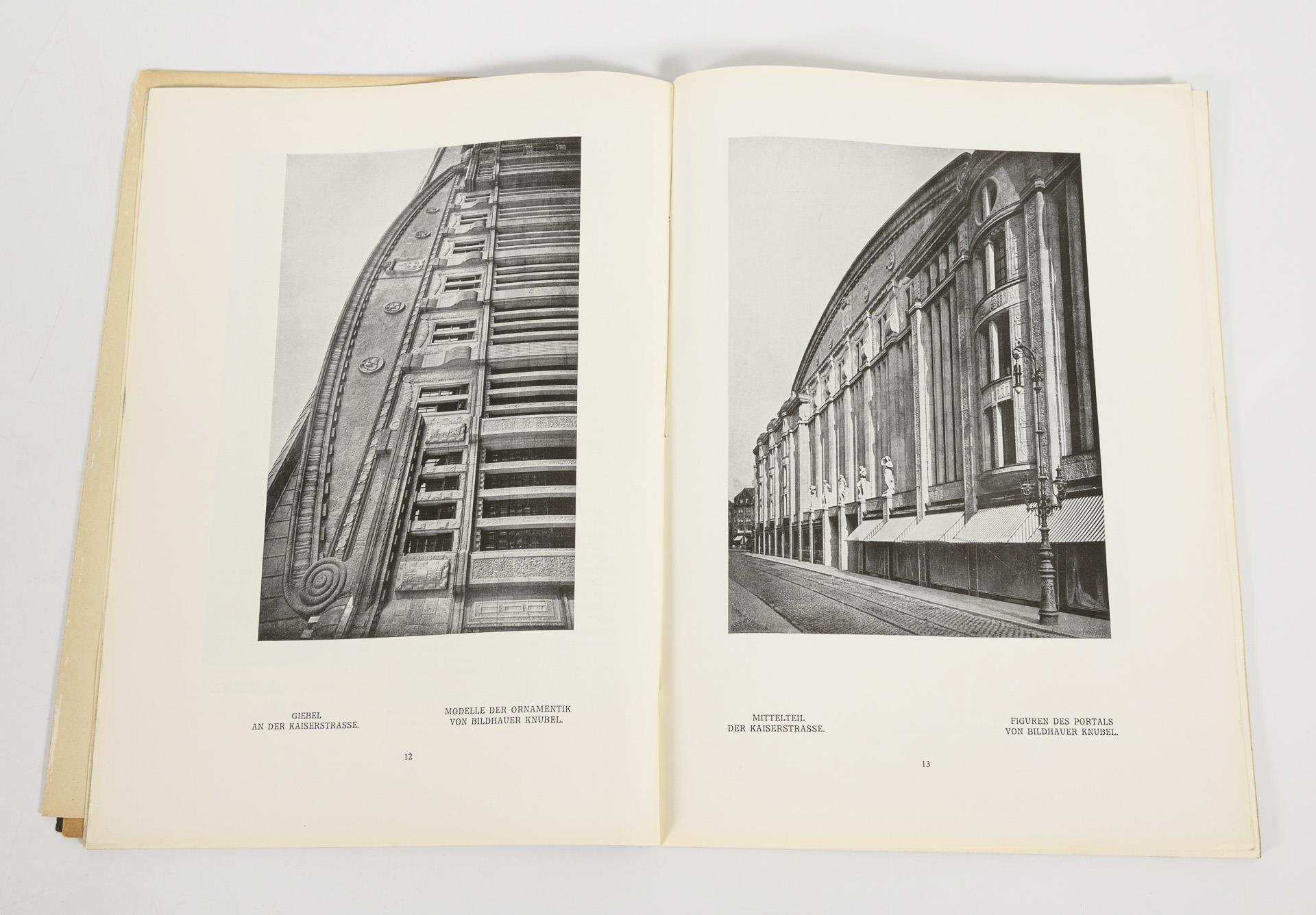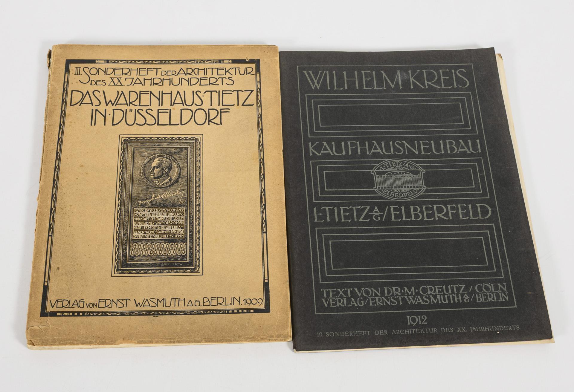 Wilhelm Kreis: "Das Warenhaus Tietz in Elberfeld", 54 Seiten mit fotografischen Aufnahmen (Gesamtansicht lose). / Joseph M. Olbrich: "Das Warenhaus Tietz in Düsseldorf", 128, (16) Seiten in Broschur. Als III. Sonderheft der Architektur des XX. Jahrhunderts. Stärkere Alters- und Gebrauchsspuren.