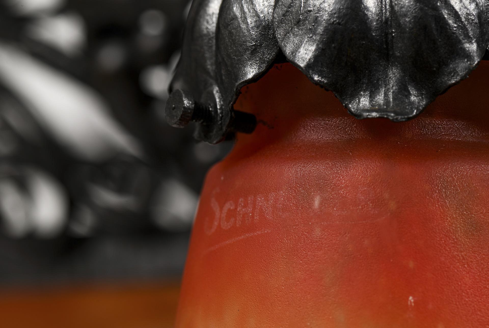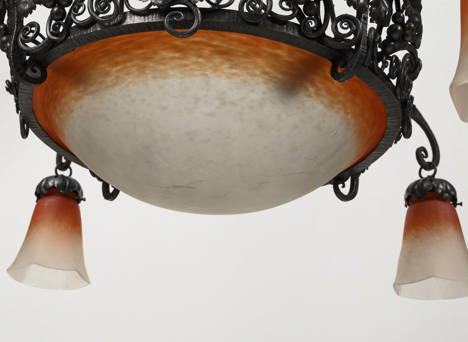 Schmiedeeisen brüniert, satiniertes farbloses Glas mit weißen und orangen Pulvereinschmelzungen, Elektrifizierung mit Schraubfassungen. H 100 cm, Ø 84 cm. 12,0 kg.