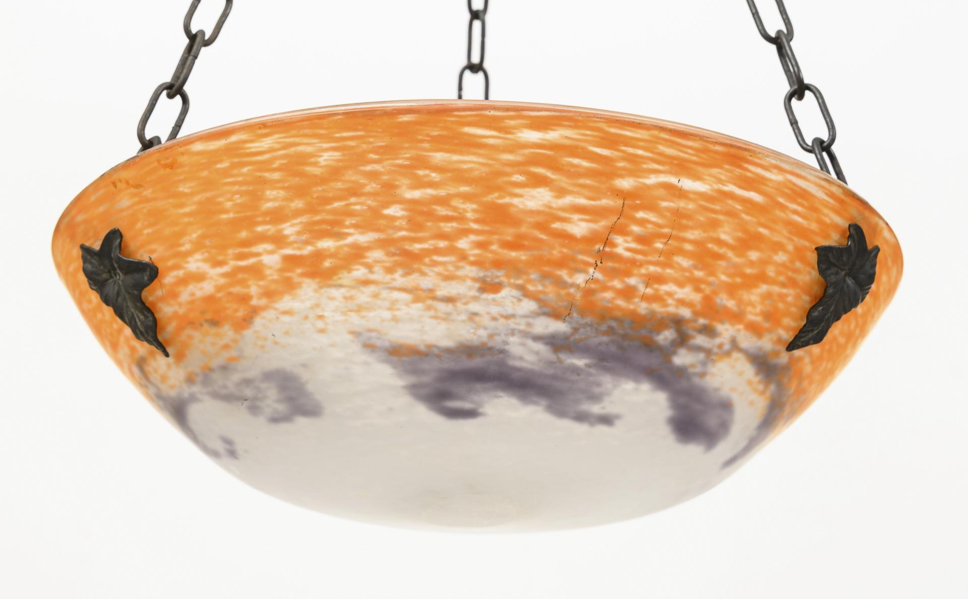 Schalenlampe mit Weinblatthalterungen für die 3 Ketten zum Baldachin in Form eines Blattkranzes. Schalenmitte beschliffen, wenige Alters-/Gebrauchsspuren, Verkabelung fehlt.