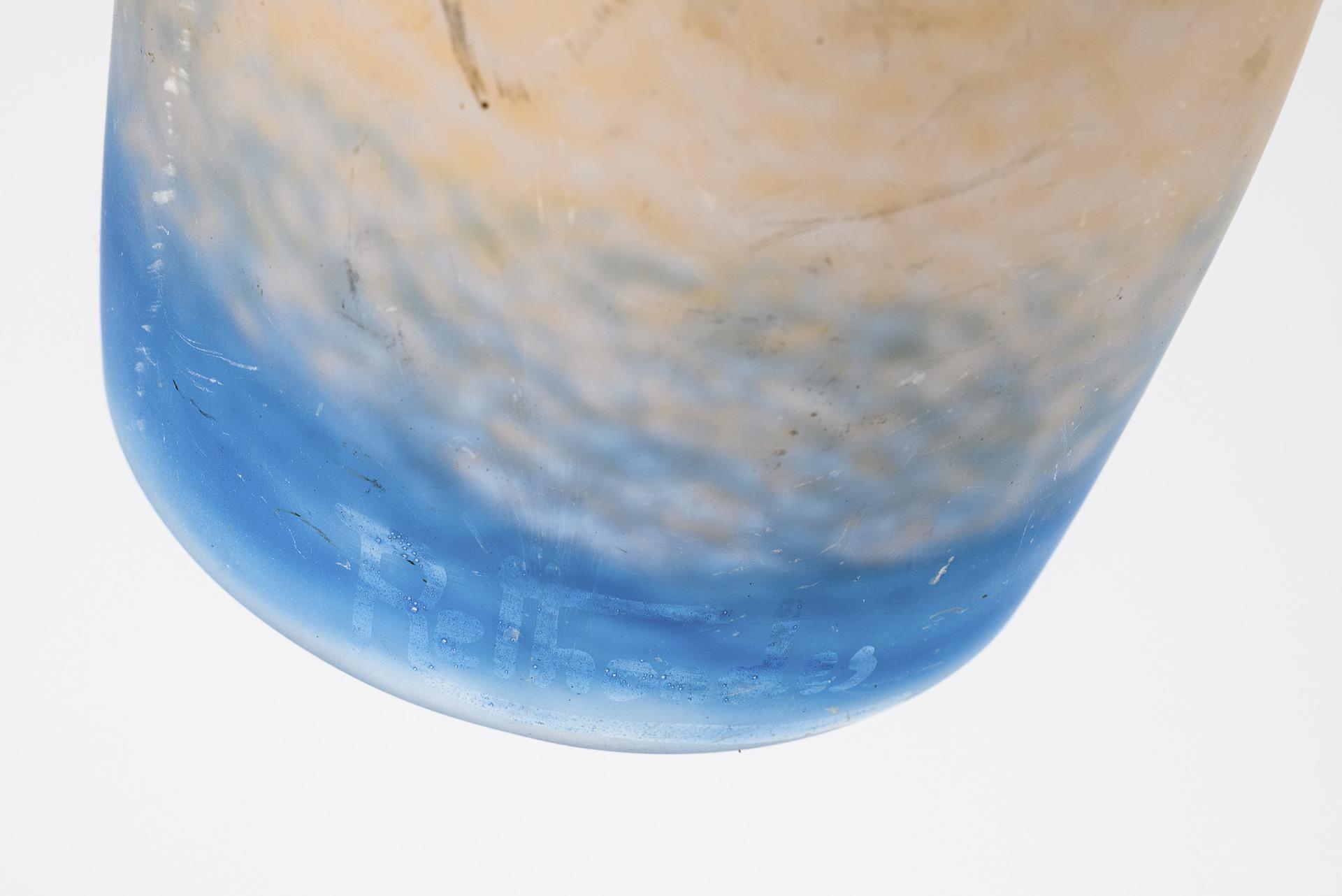 Schmiedeeisen geschwärzt, satiniertes farbloses Glas mit weißen und blauen Pulvereinschmelzungen, Elektrifizierung mit Kabelschalter und Bajonettfassung. H 37 cm, Ø Schirm 9,5 cm. 1,4 kg.