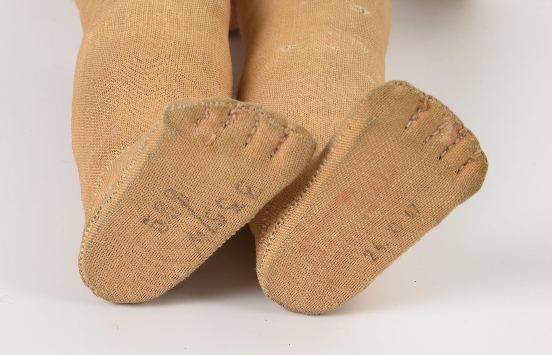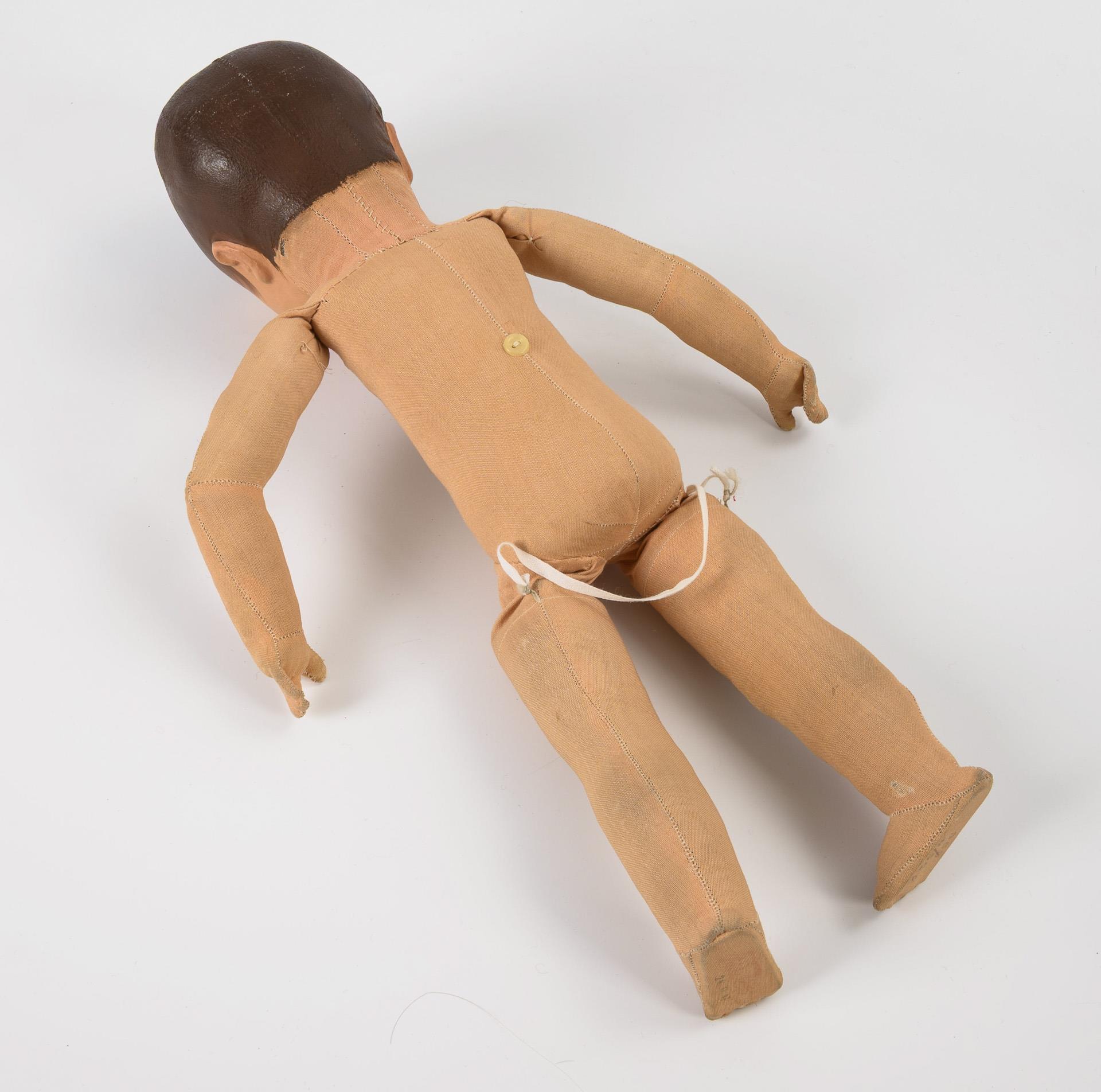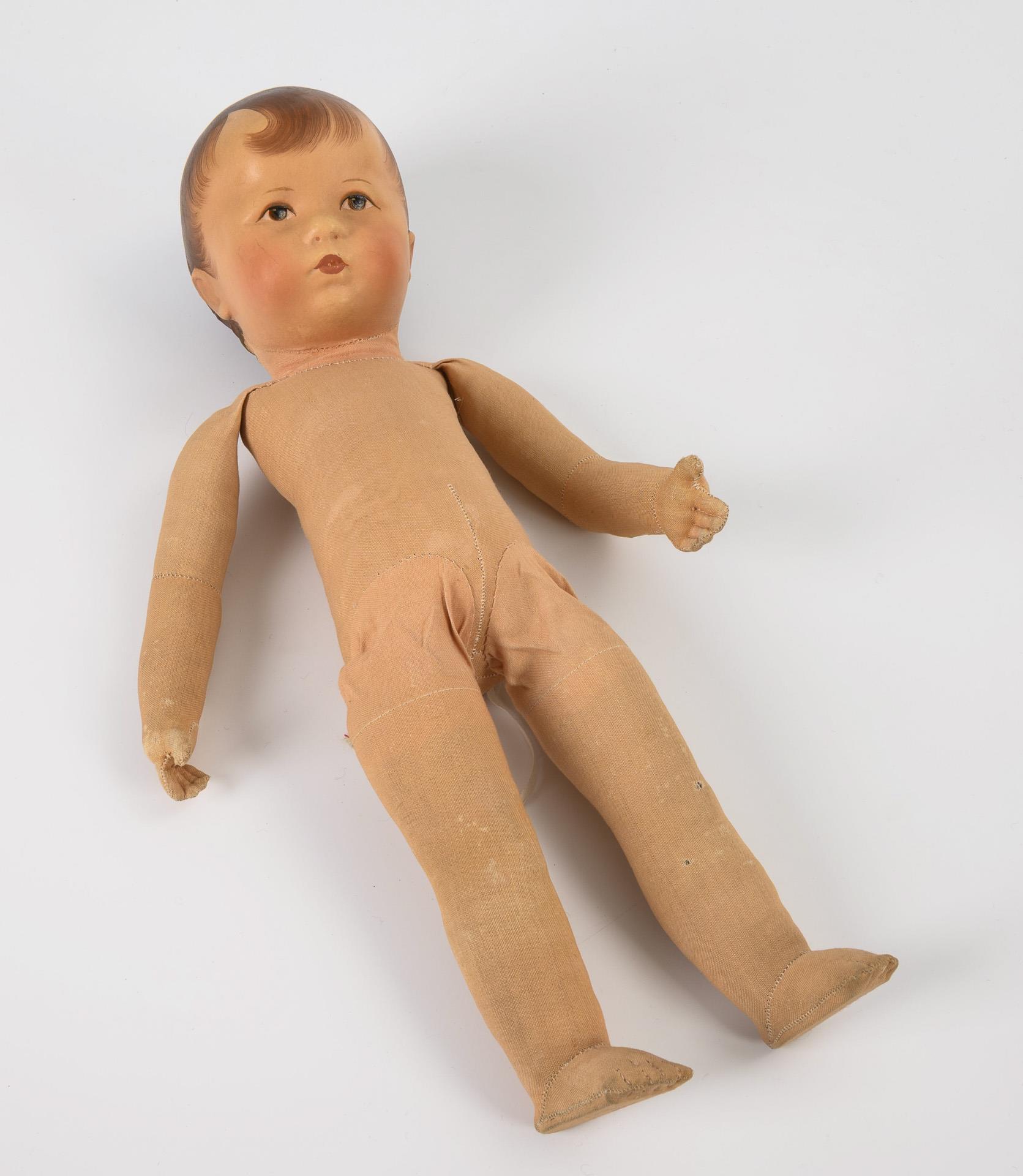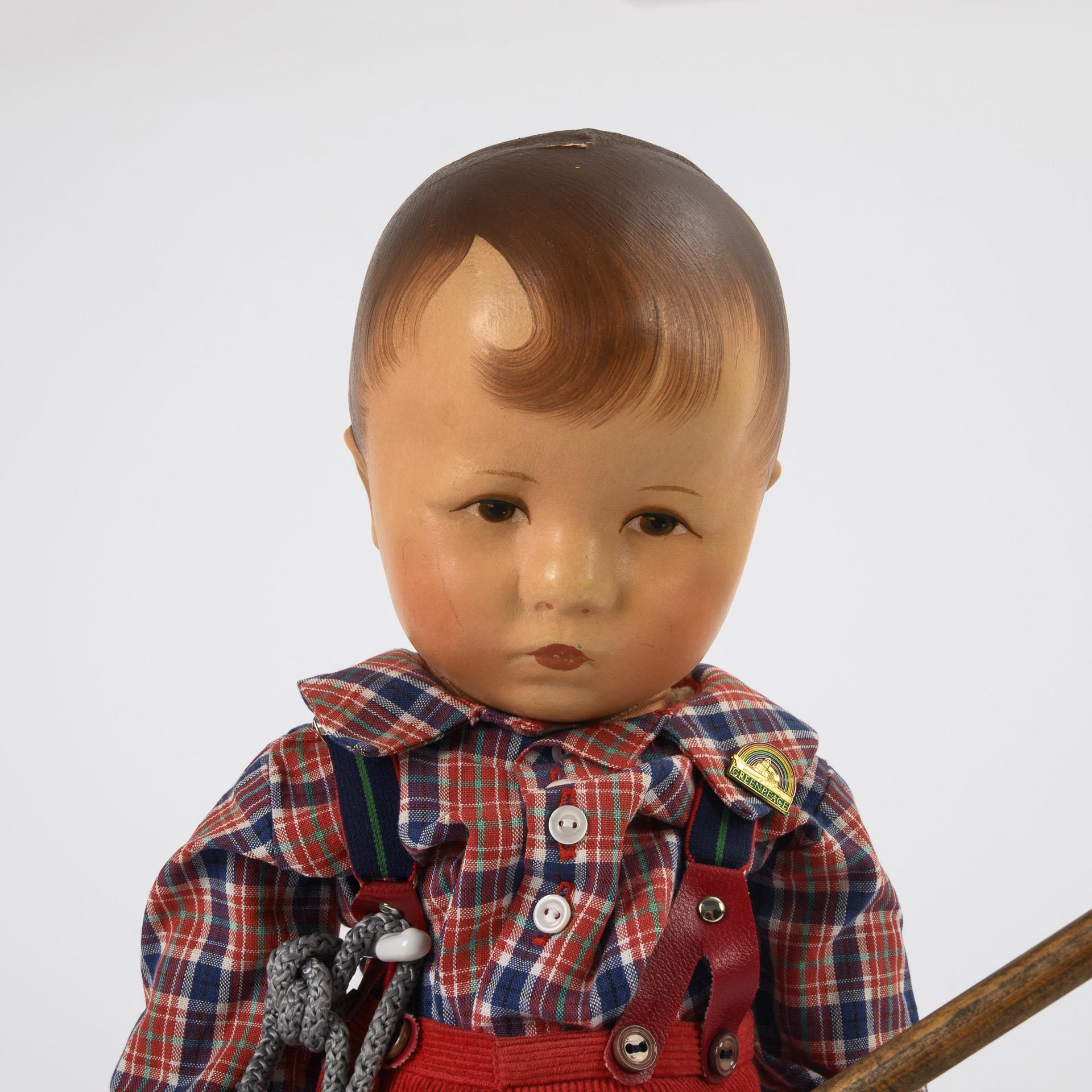 Typ XII. Maskenartig bemalter Stoffkopf mit 3 Hinterkopf-Nähten. Locker angenähte Hampelchen-Beine mit 1 Naht. Im Rücken Knopf und ergänztes Bändchen. Jüngere, originale Käthe-Kruse-Kleidung: kariertes Hemd, rote Cordhose, blaue Lederschuhe. Dazu Steckenpferd aus Holz. Kleine Retuschen im Kopfbereich, am Körper mehrere kleine zerschlissene Stellen.