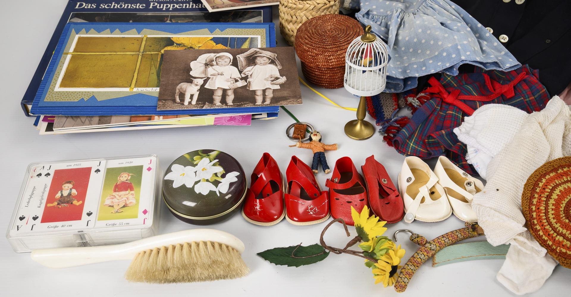 Konvolut Puppenkleidung und Bücher.