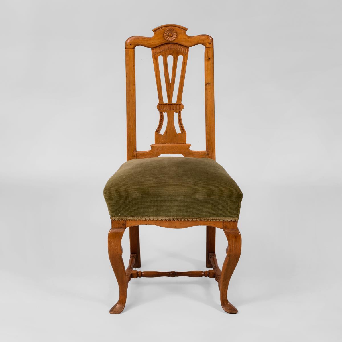 Polsterstuhl mit ausgestellten Vorderbeinen und durchbrochenen gearbeitetem Mittelbrett. Alt restauriert, Bezug ergänzt, Trockenrisse, Defekt an Strebe im Mittelbrett.