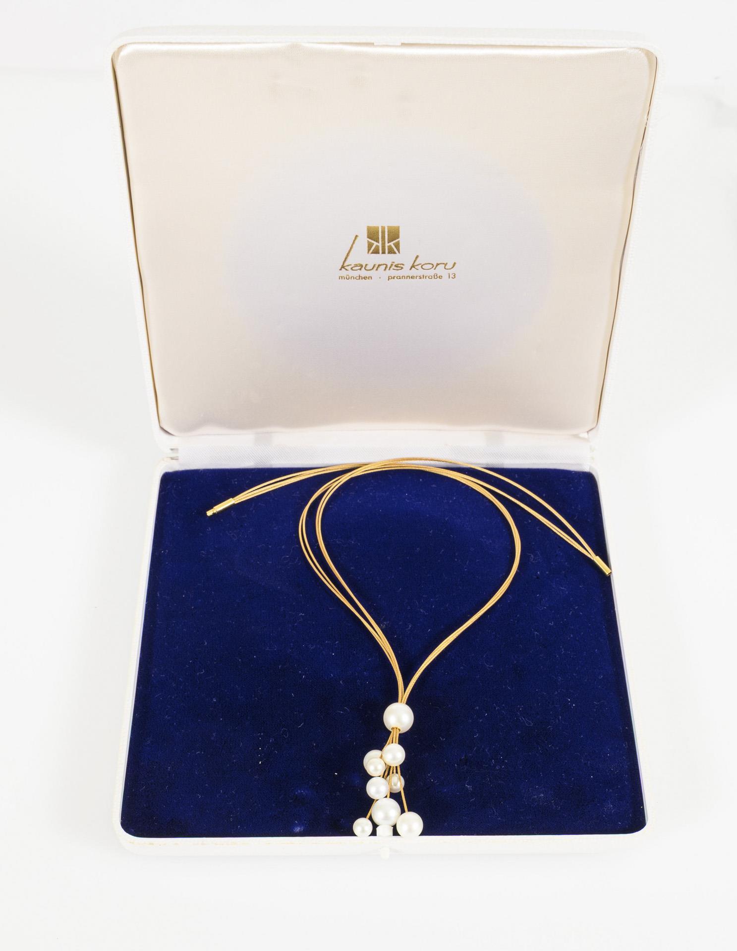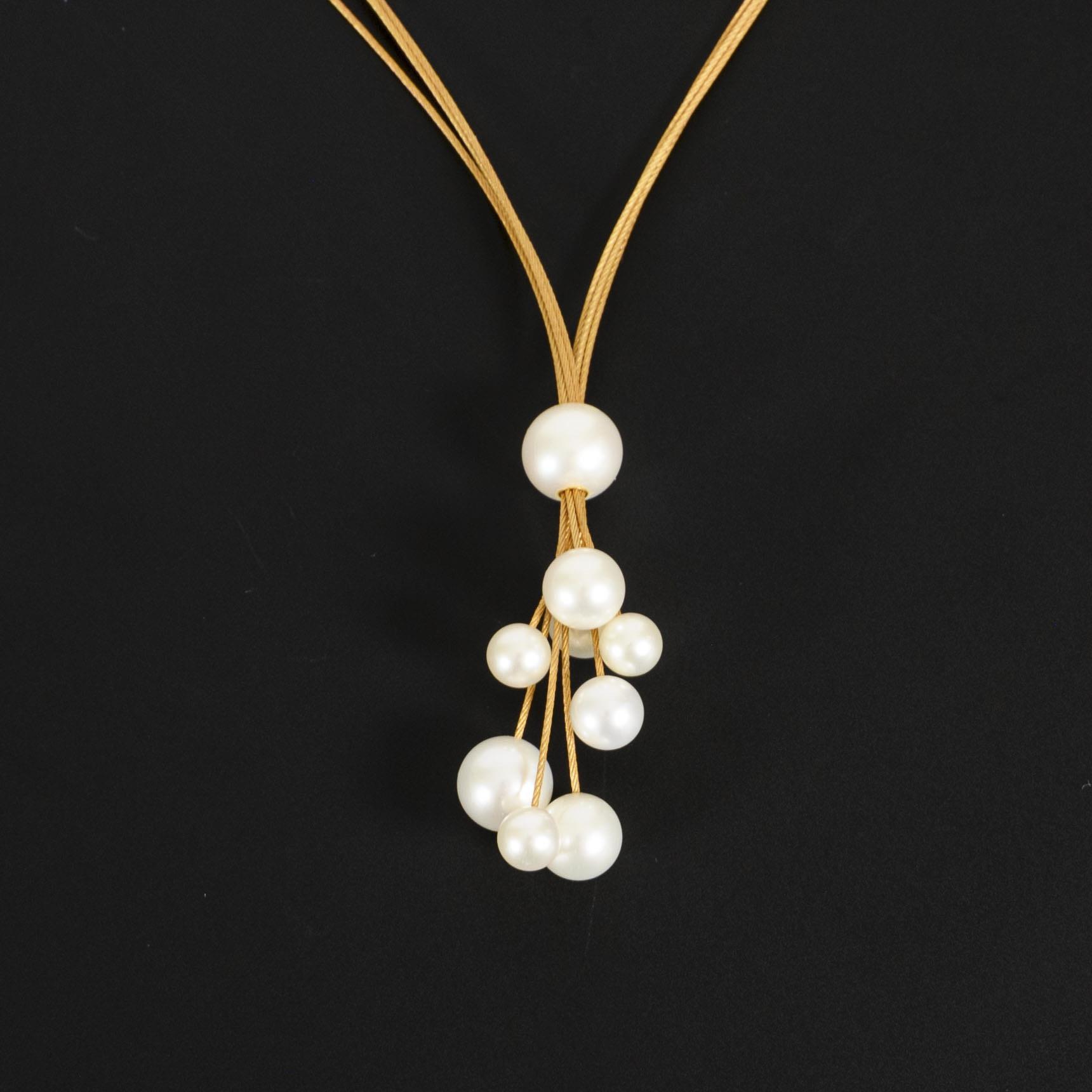 Gelbgold 750 geprüft. Kettenlänge bis zu ca. 47,5 cm, die oberste Perle durch einen Schiebemechanismus verstellbar, die Perlen im Durchmesser zwischen ca. 6,15 und 10,07 mm. 16,2 g.