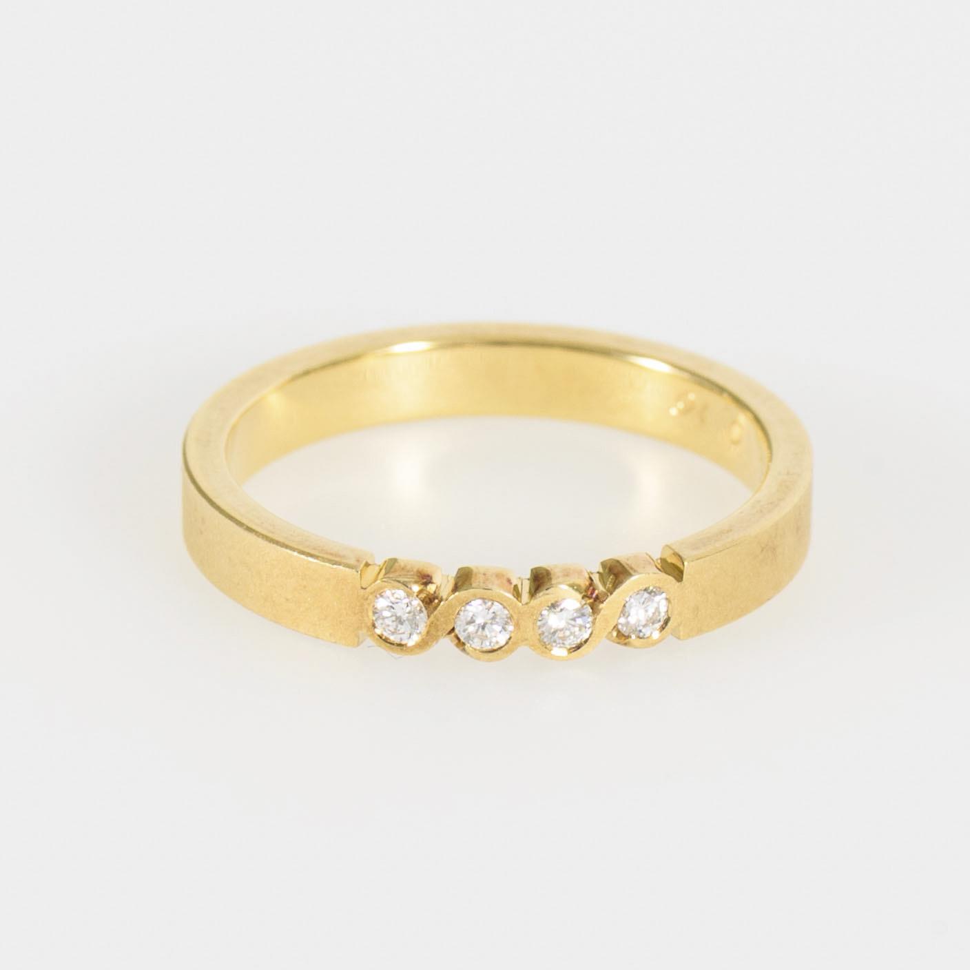 Großer Bandring mit 4 Brillanten in einer wellenförmig gestalteten Zargenfassung.