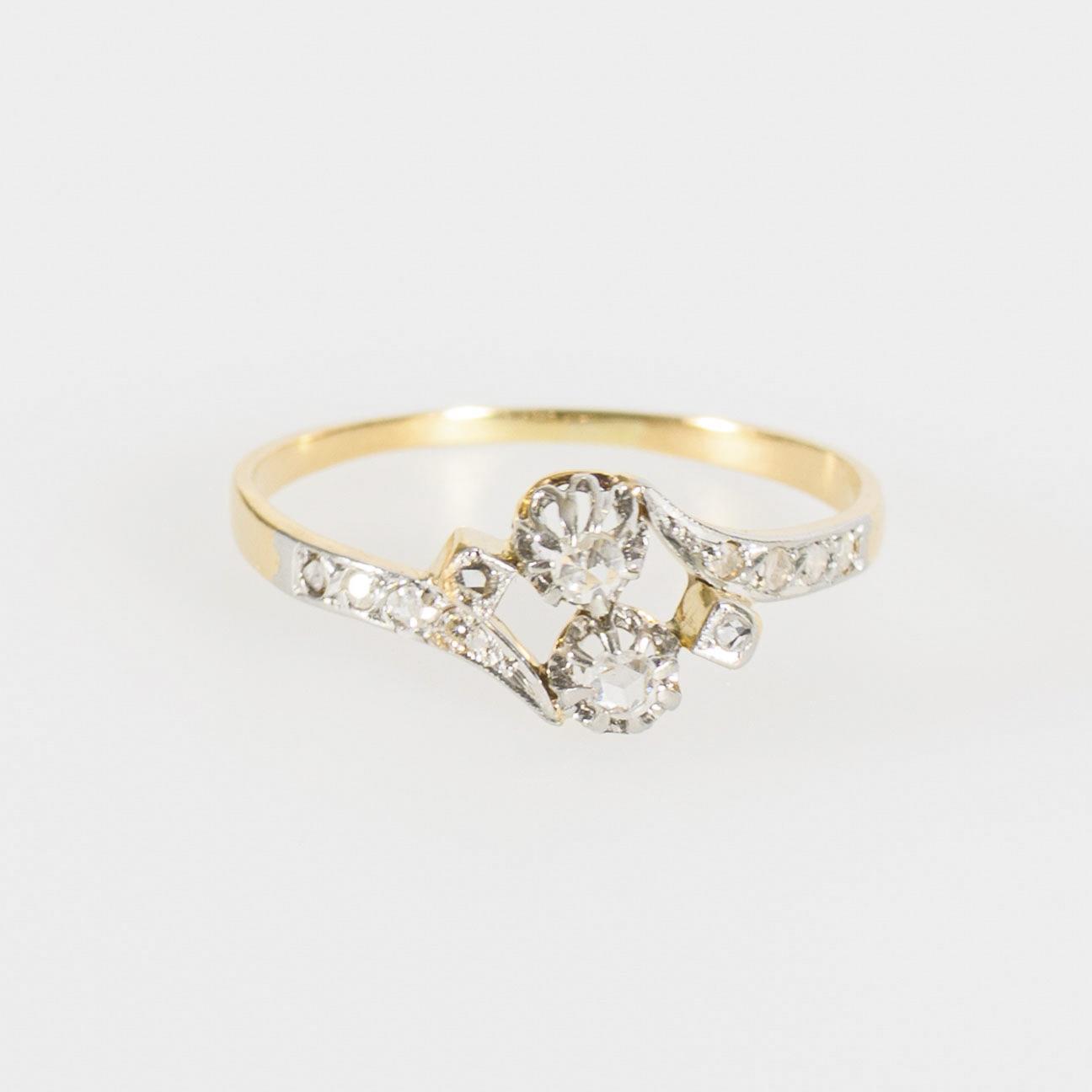 Zweifarbiger Ring mit Besatz aus kleinen Diamantsplittern sowie Diamanten im Rosenschliff, in Weißgold gefasst, zwischen einer Gelbgoldschiene.