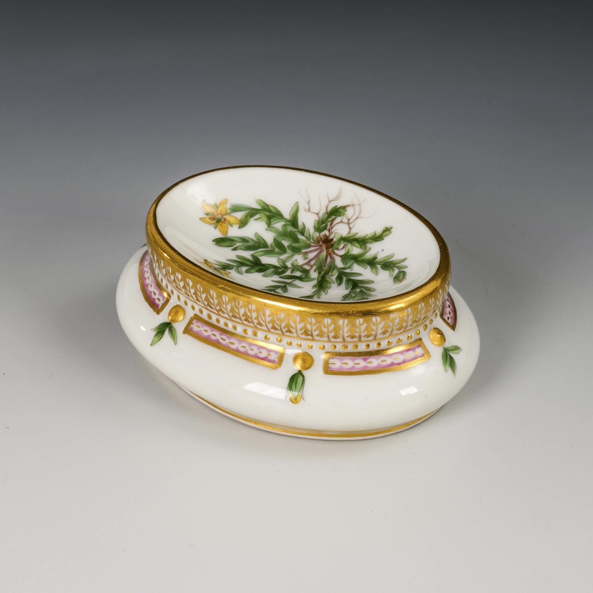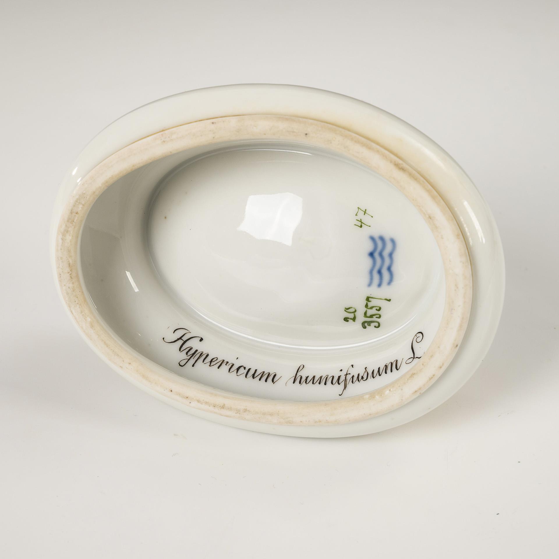 Ovale Form mit Perlband, im Spiegel die Darstellung des Niederliegenden Johanniskrautes, unterseitig lateinisch bezeichnet.