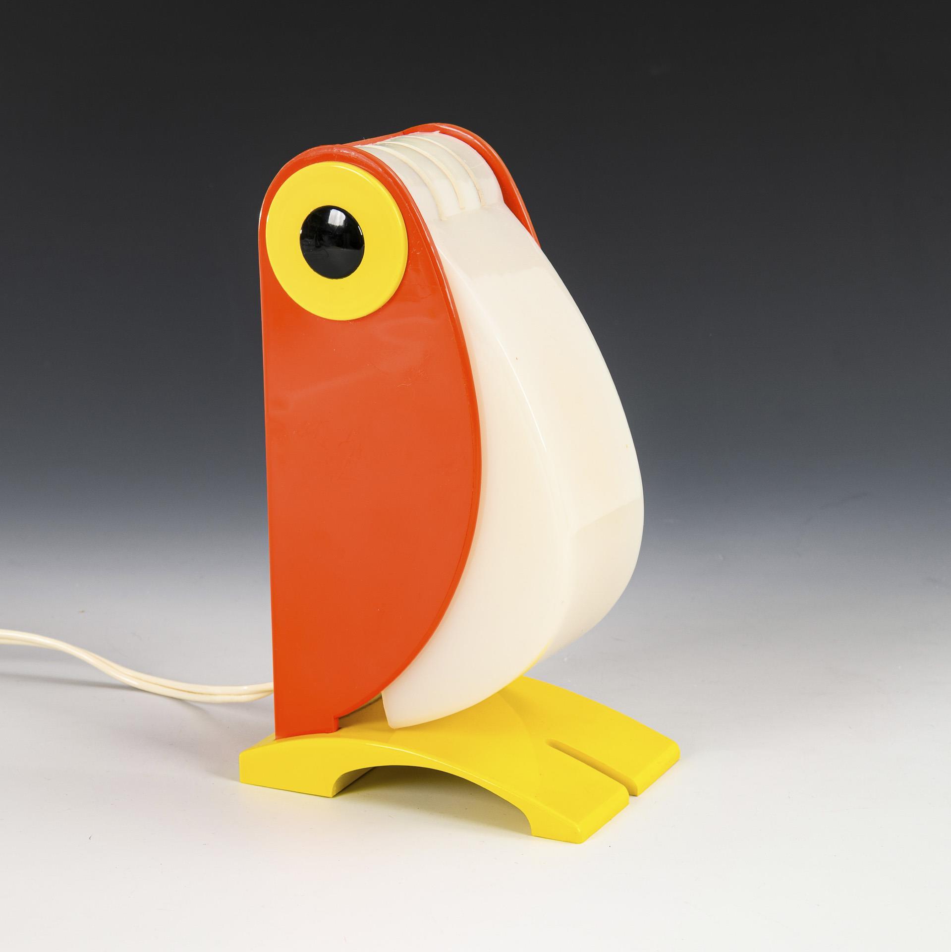 Lampe in Form eines exotischen Vogels, dessen großer Schnabel als Lampenschirm hochklappbar ist. Funktioniert.