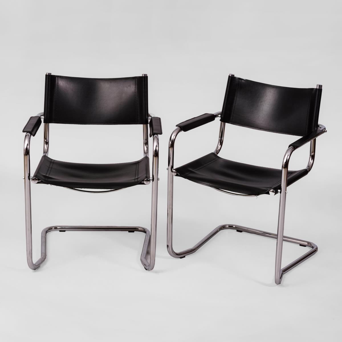 2 moderne Stahlrohr-Freischwinger mit Armlehnen und gerader Rückenform. Alters-/Gebrauchsspuren, Kunstleder mit Defekten.