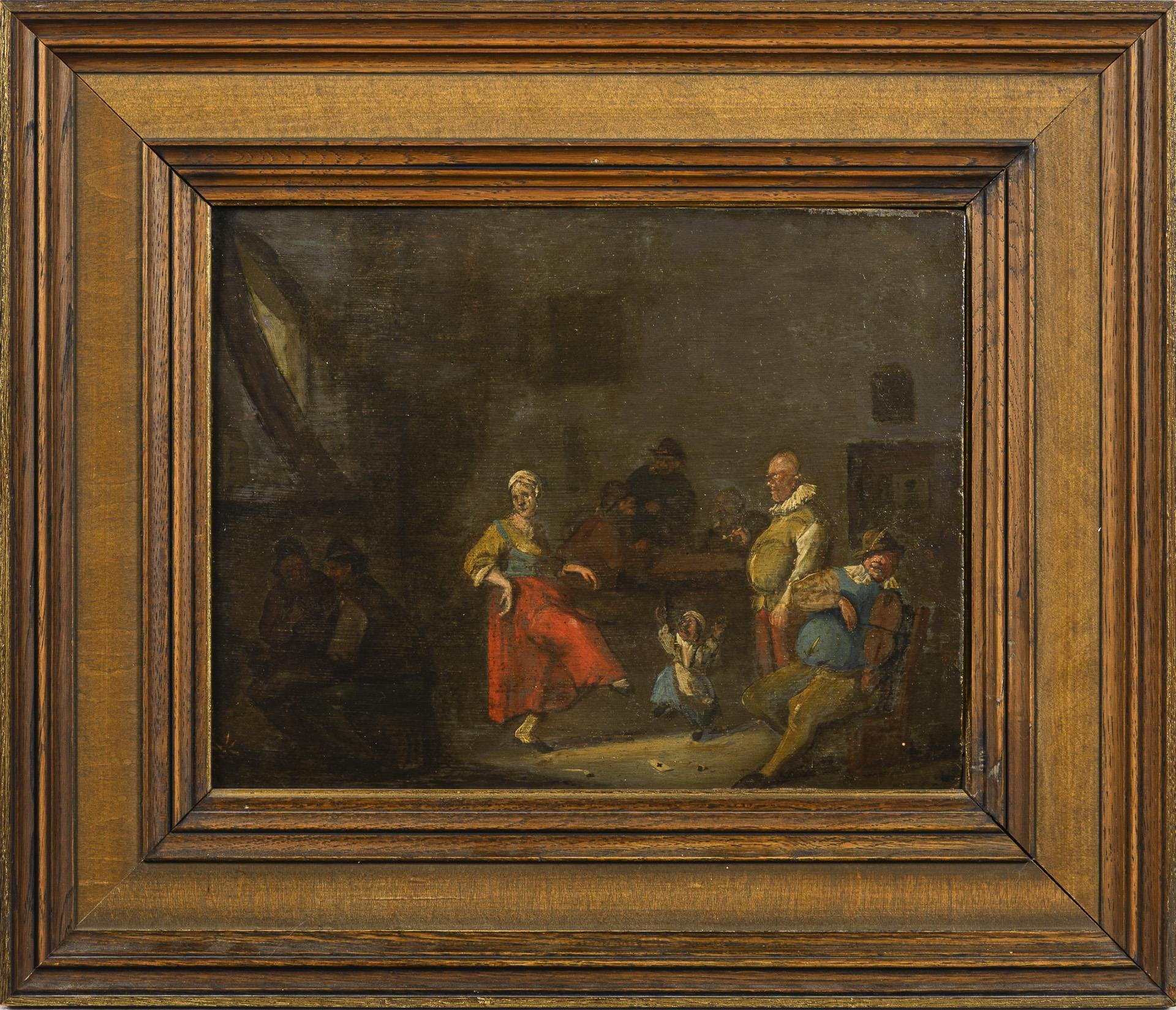Wirtshausszene mit tanzender Magd neben Musikant und Kartenspielern. Altersspuren.