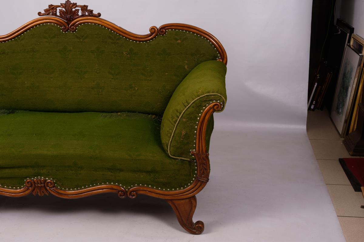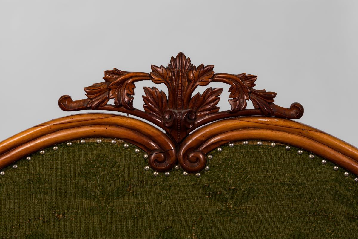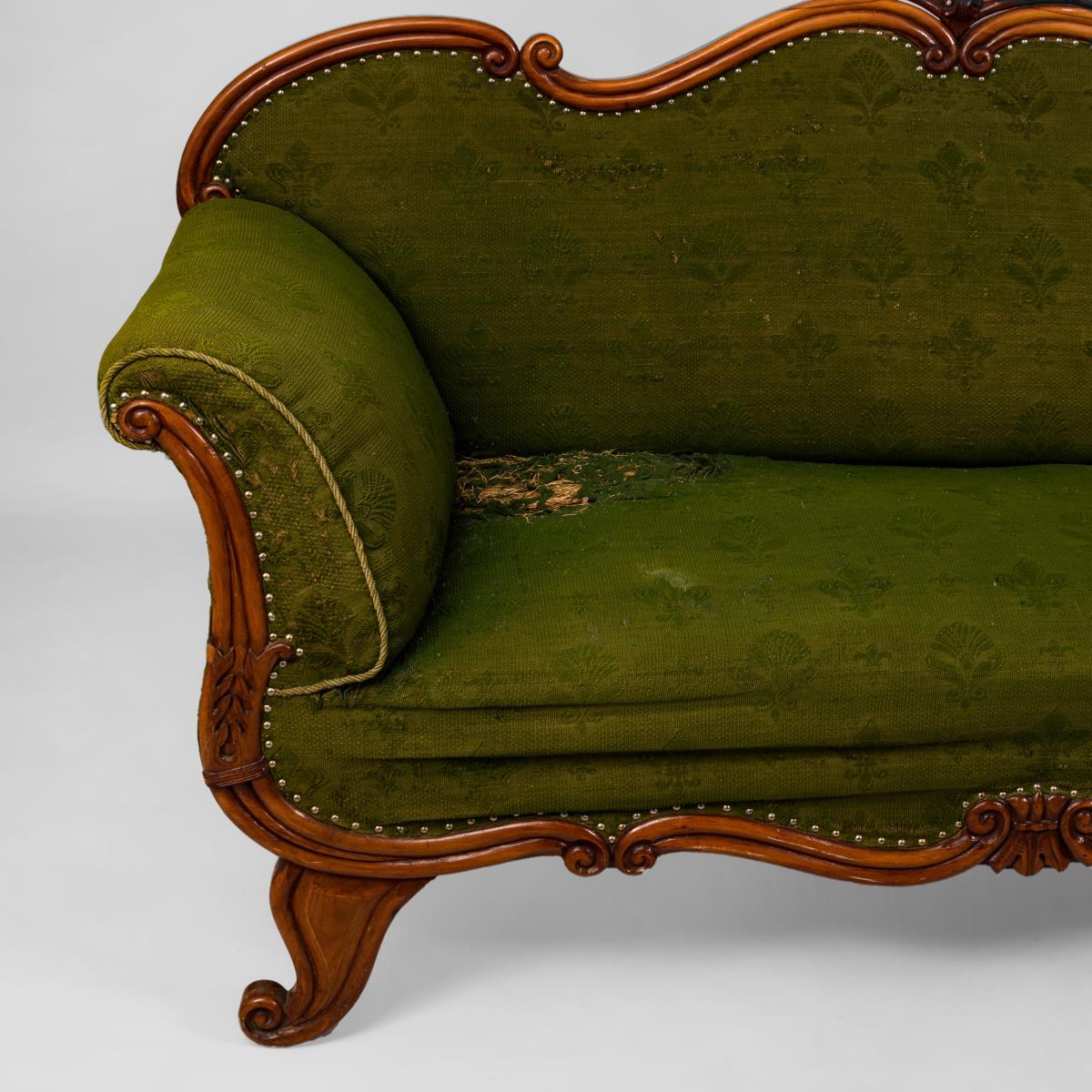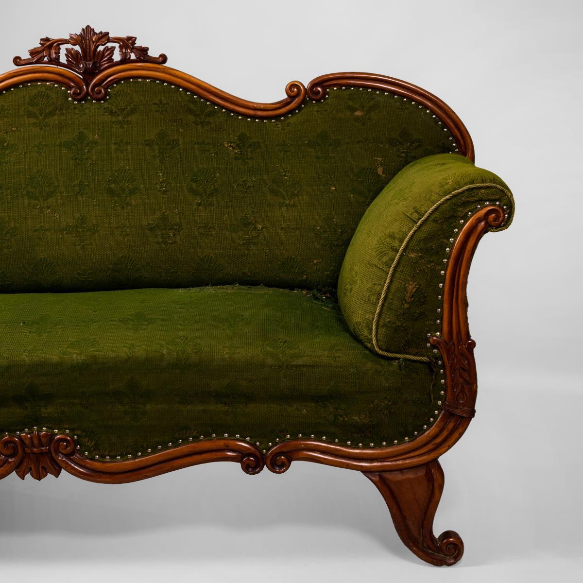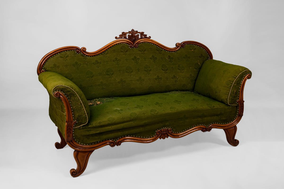 Geschwungener Korpus mit Volutenschnitzereien und Blattwerk-Bekrönung, auf Volutenfüßen; defekter grüner Bezug mit Ziernageldekor. Restaurierungsbedürftig.
