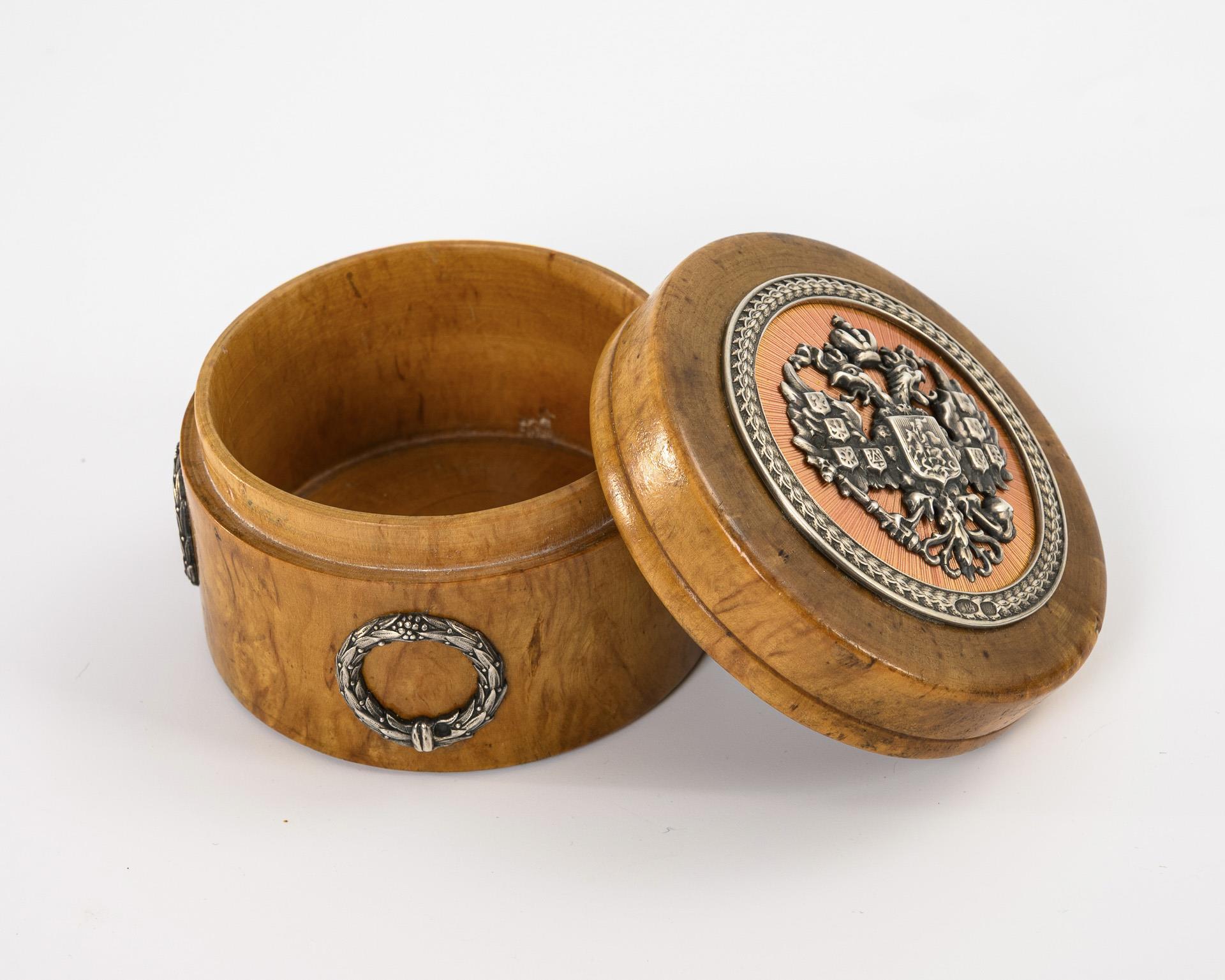 Zylinderförmig gedrechselte Dose. Auf dem Passdeckel der russische Doppeladler als Silberrelief über dem Kupfergrund mit farblosem Email auf der Strahlenguilloche sowie fein gravierter Silberfries als Rahmung. Auf der Dosenwandung vier je gepunzte Lorbeerkränze aus Silber.