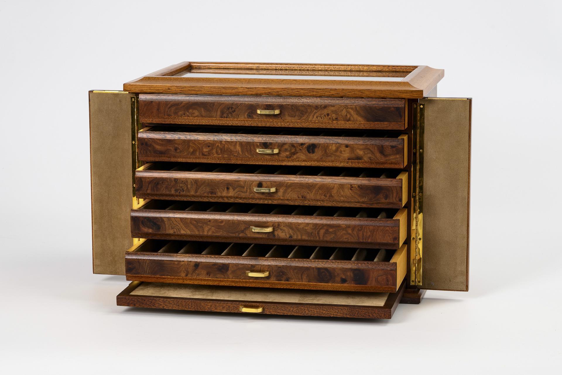 Auch als Schmuckkästchen oder für die Sammlung von Füllfederhaltern geeignete Schatulle mit quaderförmigem Korpus und verglaster Deckplatte zur Sicht in den obersten Schub sowie in der Schubfront seitliche Zuhaltungen je mit Schloss. 5 Schübe mit Messinggriffen und länglichen Fachungen; zuunterst eine herausziehbare gepolsterte Arbeitsplatte.