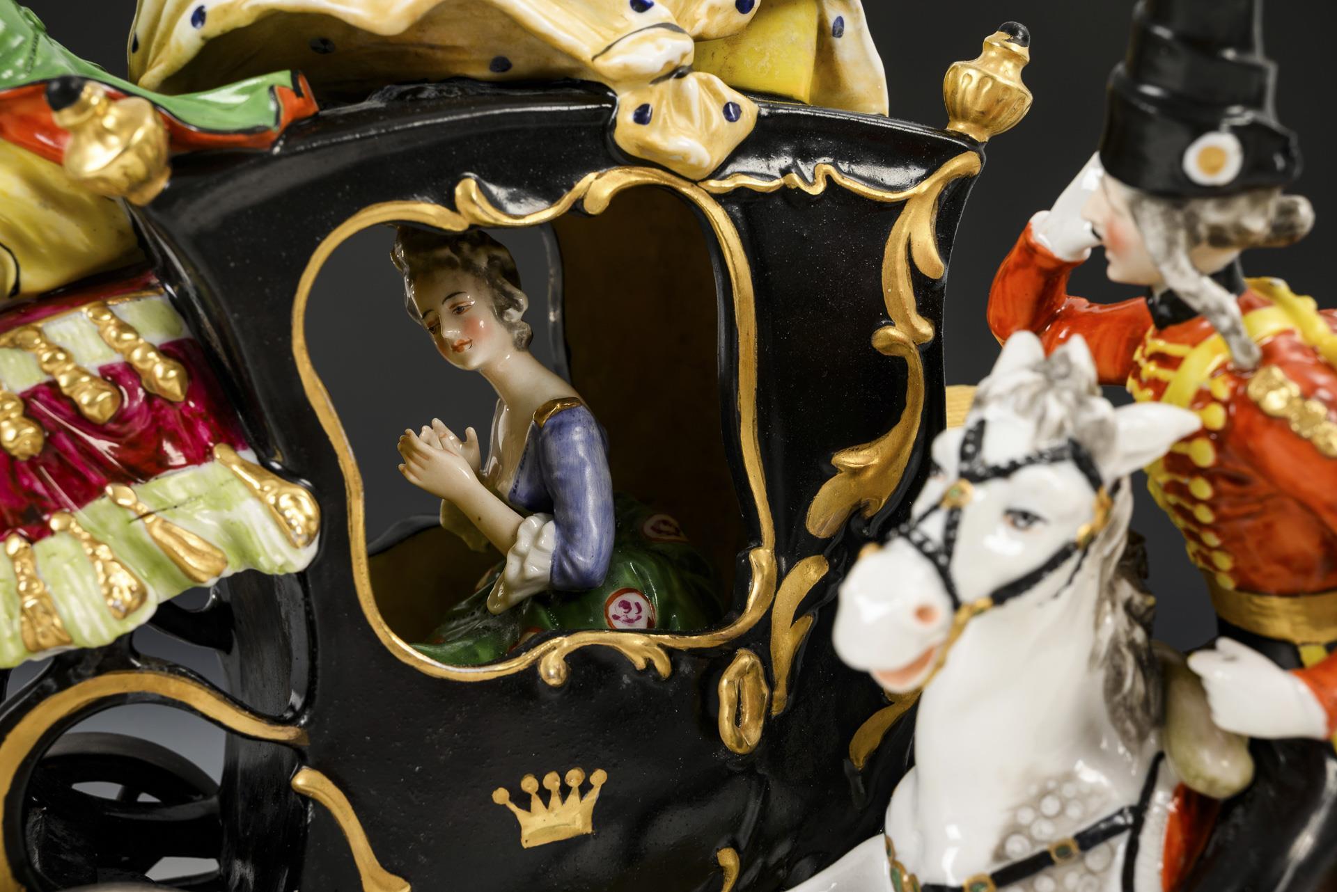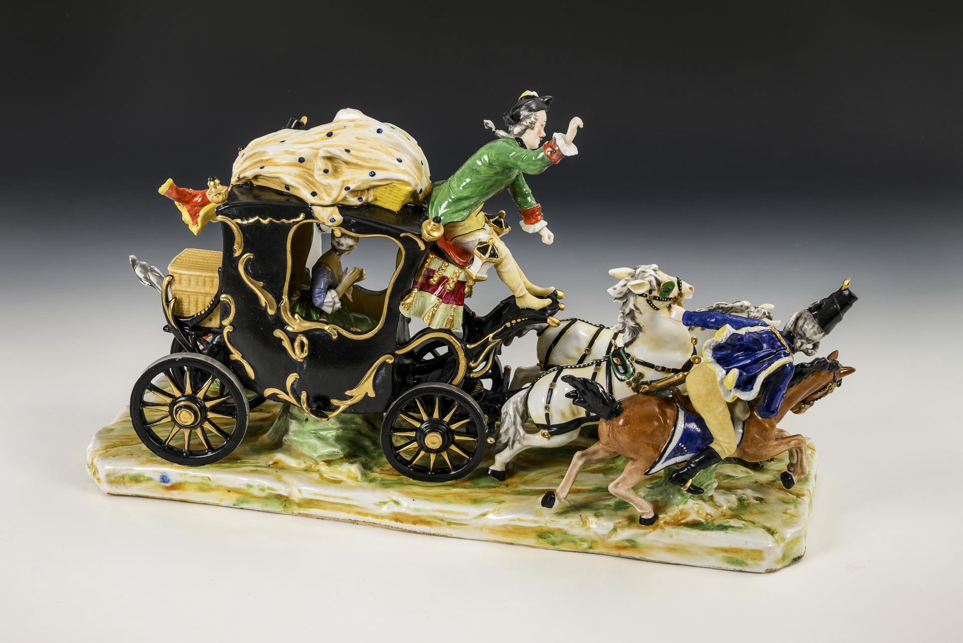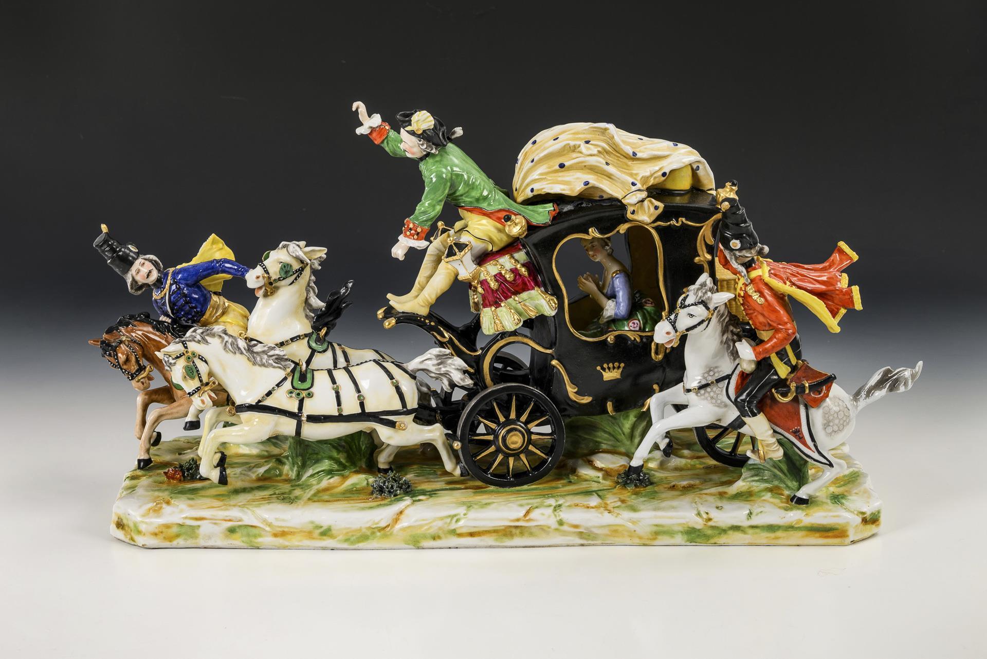 Zweispännige Kutsche mit galoppierenden Pferden, die Pferde antreibendem Kutscher und zwei Begleitsoldaten, in der Kutsche die Gräfin Cosel sitzend. 1 Schweife, 4 Pferdebeine, 2 Pferdeohren und 1 Scheuklappe restauriert.