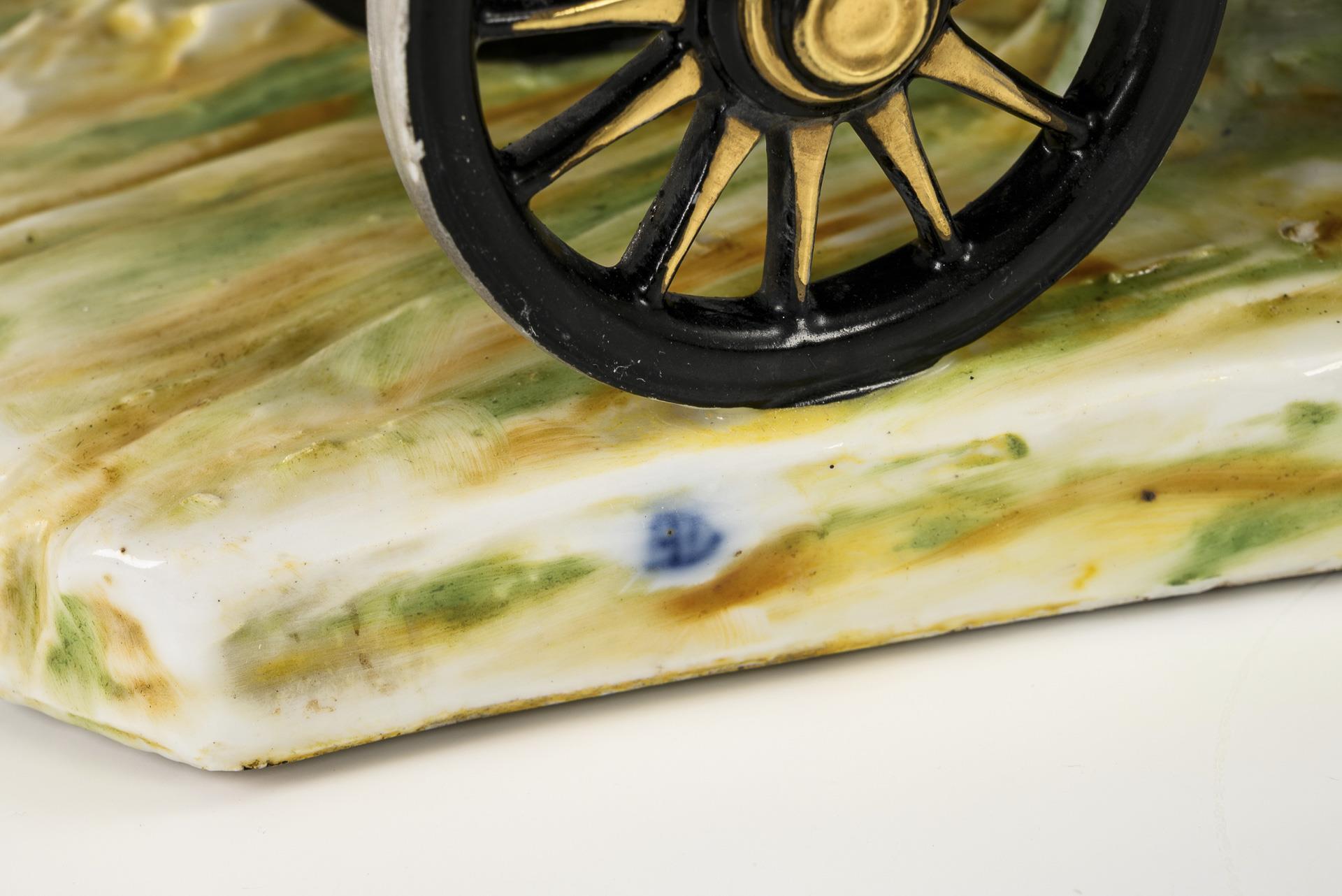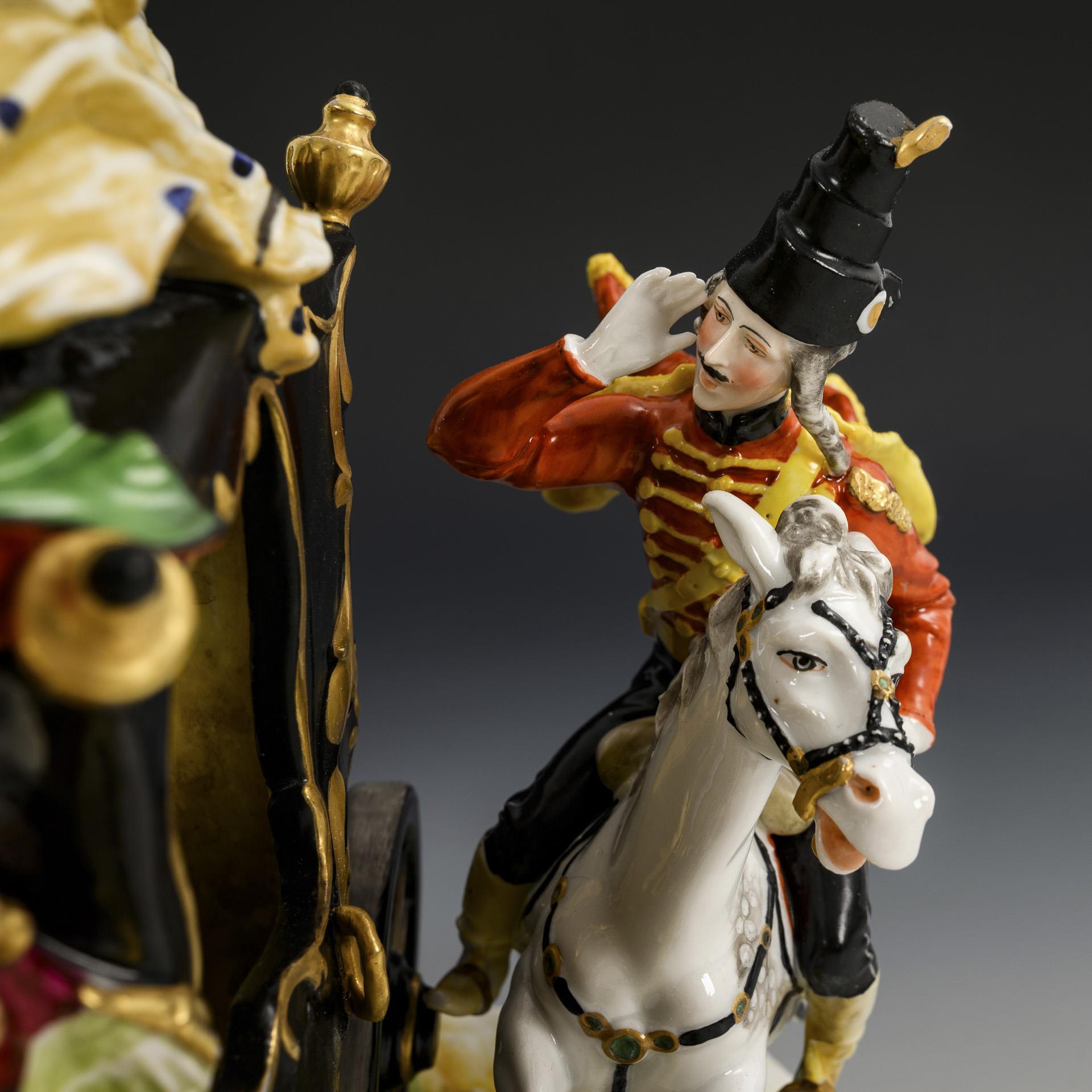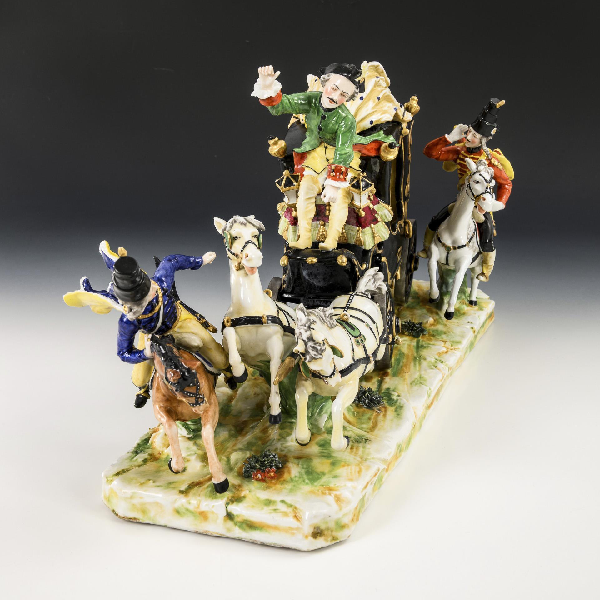 Zweispännige Kutsche mit galoppierenden Pferden, die Pferde antreibendem Kutscher und zwei Begleitsoldaten, in der Kutsche die Gräfin Cosel sitzend. 1 Schweife, 4 Pferdebeine, 2 Pferdeohren und 1 Scheuklappe restauriert.