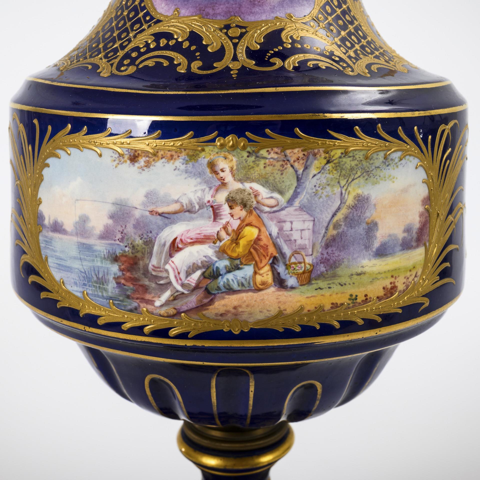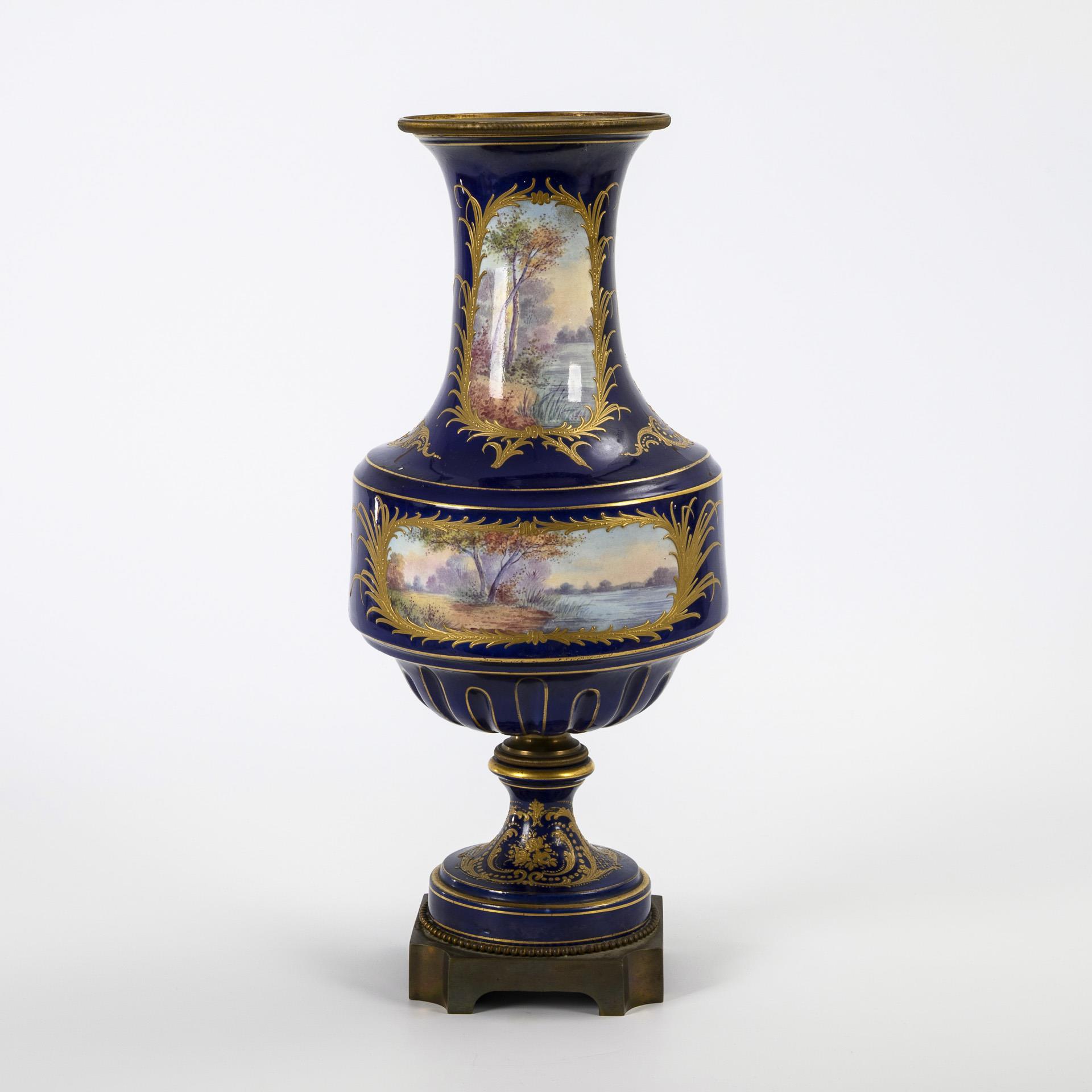 Zylinderkorpus mit eingezogenem, godroniertem Ansatz, konkavem Hals und Rundfuß. Bronzemontierung an Fuß, Hals und Korpus-Fuß-Verbindung. Königsblauer Fond mit Figuren- und Landschaftsdarstellungen in reliefgoldgerahmten Kartuschen.