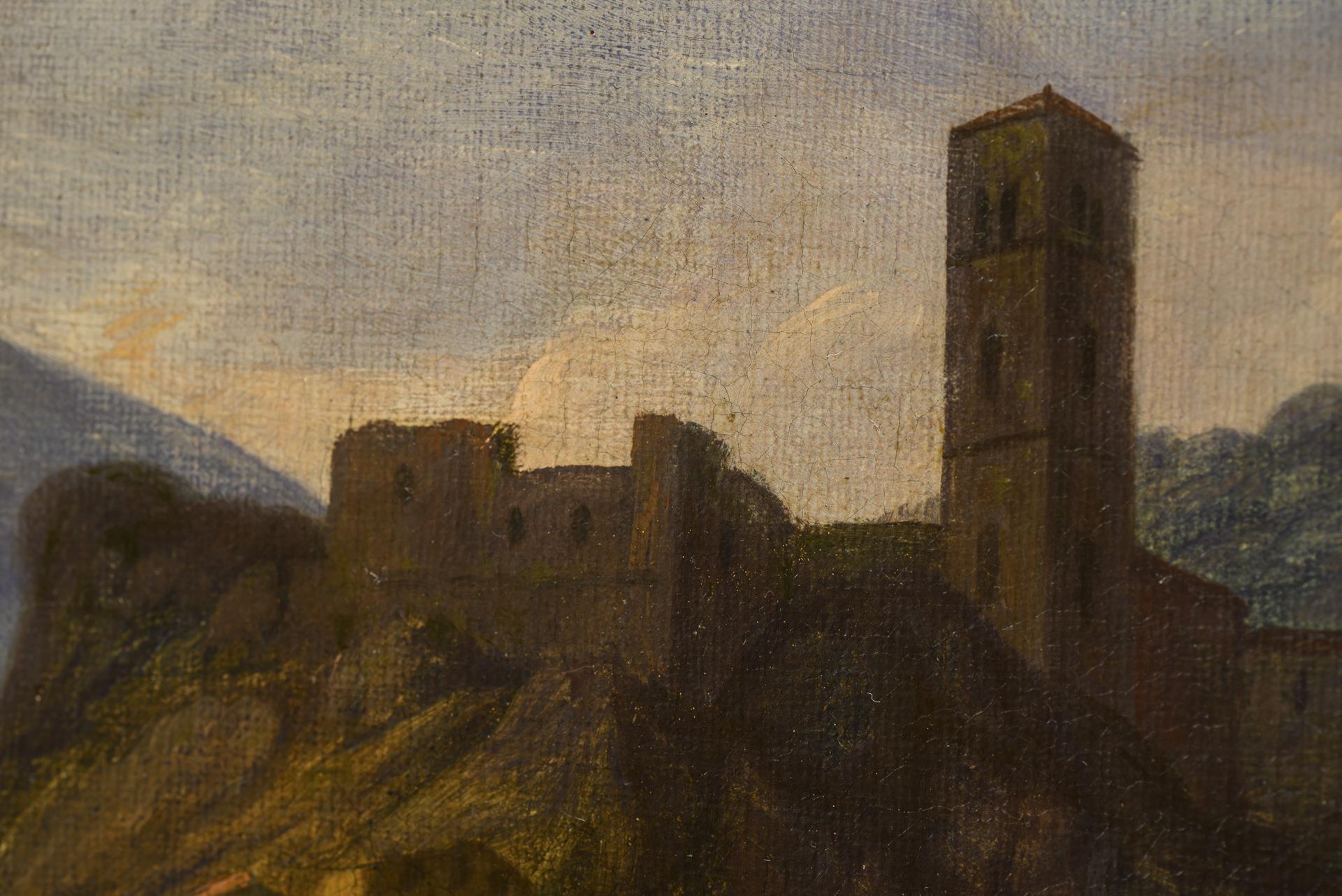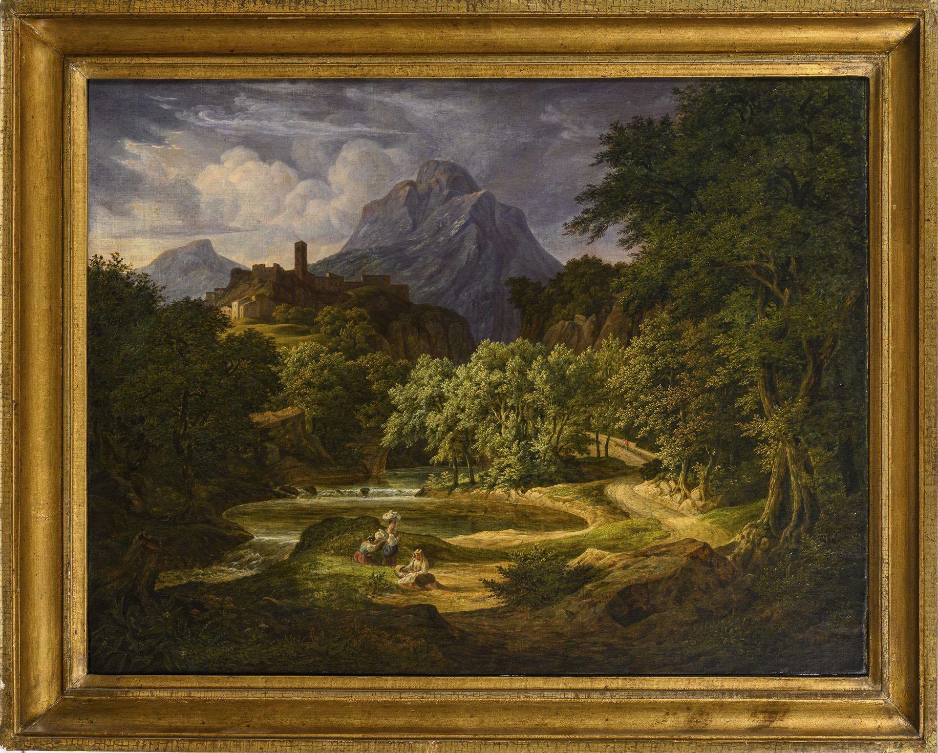 Staffagefiguren an einem Fluss am Waldrand nahe der Stadt auf dem Berg vor den Gipfeln unter wolkigem Himmel. Leichte Altersspuren.