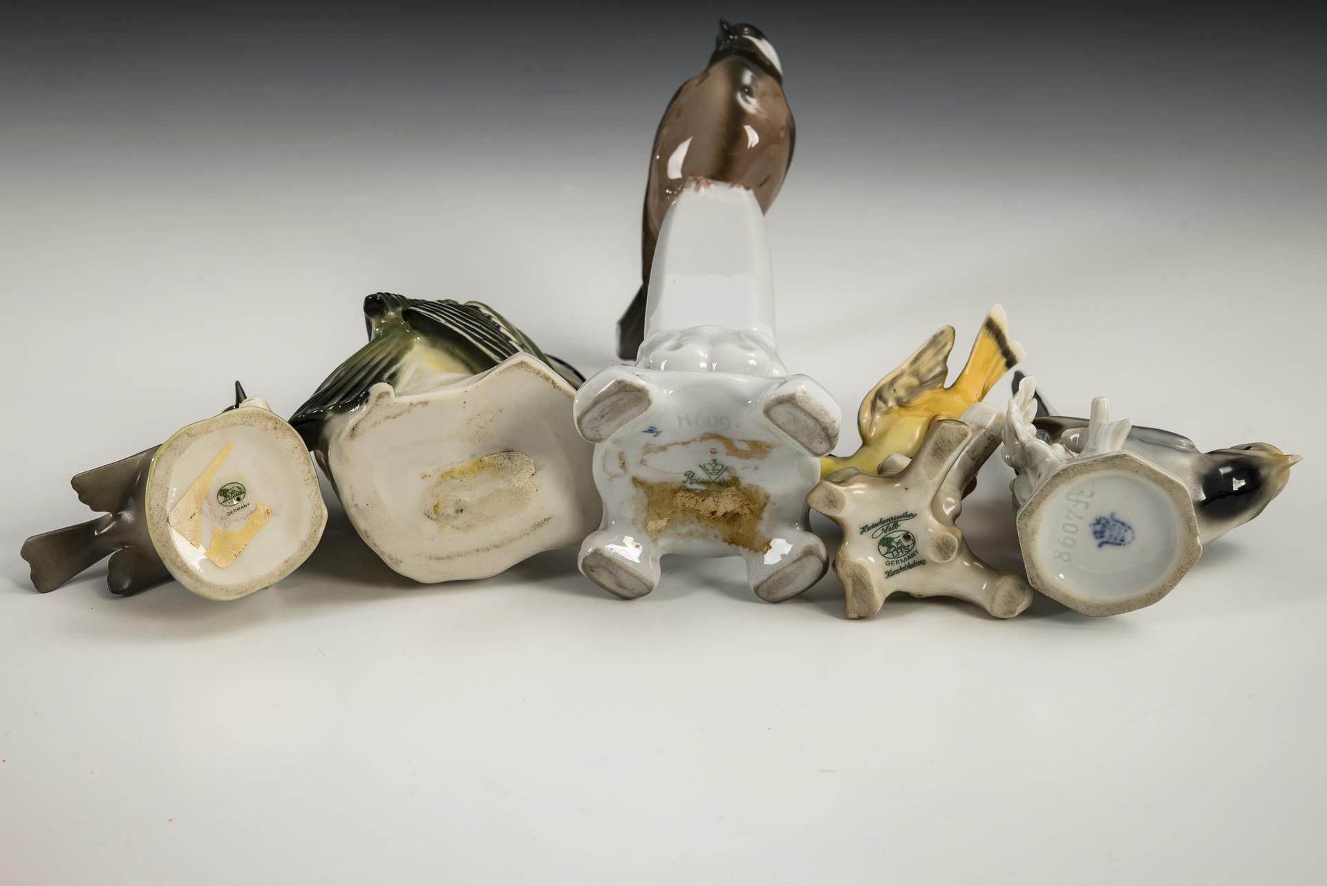 1x ROSENTHAL: Meise auf Postament (H 18 cm). / 2x HUTSCHENREUTHER: Kleiber und Haubenmeise (H 9 und 7,5 cm). / 1x UNTERWEISSBACH: Schwanzmeise (H 11 cm). / 1x ungemarkt: Kohlmeise (H 10 cm). 1 Meisenschwanz bestoßen, Schwanz des Kleibers minimal bestoßen.