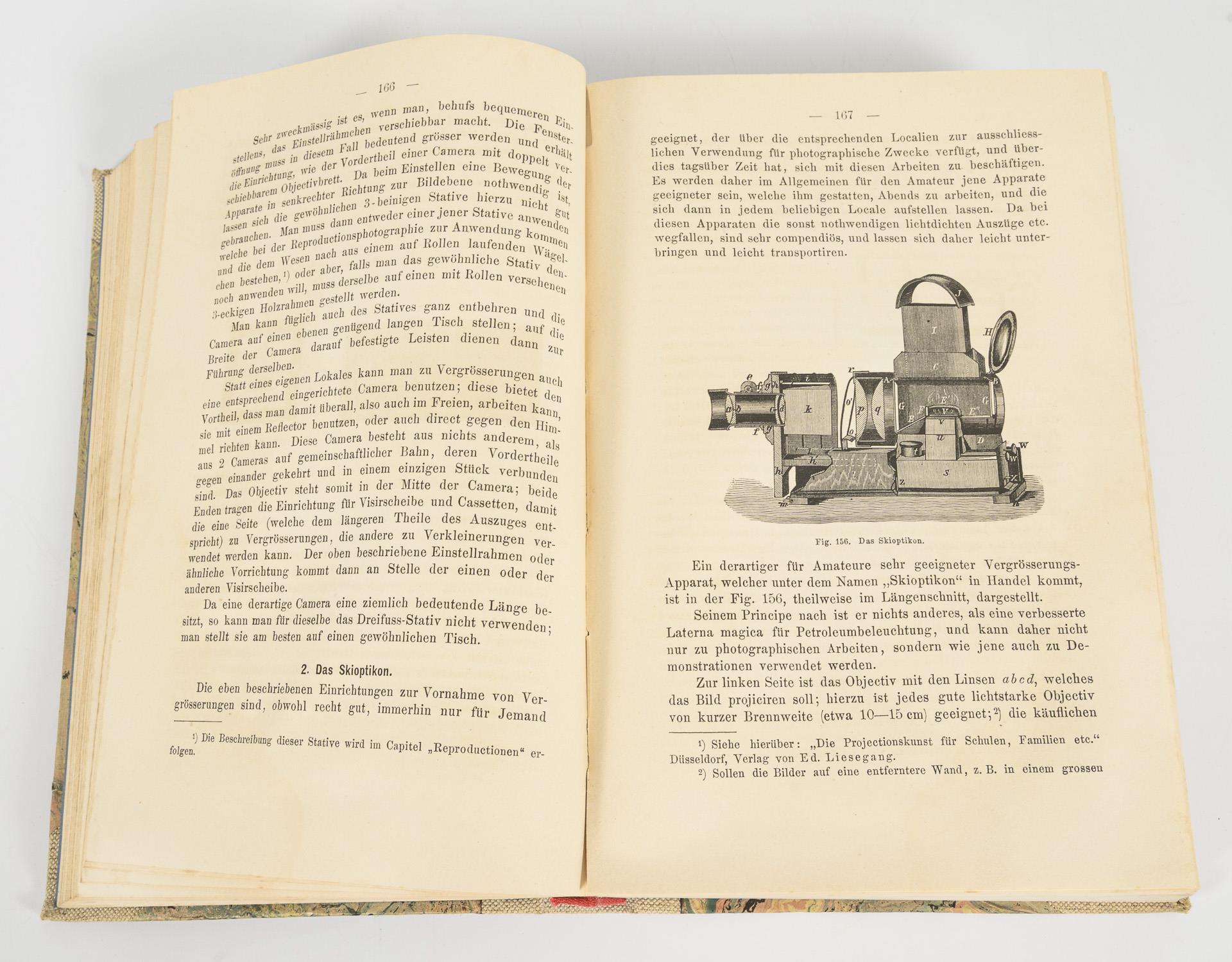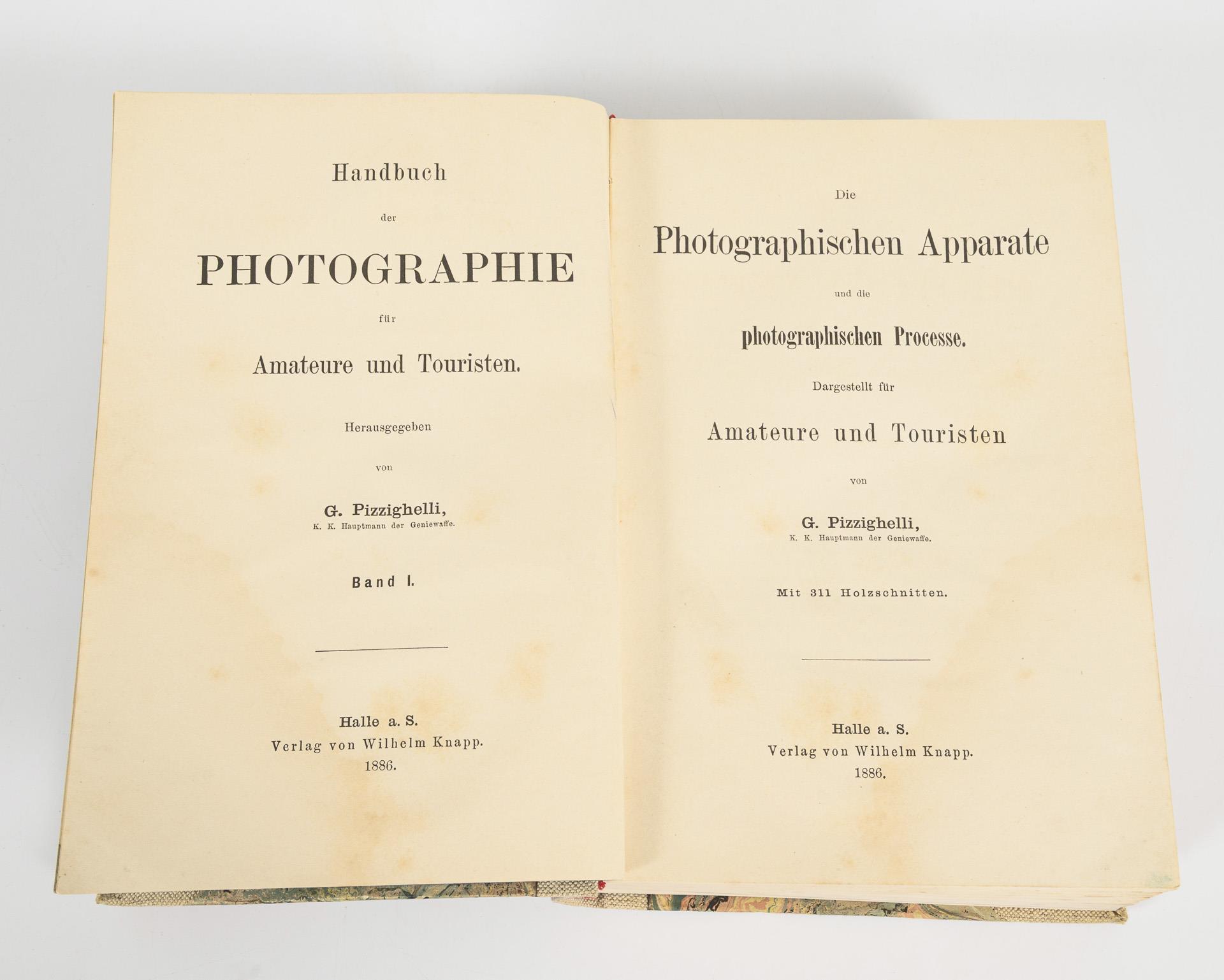 Pizzighelli: "Handbuch der Photographie für Amateure und Touristen", Halle 1886, Verlag von Wilhelm Knapp. Band 1 und 2 in einem jünger gebundenen Buch. 436 und 355 Seiten, mit zahlreichen Illustrationen. 23,5 x 15,5 cm. / Dazu "F. Matthies-Masuren: "Künstlerische Photographie" aus der Reihe "Die Kunst" von Richard Muther. Einleitung von Alfred Lichtwark. 117 Seiten und Abbildungen, im Pappeinband, 16,5 x 12 cm.