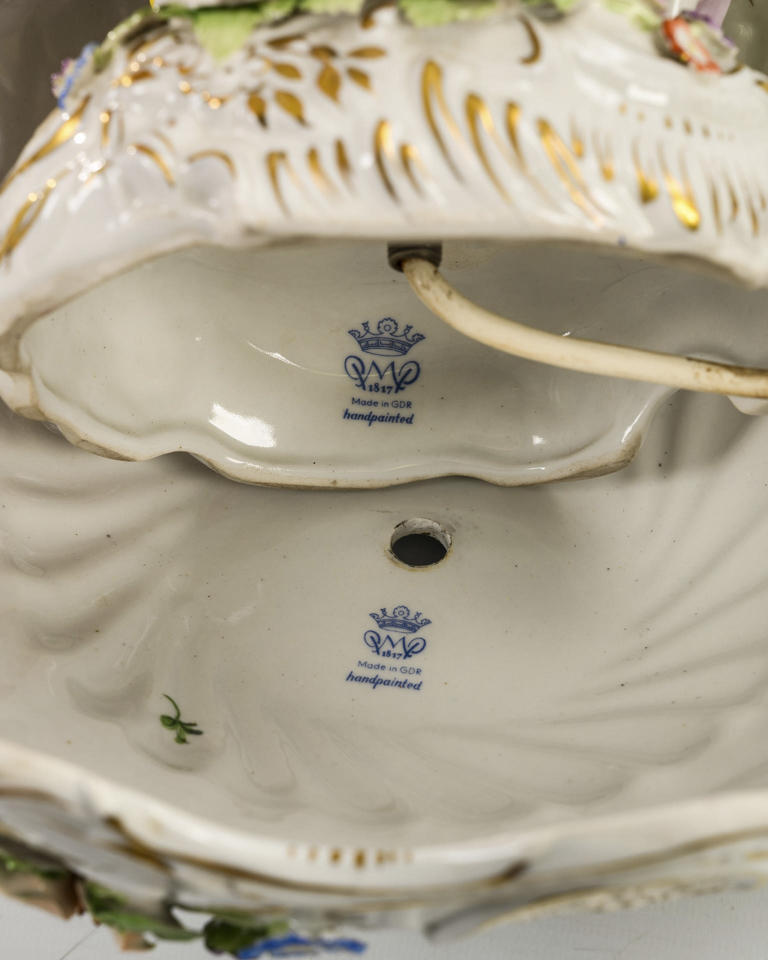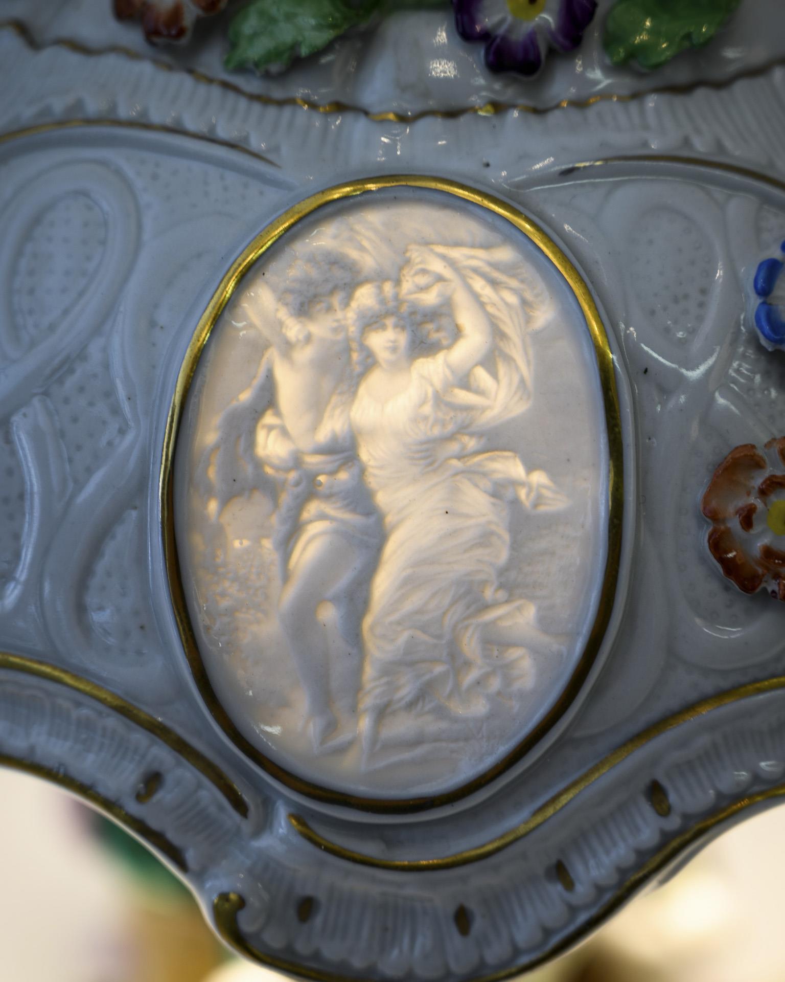 Zwei um einen Baumstammschaft tanzende Kinderpaare, reliefierter und blütenbelegter Lampenschirm mit 4 Lithophaniebildern. Elektrifiziert. Partiell Bestoßungen am Belag.