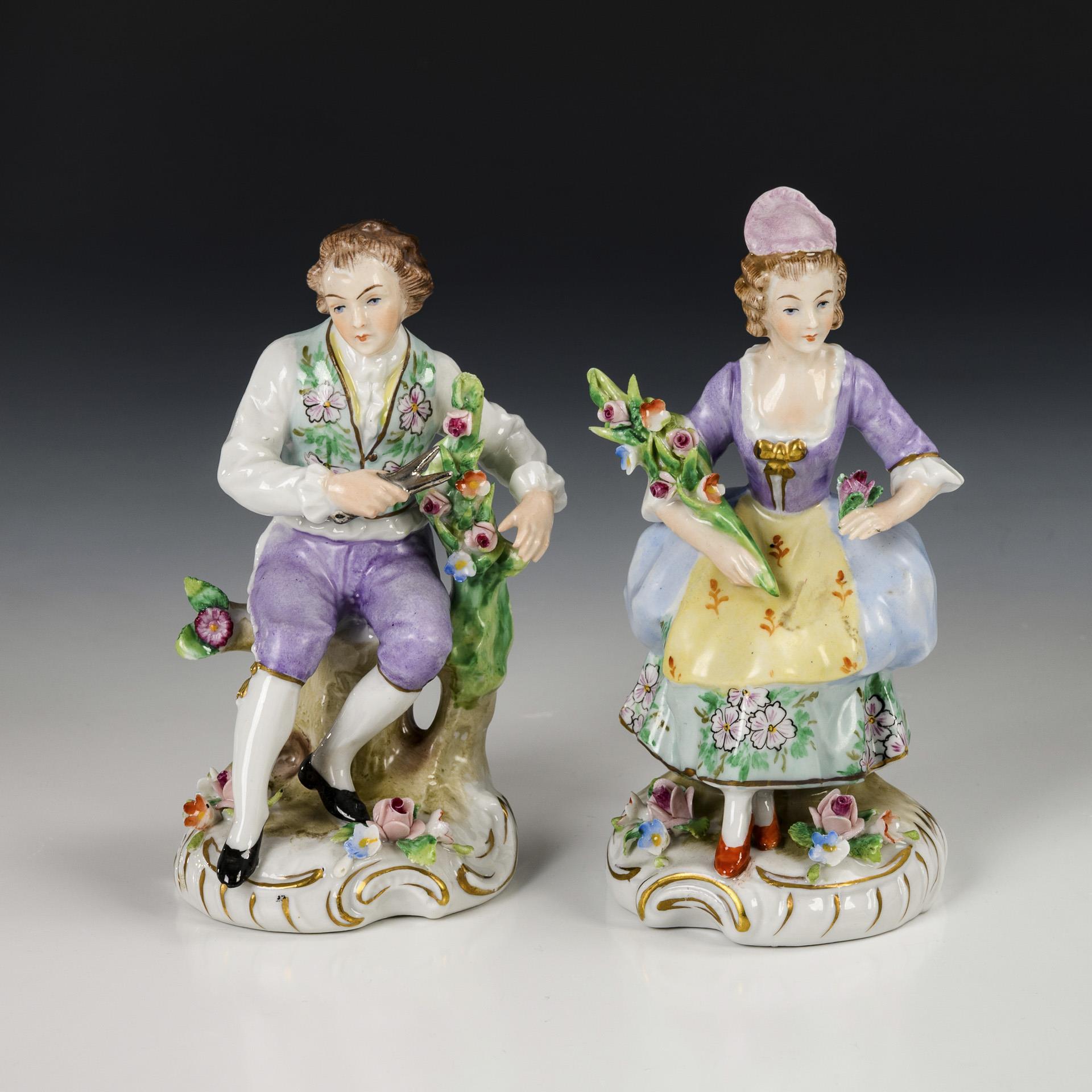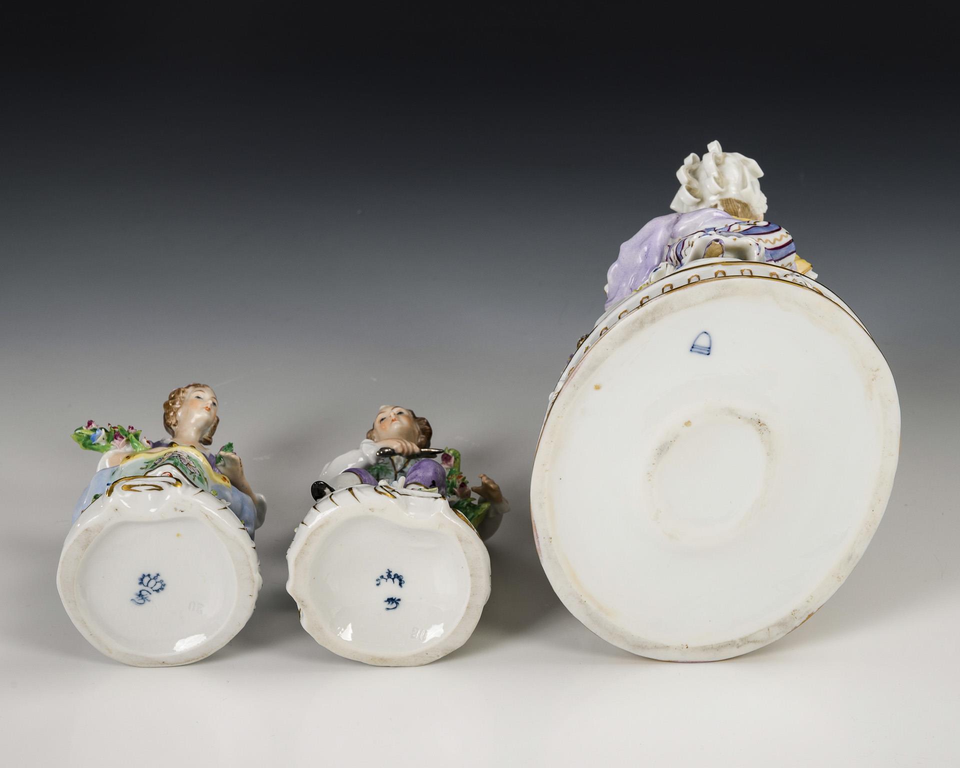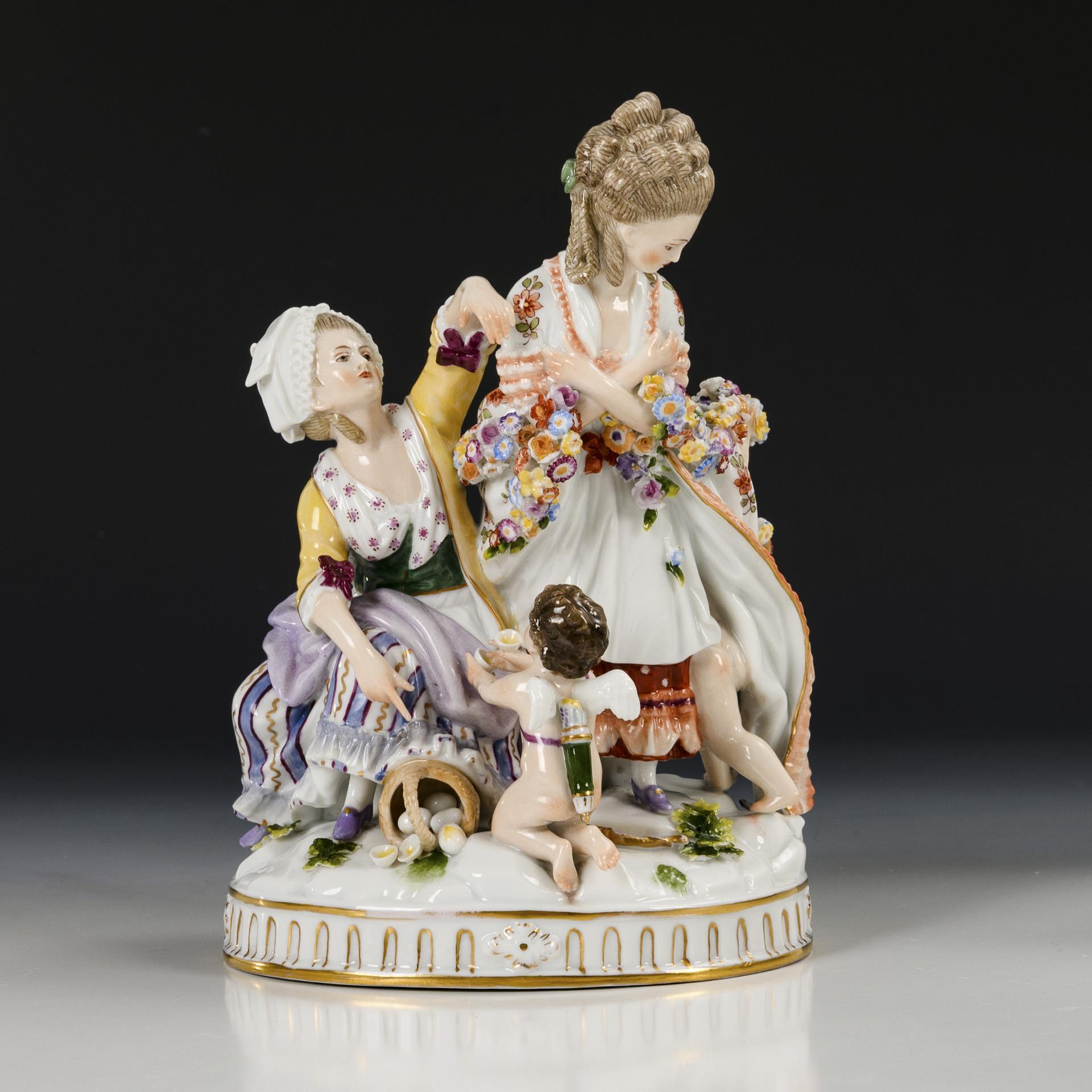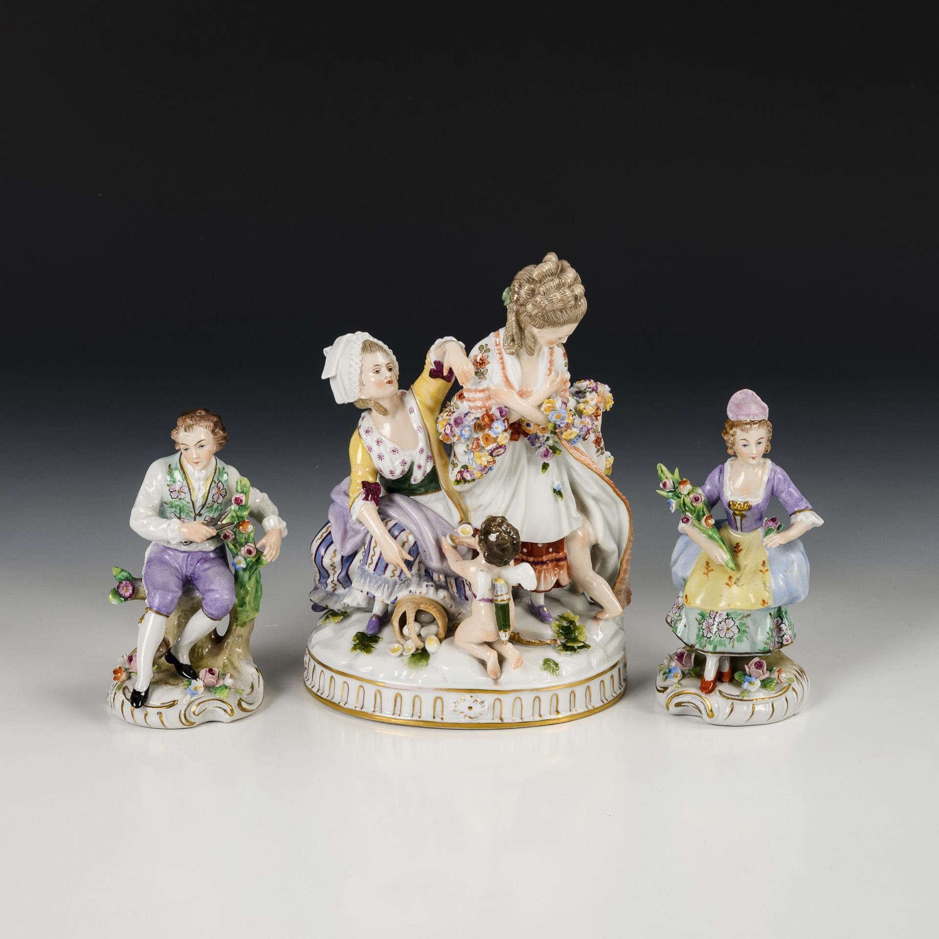 1x imitierte Bindenschildmarke: Gruppe einer Rokokodame mit Blumengirlande und 2 Amorknaben sowie einer Magd, auf einen Korb mit zerbrochenen Eiern zeigend (H 18,5 cm). / 2x Sitzendorf: auf einem Baumstumpf sitzende Gärtnerin mit Rosenstrauß bzw. Gärtner mit Gartenschere (H 12 und 12,5 cm). Partiell Blüten und Blätter minimal bestoßen.
