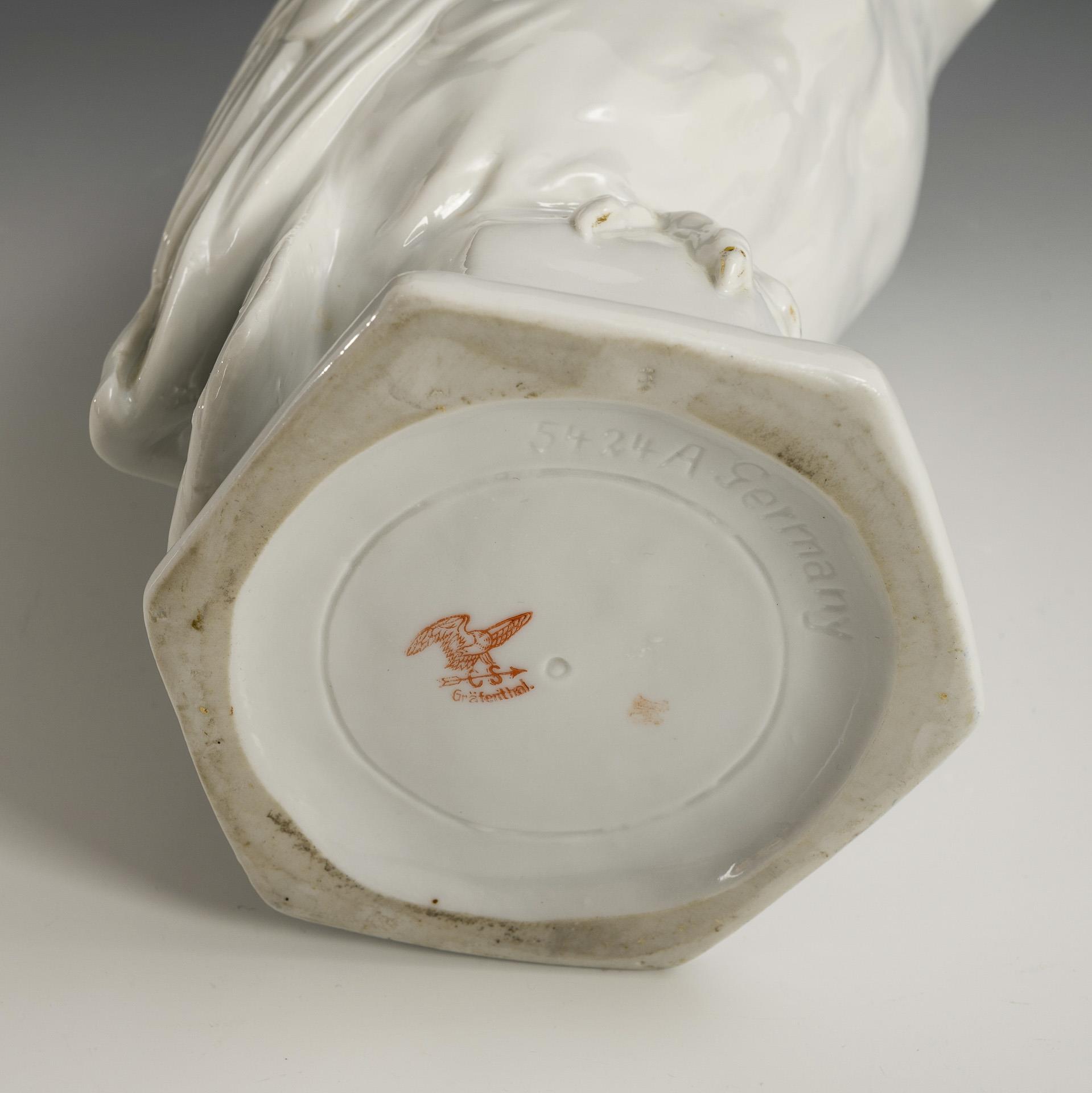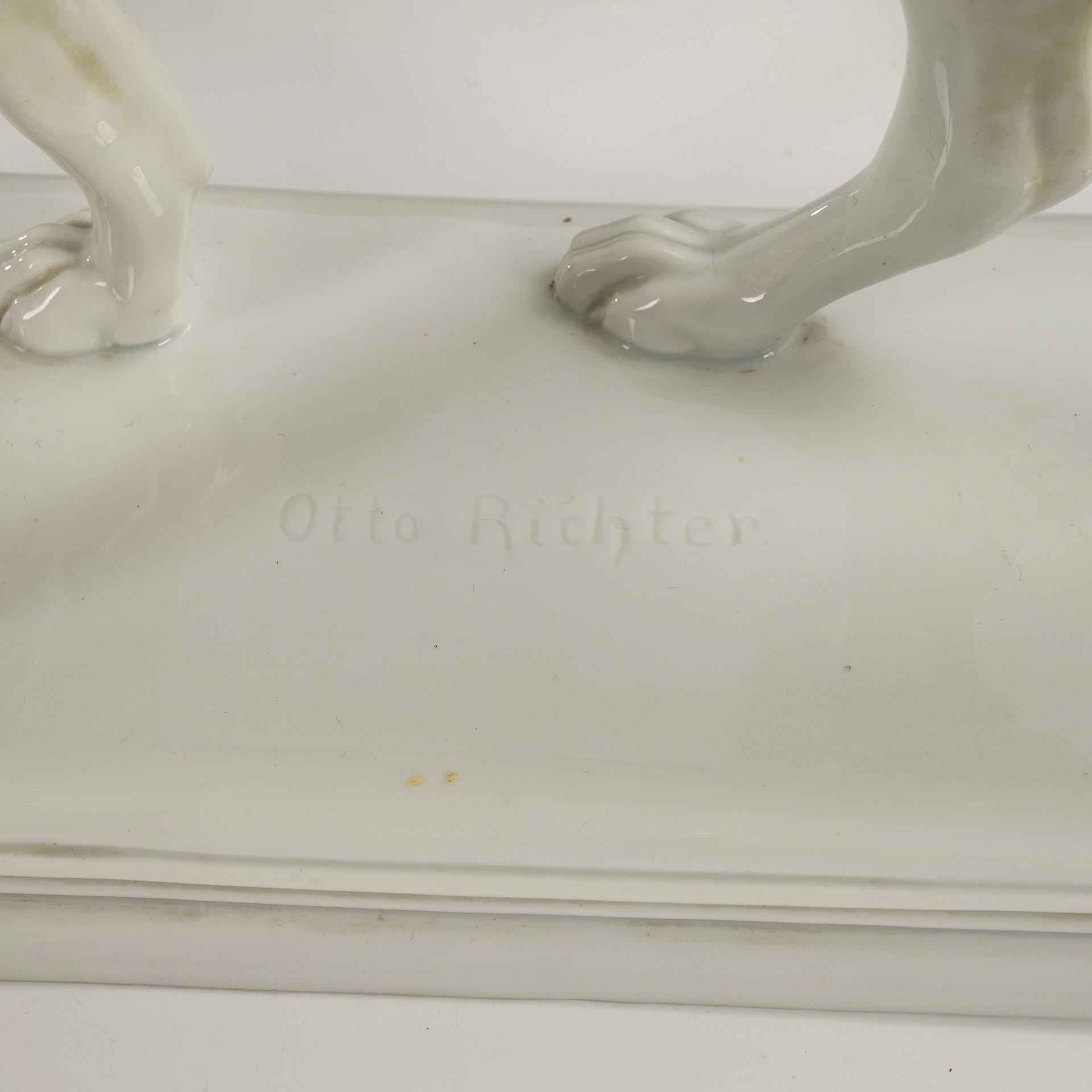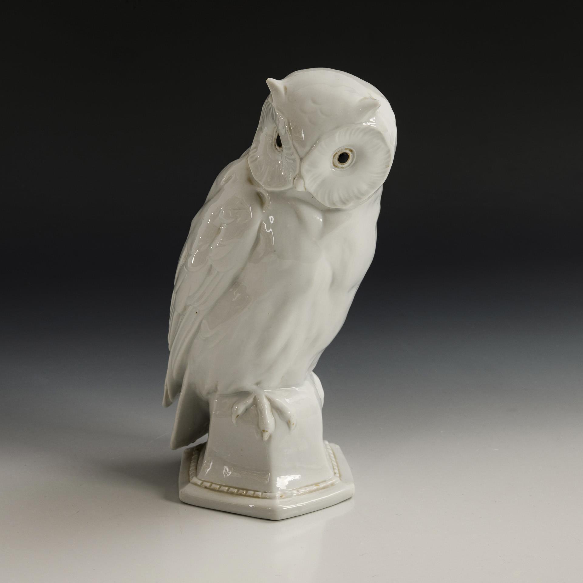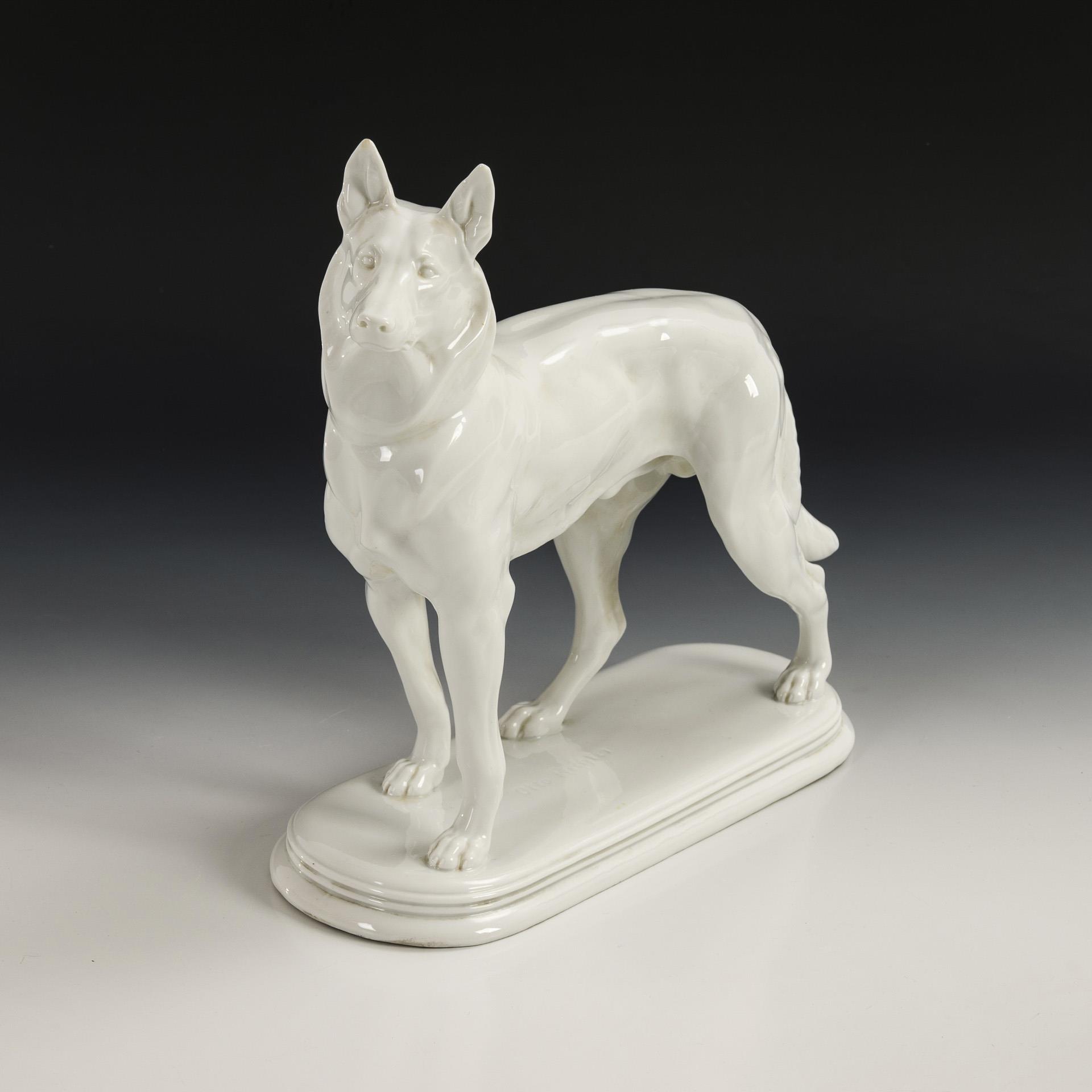 1x FRAUREUTH, um 1920, Entwurf von Otto Richter (1867-1941): stehender Schäferhund. / 1x GRÄFENTHAL, ab 1906, Modell-Nr. 5424: auf einem sechseckigen Sockel sitzende Eule. Rechte Ohrspitze der Eule und linke Ohrspitze des Hundes minimal bestoßen.