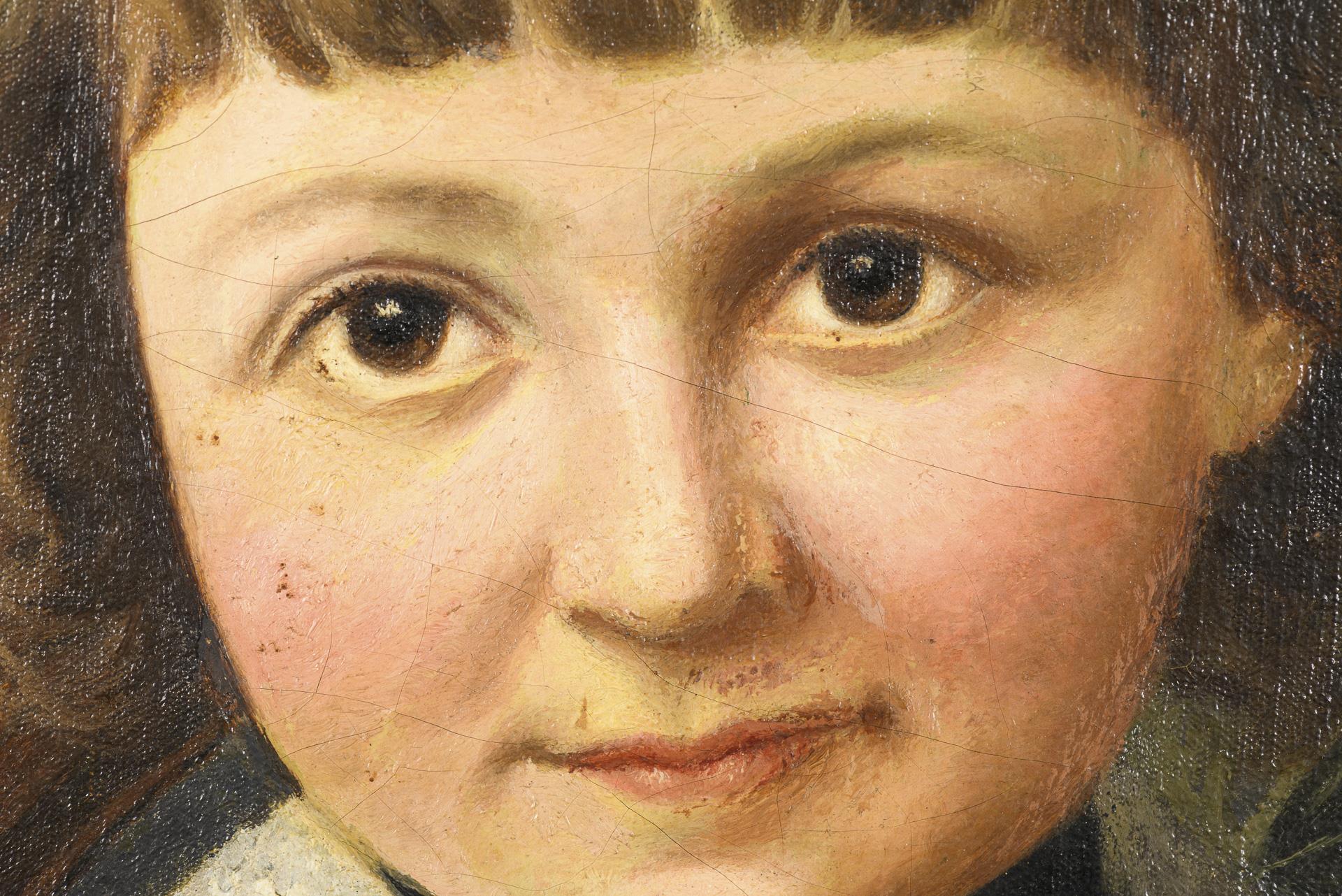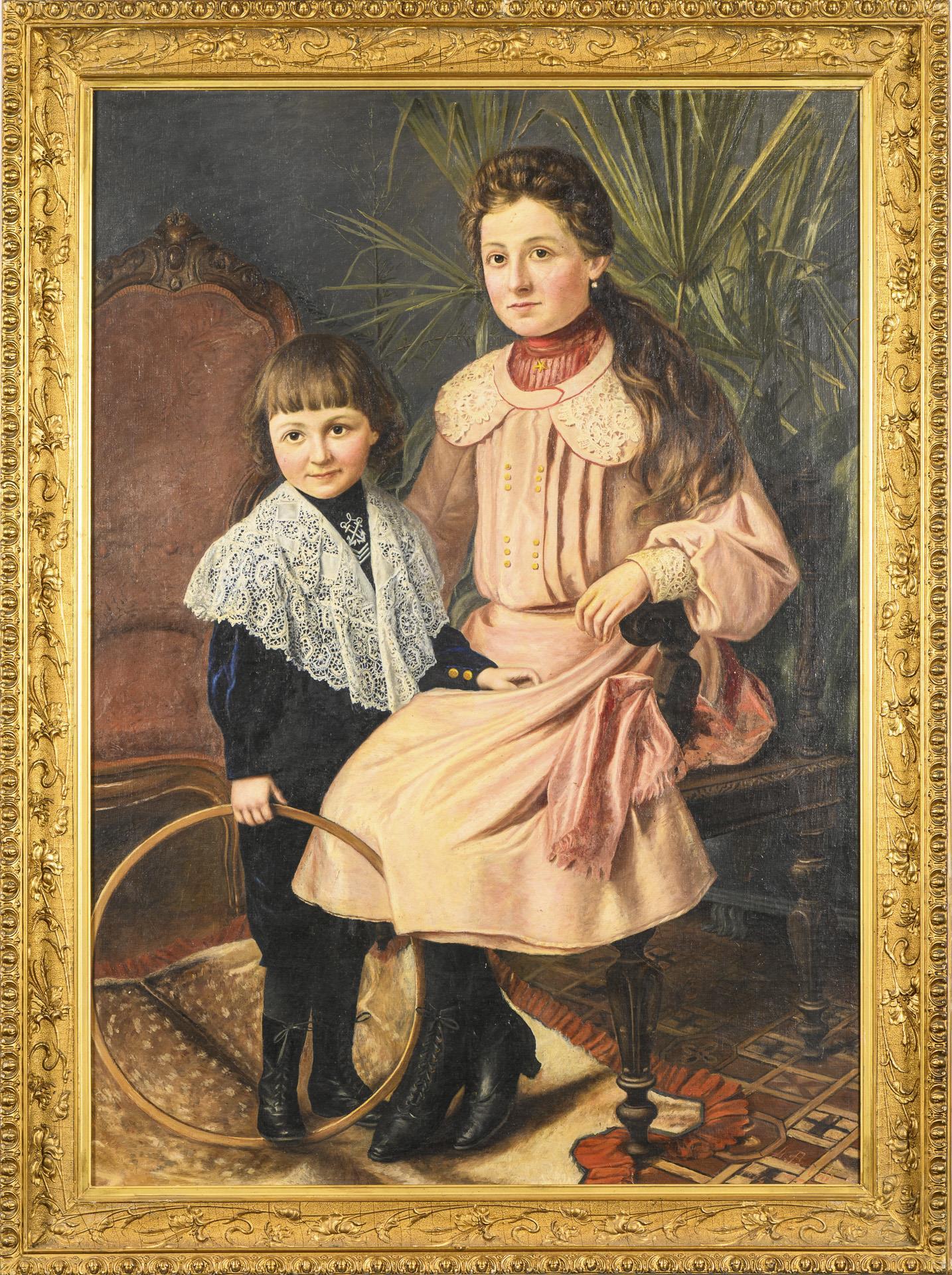 Porträt des im Armlehnstuhl sitzenden Mädchens mit dem jüngeren Bruder in dunkelblauem Anzug und mit Spielreifen daneben. Altersspuren.