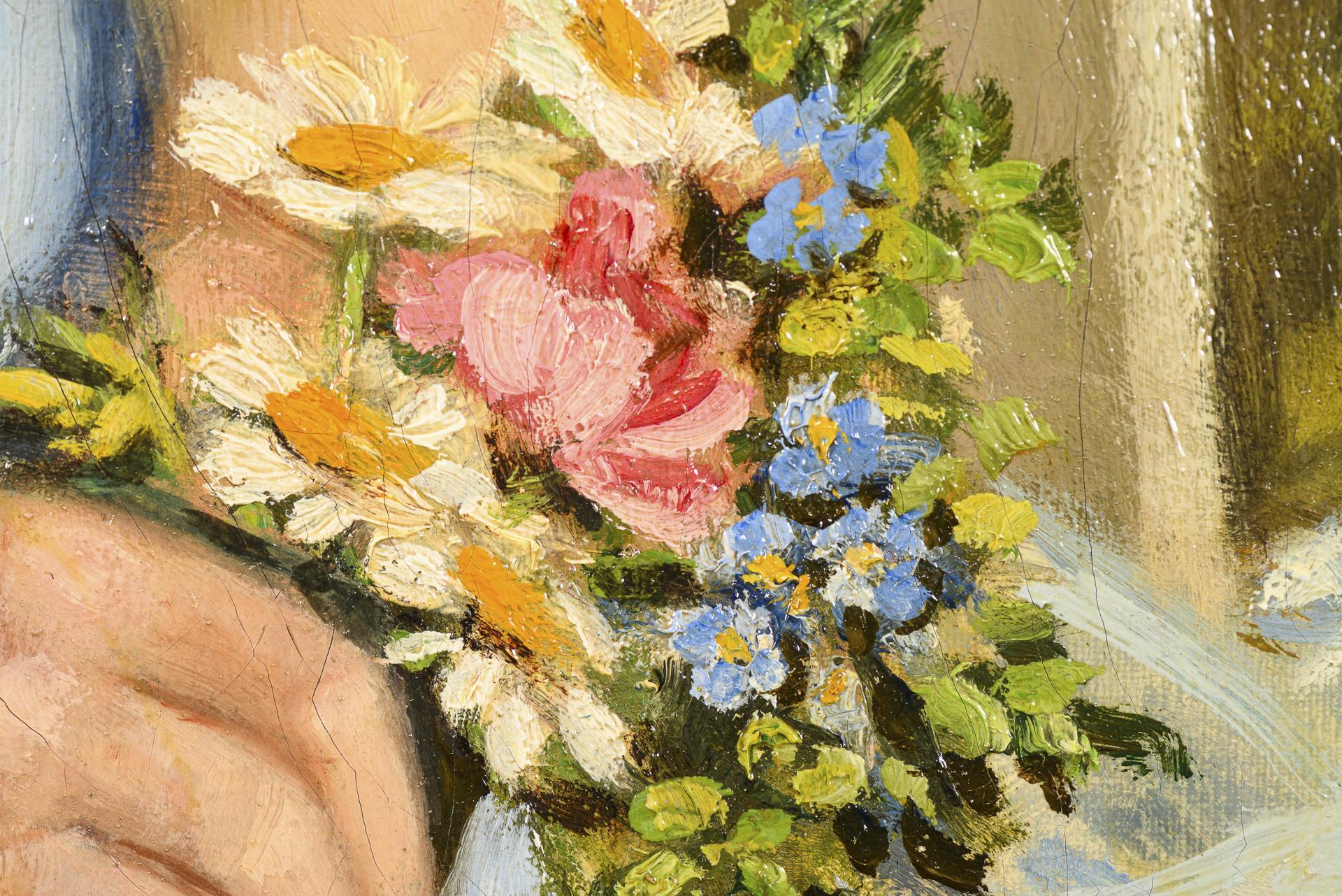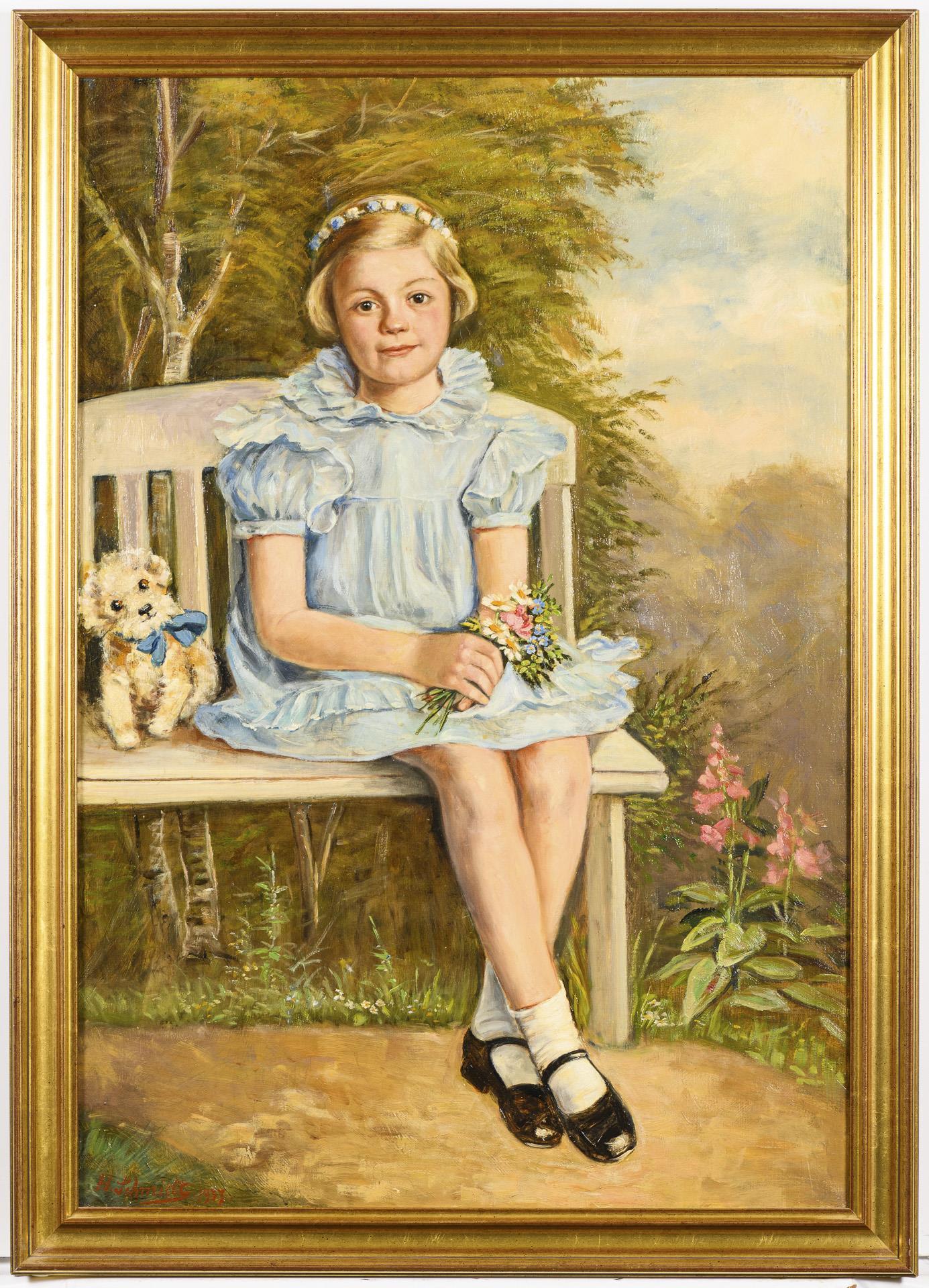 Porträt eines Mädchens im blauen Kleid mit Blumen und einem Plüschhund auf einer Bank. Kleine restaurierte Stellen.