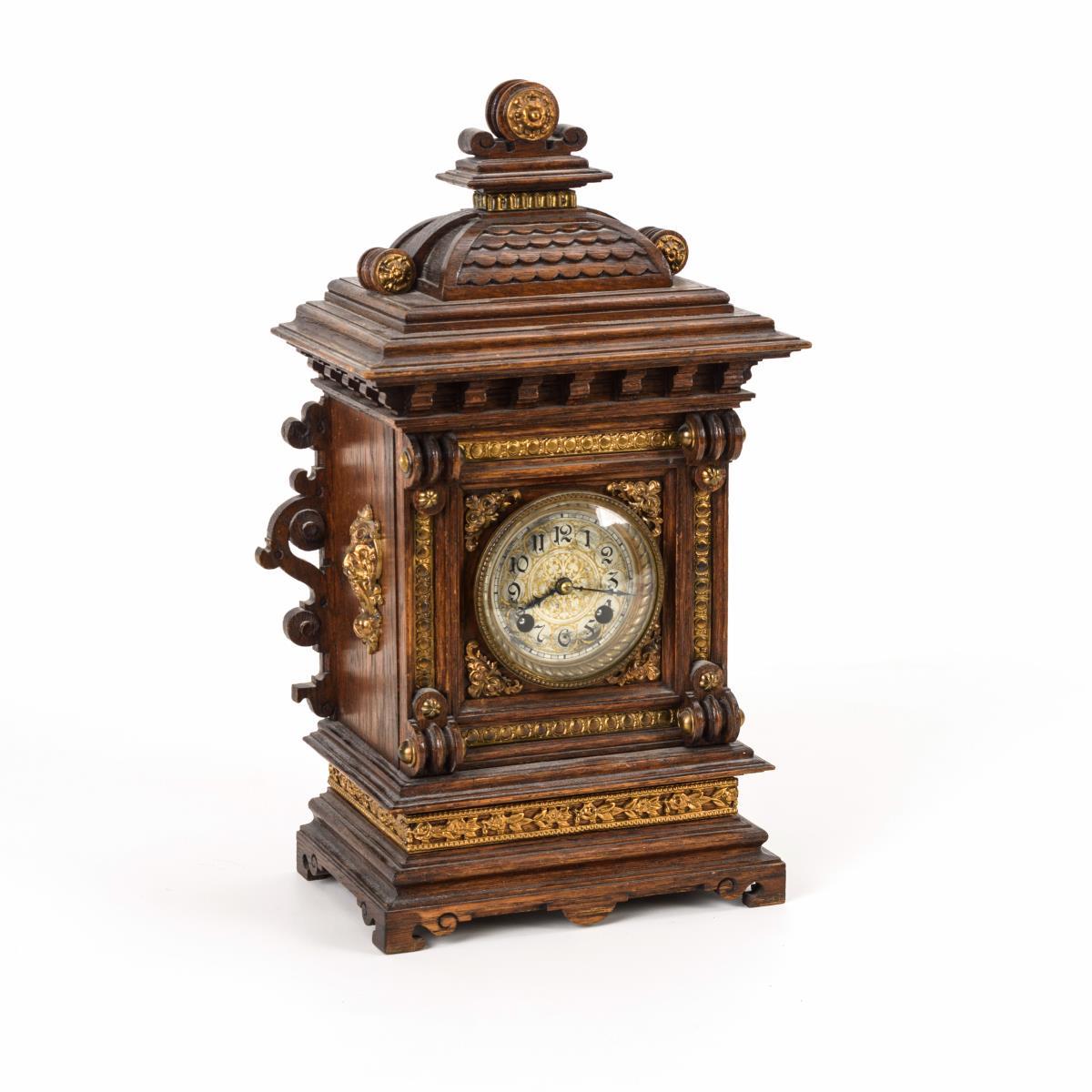 Eiche, Messing. Uhr 38 x 23 x 13 cm, Konsole 24,5 x 38,5 x 20,5 cm.
