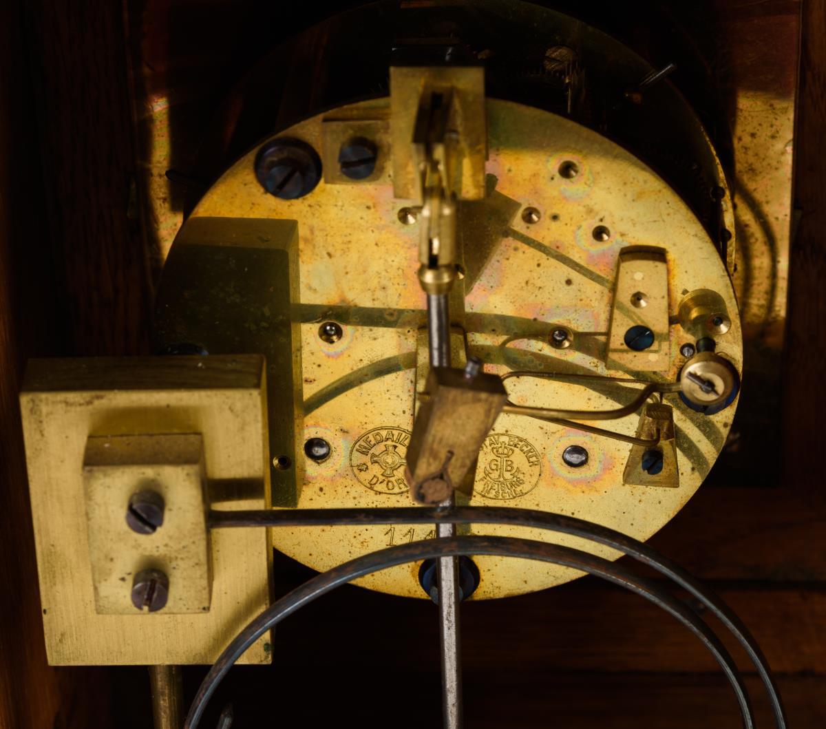 Werknummer: 1110976. Werk mit Halbstundenschlag auf Rundgong. Herstellerprägung Werk: Gustav Becker. Verglastes, versilbertes Zifferblatt mit arabischen Zahlen, Minuterie und Fuseaux-Zeigern.